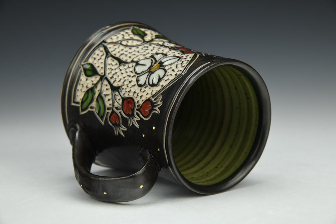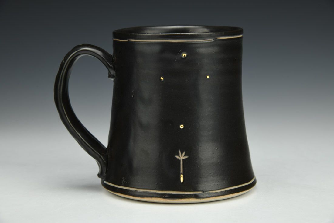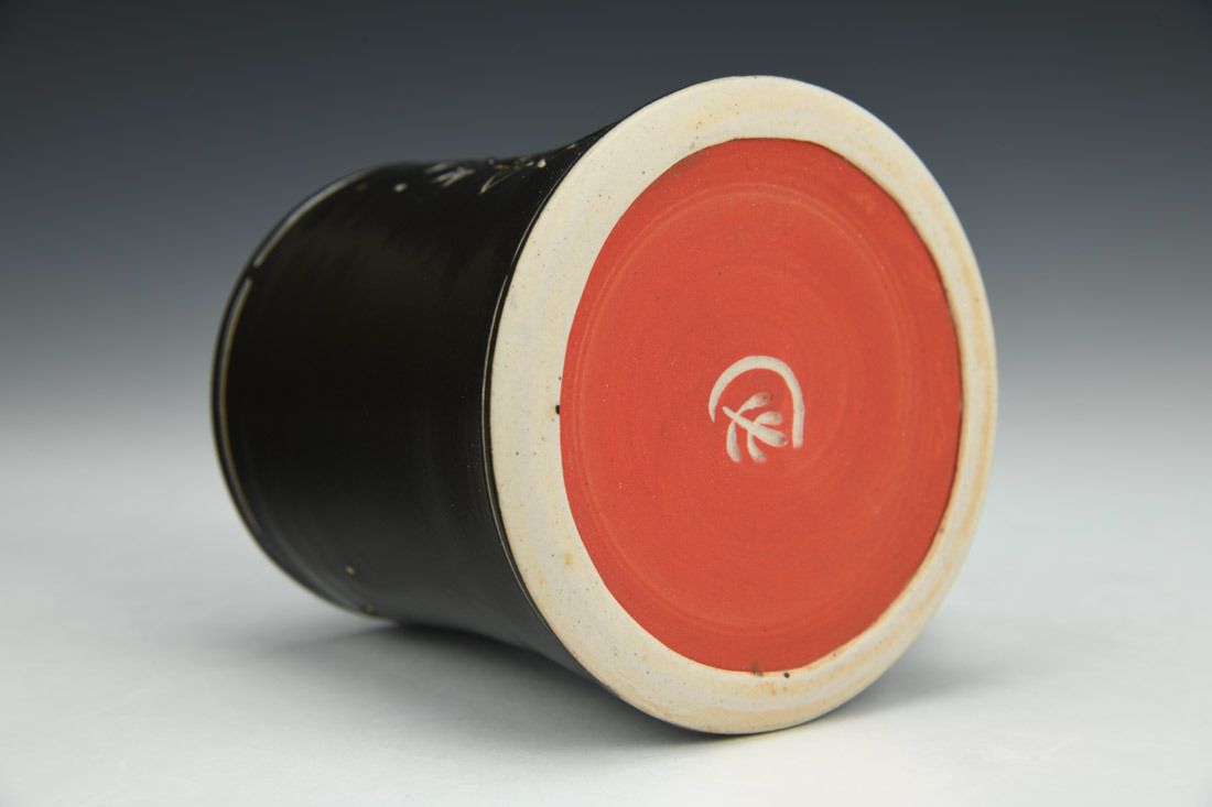 Stoneware, wheel thrown, slip, sgraffito, glaze inlay, gold luster, cone 10 gas reduction fired, 4 x 4.5 x 3.75 inches.