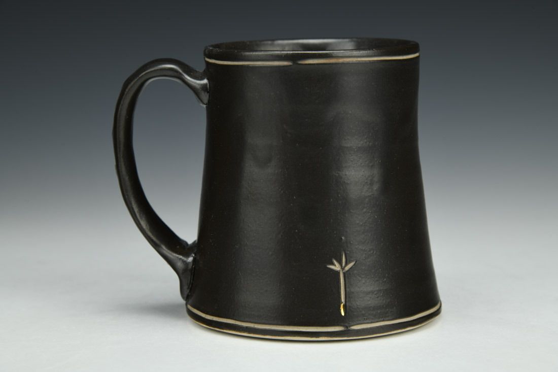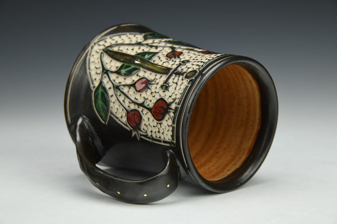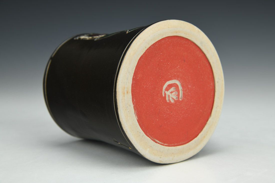 Stoneware, wheel thrown, slip, sgraffito, glaze inlay, gold luster, cone 10 gas reduction fired, 3.75 x 4.5 x 3.5 inches.