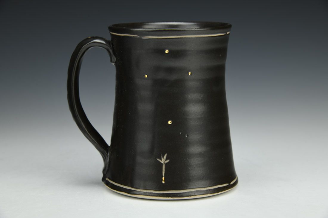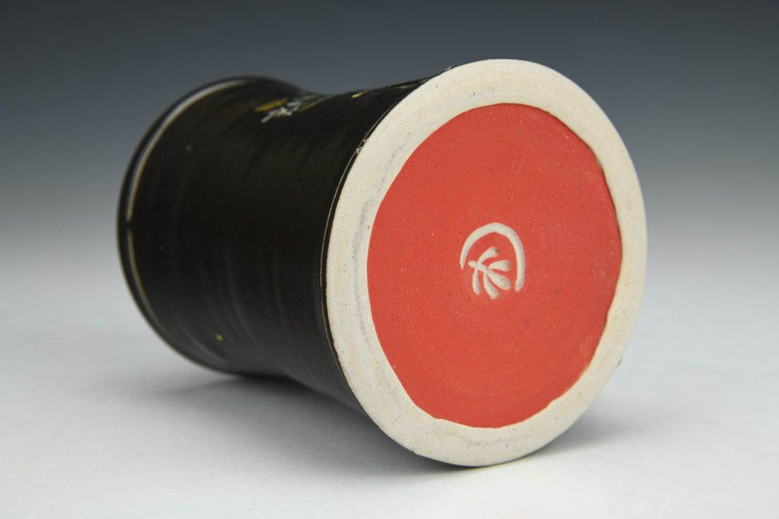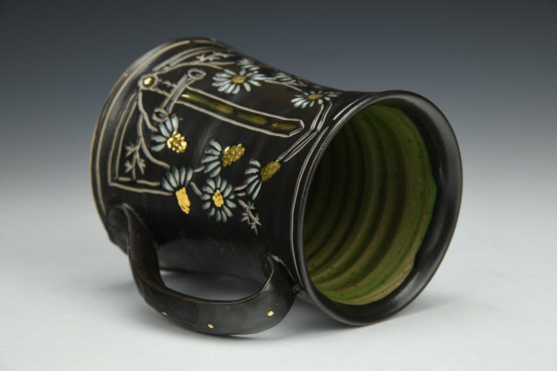 Stoneware, wheel thrown, slip, sgraffito, glaze inlay, gold luster, cone 10 gas reduction fired, 4.25 x 4.5 x 3.5 inches.