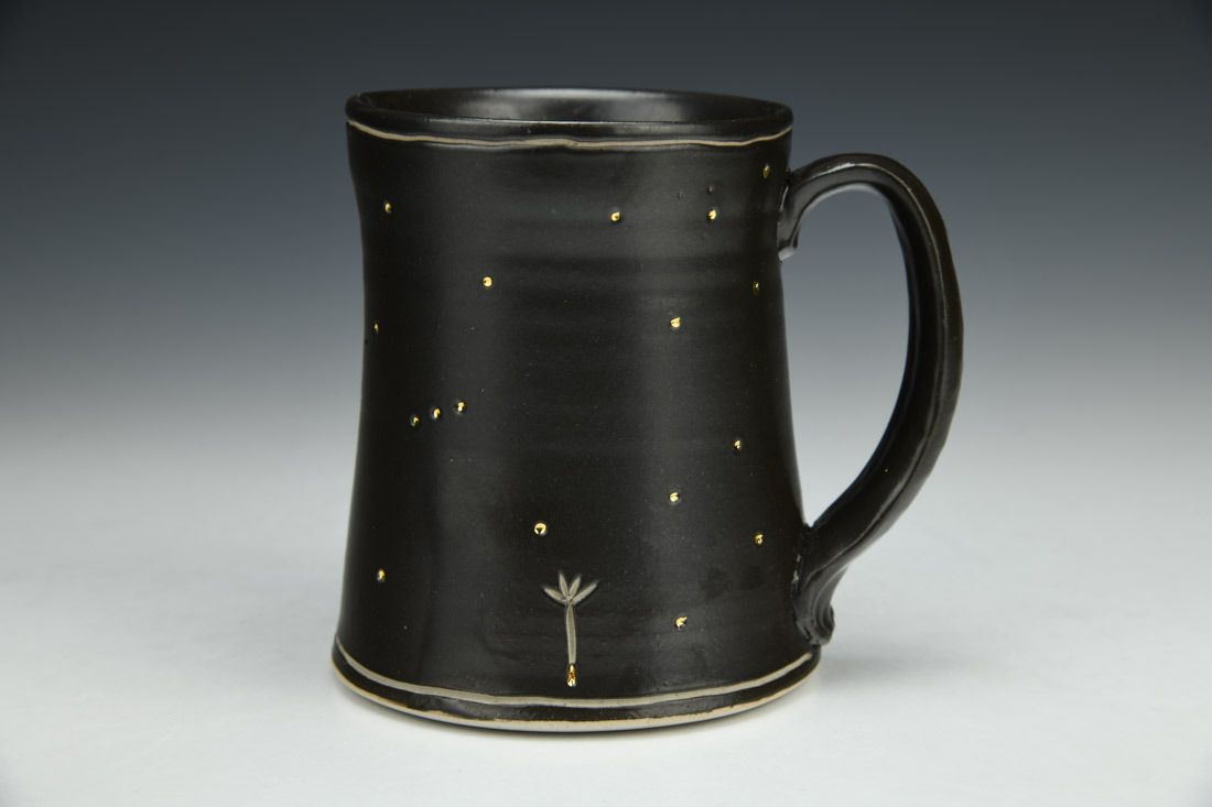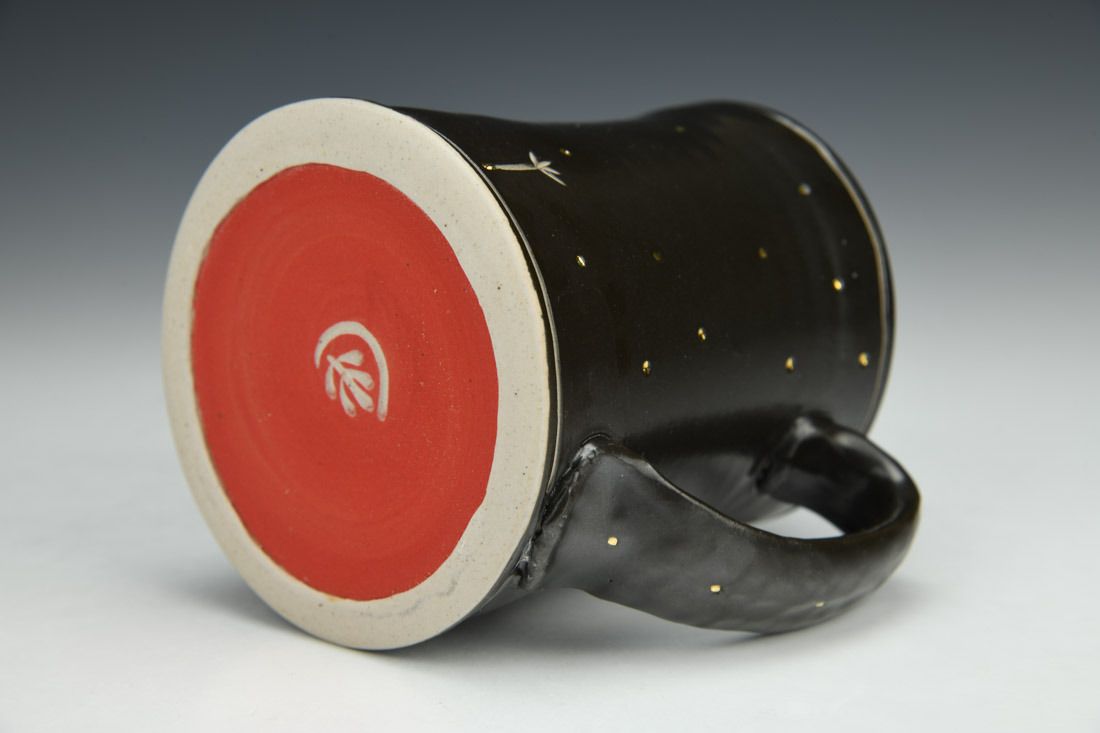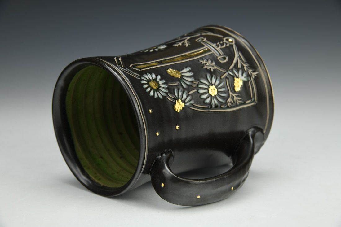 Stoneware, wheel thrown, slip, sgraffito, glaze inlay, gold luster, cone 10 gas reduction fired, 4.25 x 4.5 x 3.5 inches.