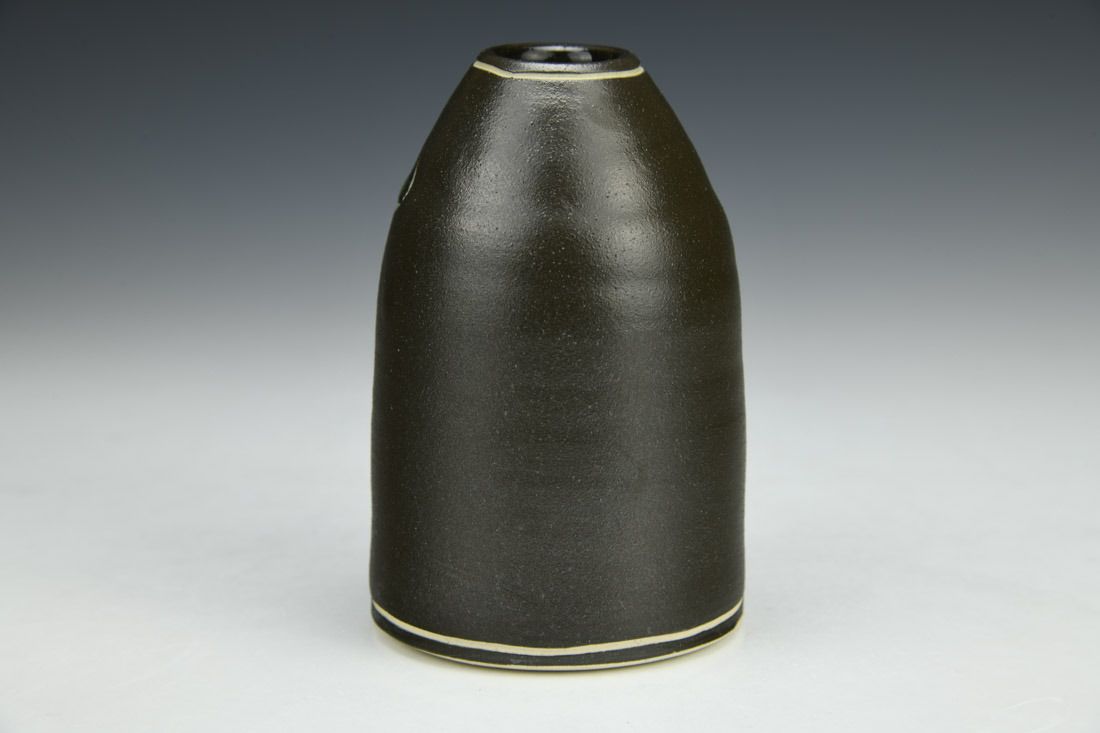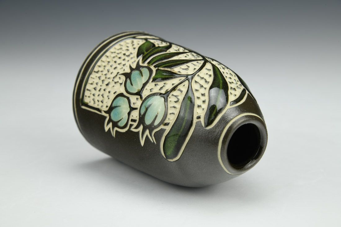 Stoneware, wheel thrown, slip, sgraffito, glaze inlay, cone 10 gas reduction fired, 4 x 3 x 3 inches.