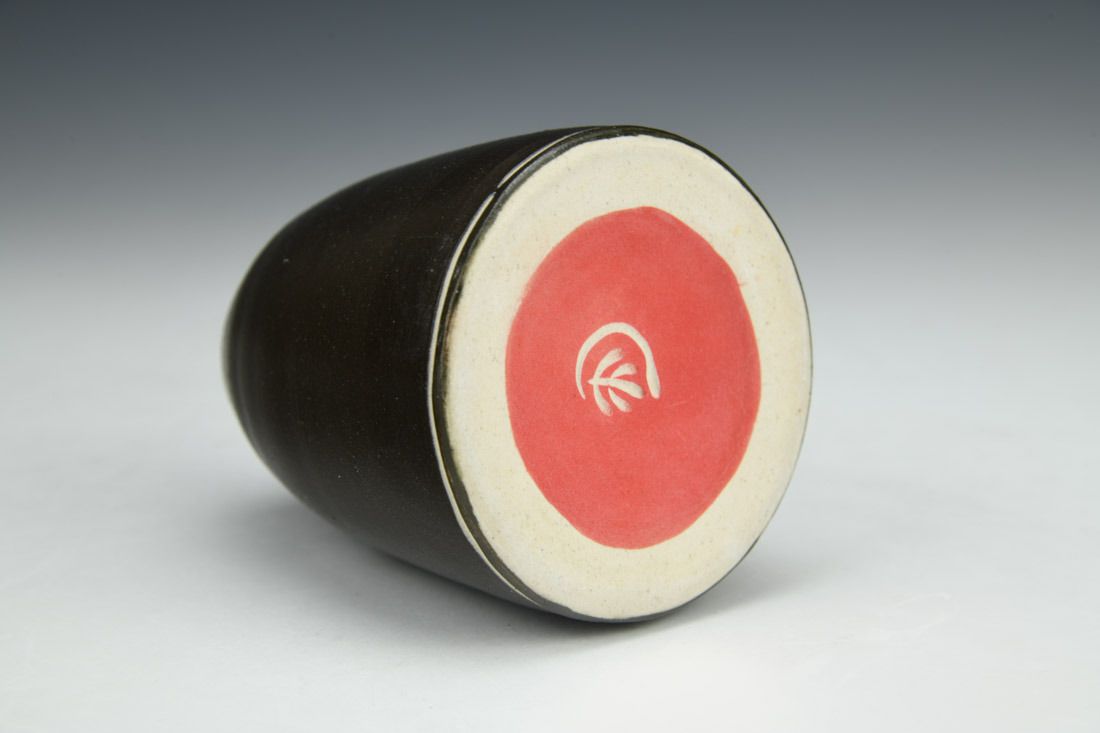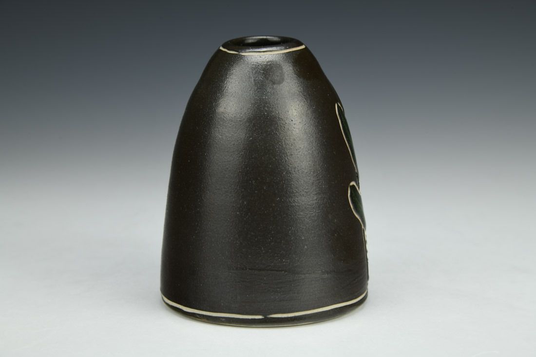 Stoneware, wheel thrown, slip, sgraffito, glaze inlay, cone 10 gas reduction fired, 4 x 3 x 3 inches.