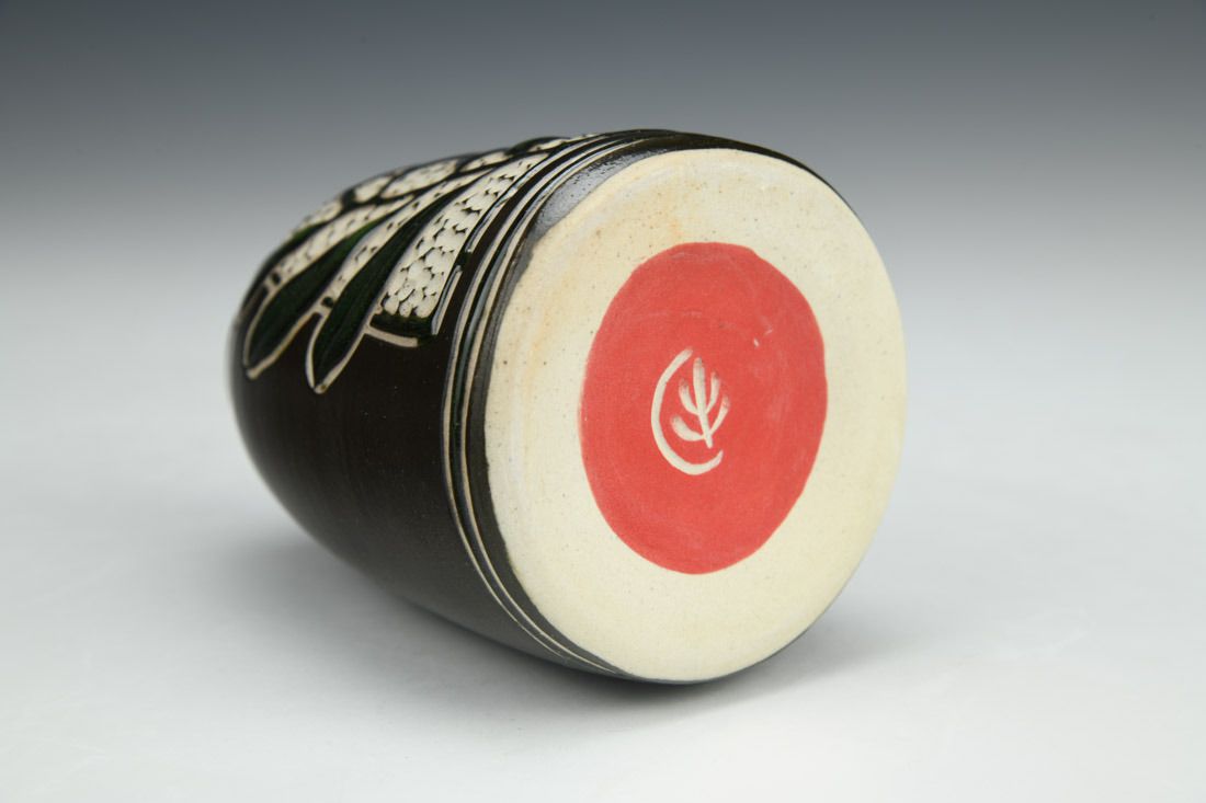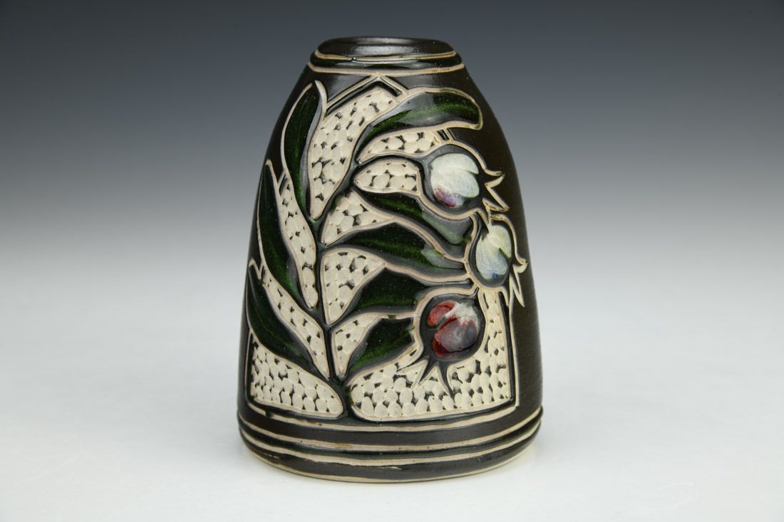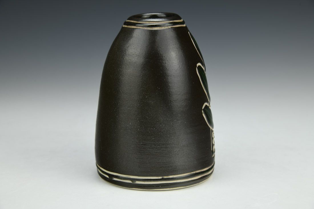 Stoneware, wheel thrown, slip, sgraffito, glaze inlay, cone 10 gas reduction fired, 4 x 3 x 3 inches.