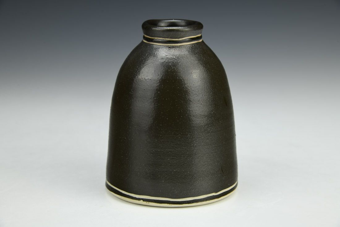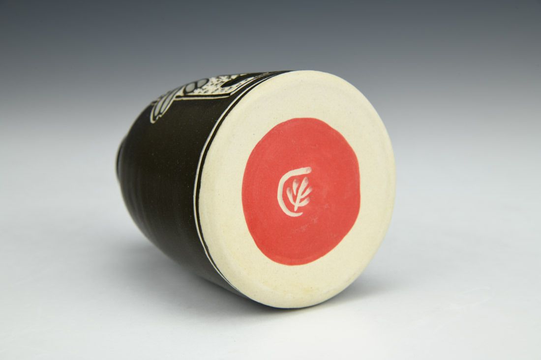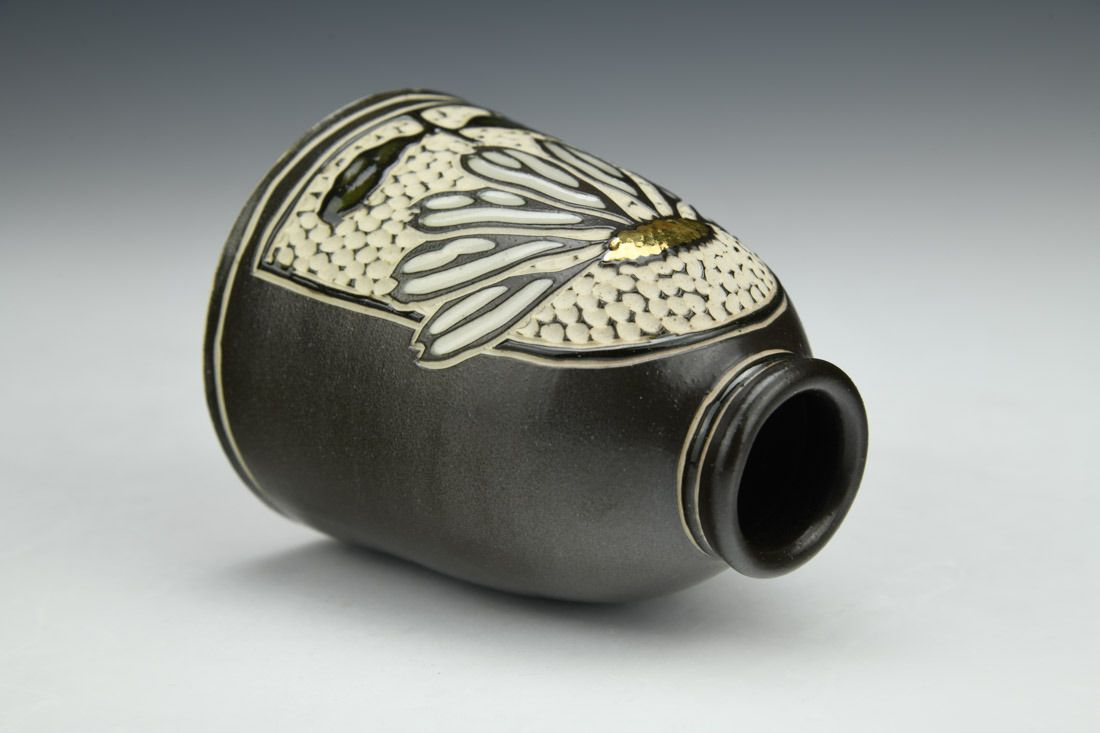 Stoneware, wheel thrown, slip, sgraffito, glaze inlay, gold luster, cone 10 gas reduction fired, 4 x 3 x 3 inches.