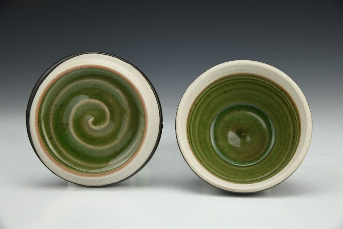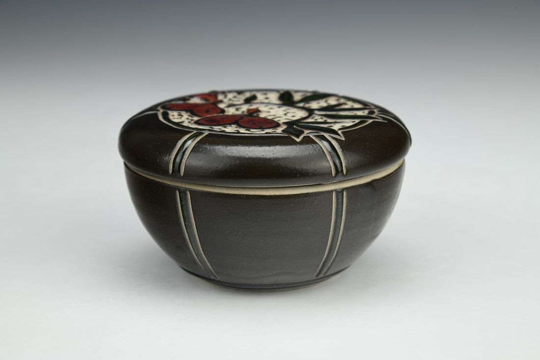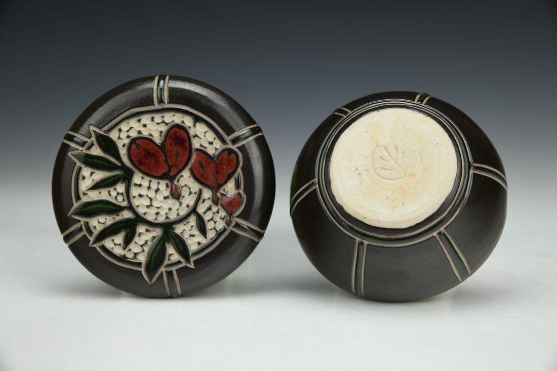 Stoneware, wheel thrown, slip, sgraffito, glaze inlay, cone 10 gas reduction fired, 2 x 3.5 x 3.5 inches.