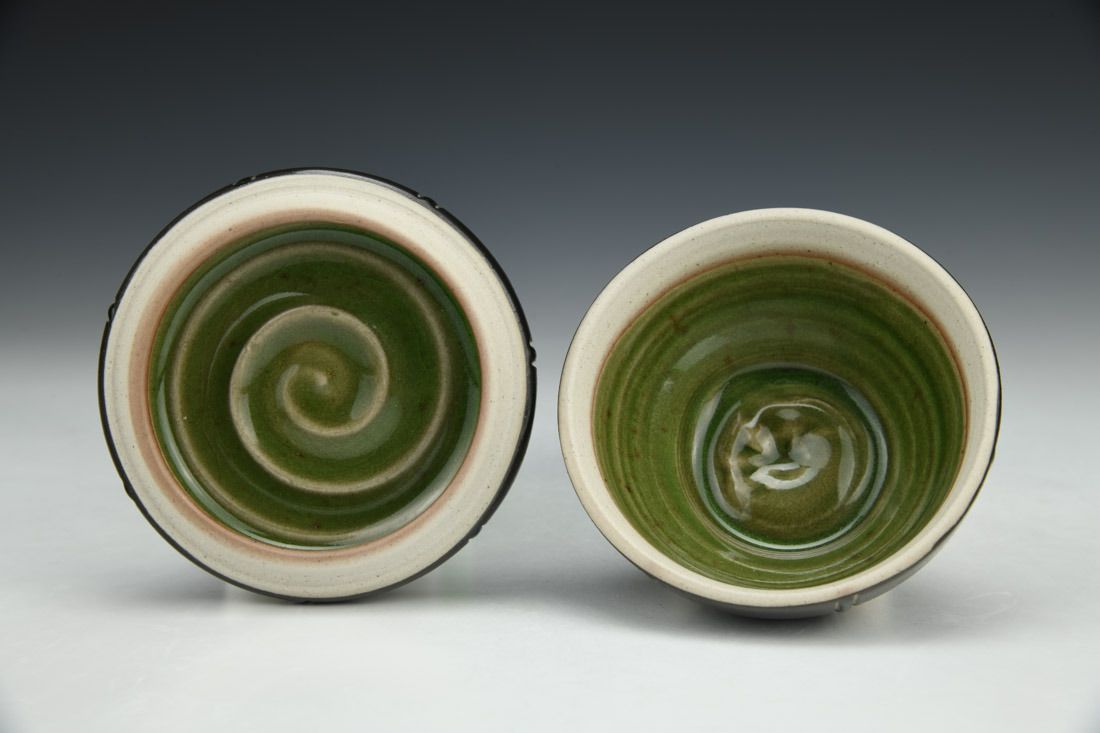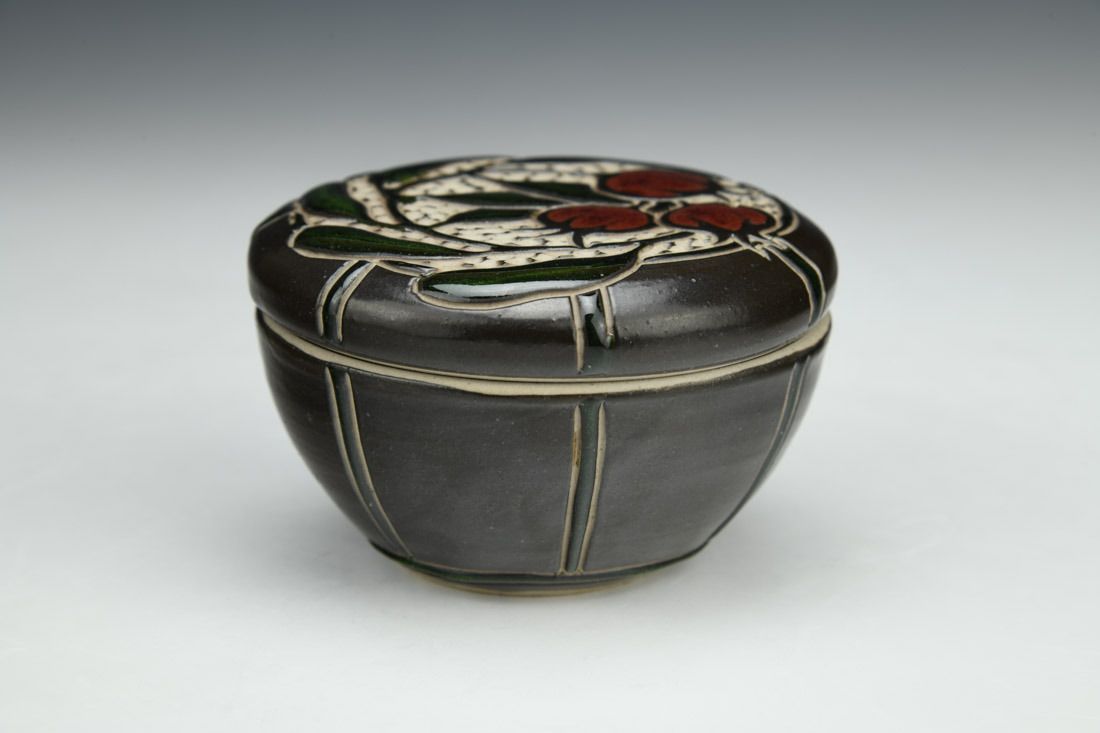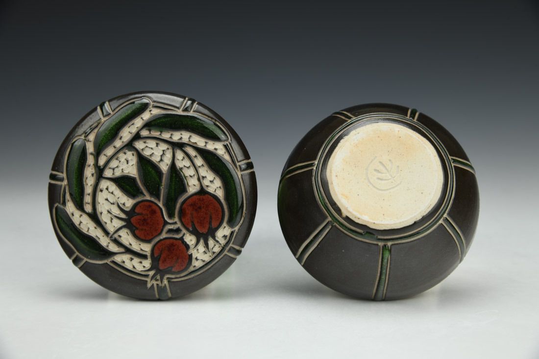 Stoneware, wheel thrown, slip, sgraffito, glaze inlay, cone 10 gas reduction fired, 2 x 3.5 x 3.5 inches.