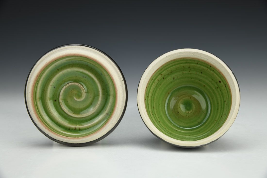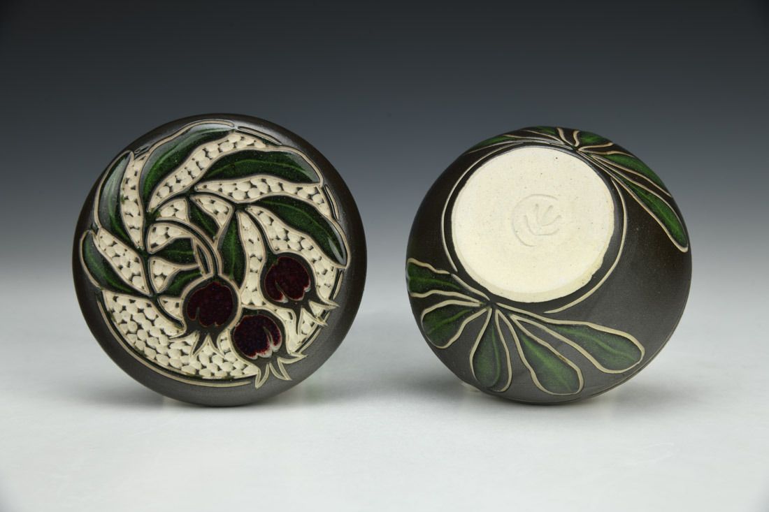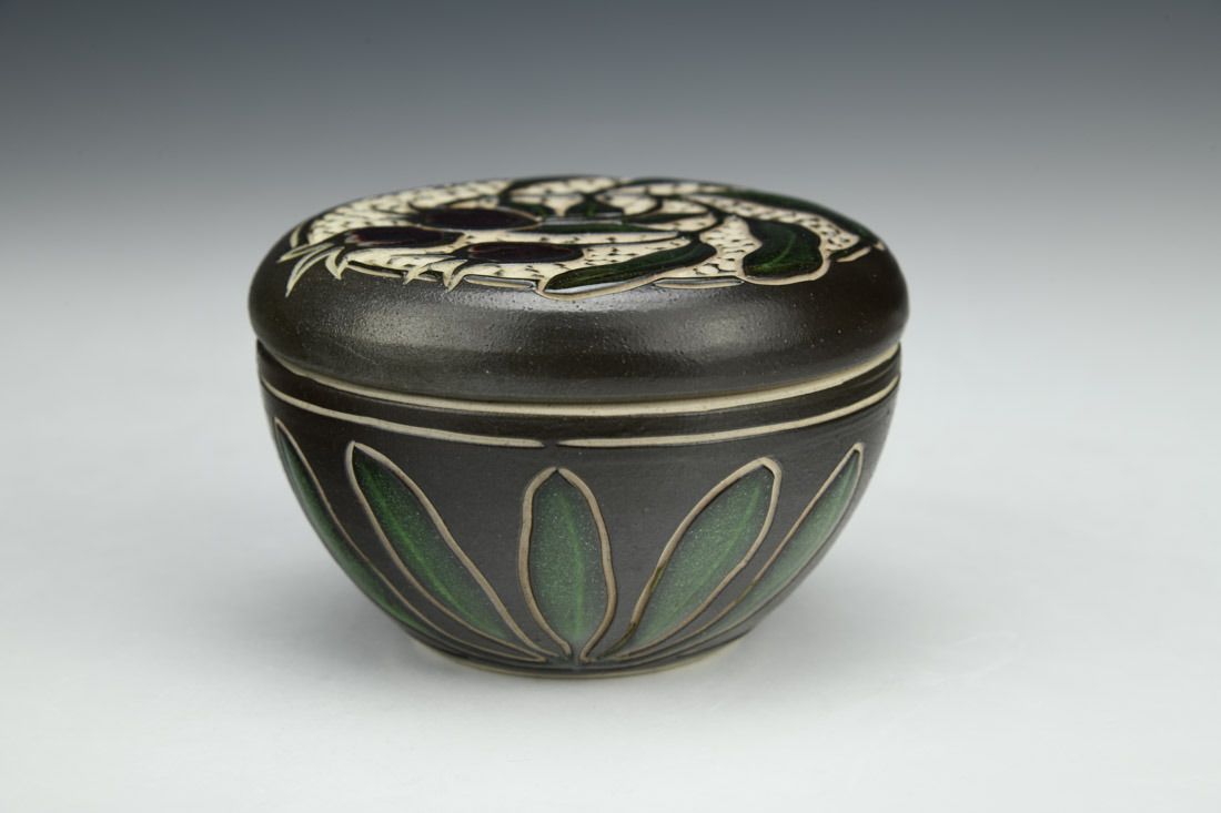 Stoneware, wheel thrown, slip, sgraffito, glaze inlay, cone 10 gas reduction fired, 2.25 x 3.5 x 3.5 inches.