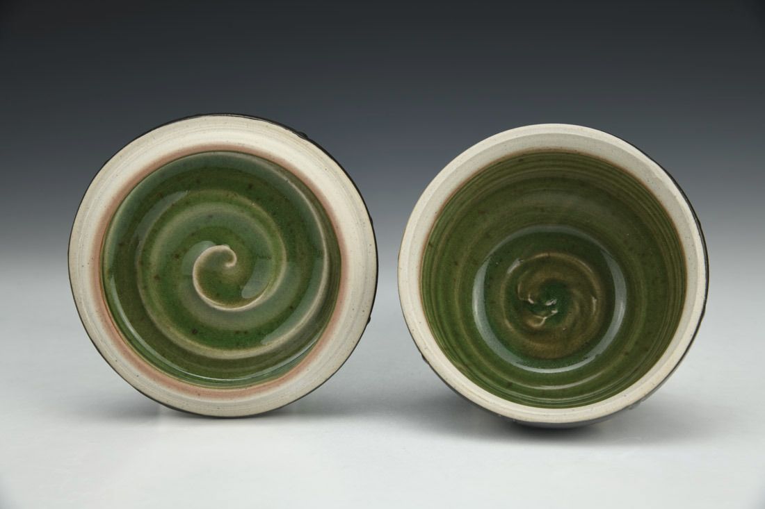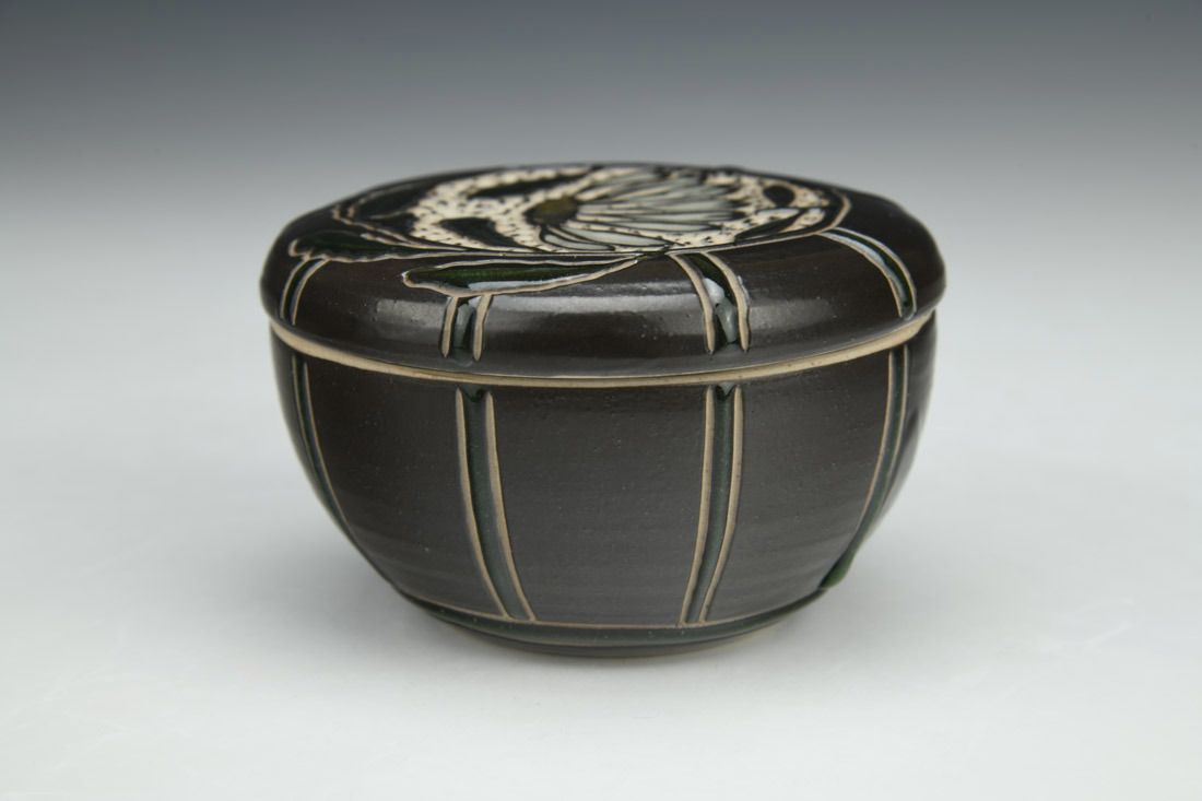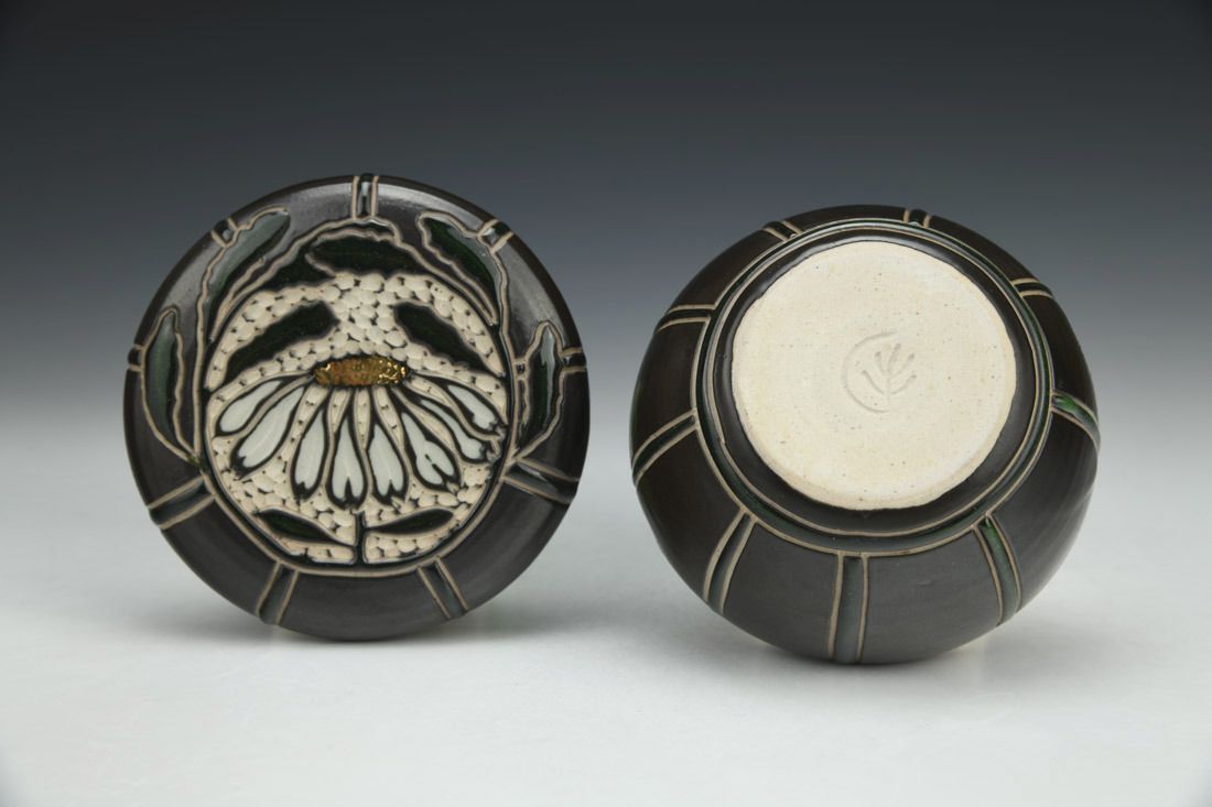 Stoneware, wheel thrown, slip, sgraffito, glaze inlay, gold luster, cone 10 gas reduction fired, 2.25 x 3.5 x 3.5 inches.
