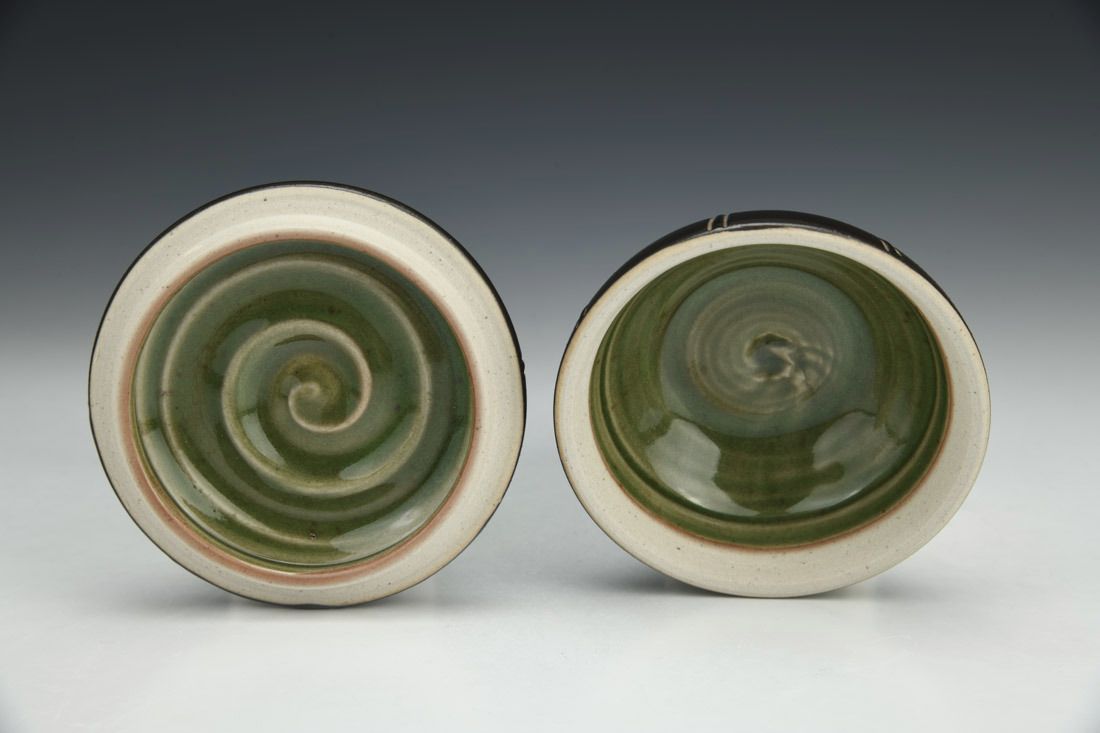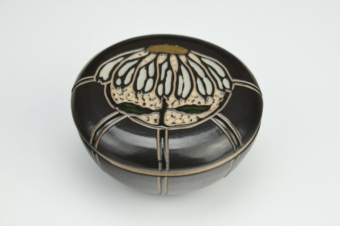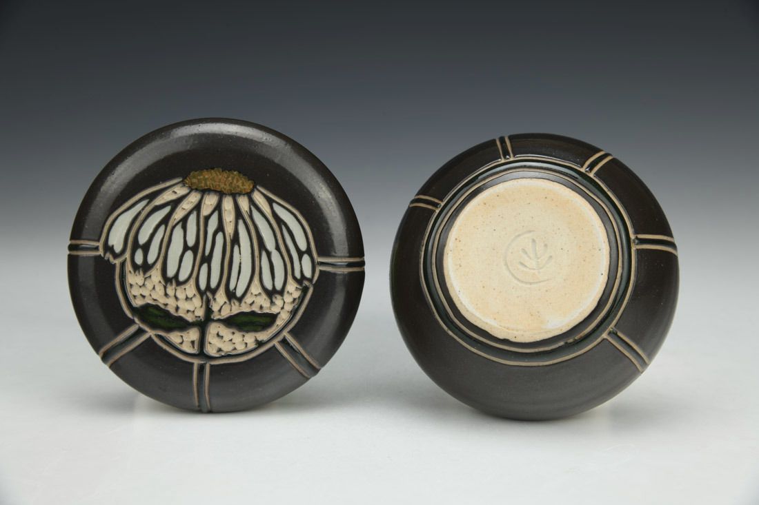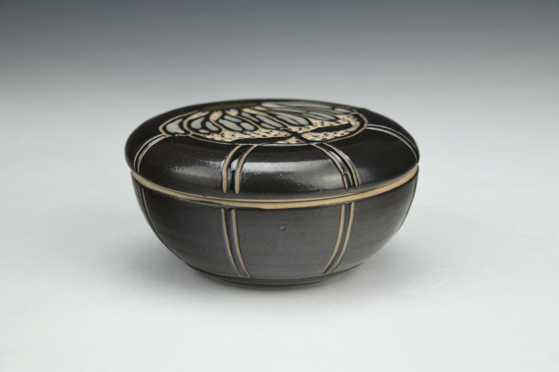 Stoneware, wheel thrown, slip, sgraffito, glaze inlay, gold luster, cone 10 gas reduction fired, 1.75 x 3.5 x 3.5 inches.