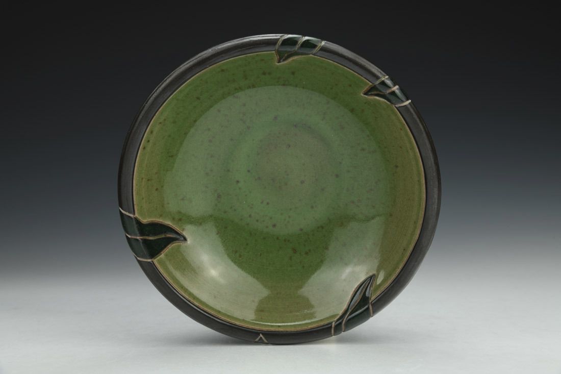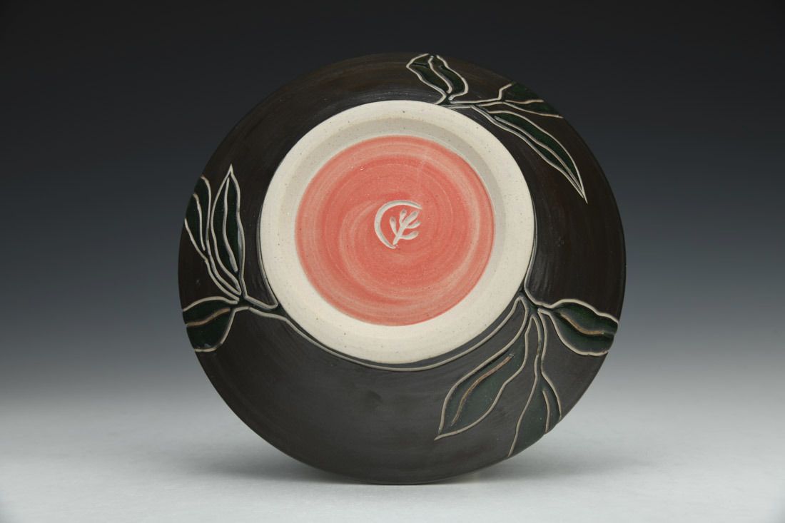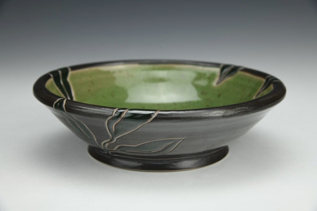 Stoneware, wheel thrown, slip, sgraffito, glaze inlay, cone 10 gas reduction fired, 2 x 6.5 x 6.5 inches.