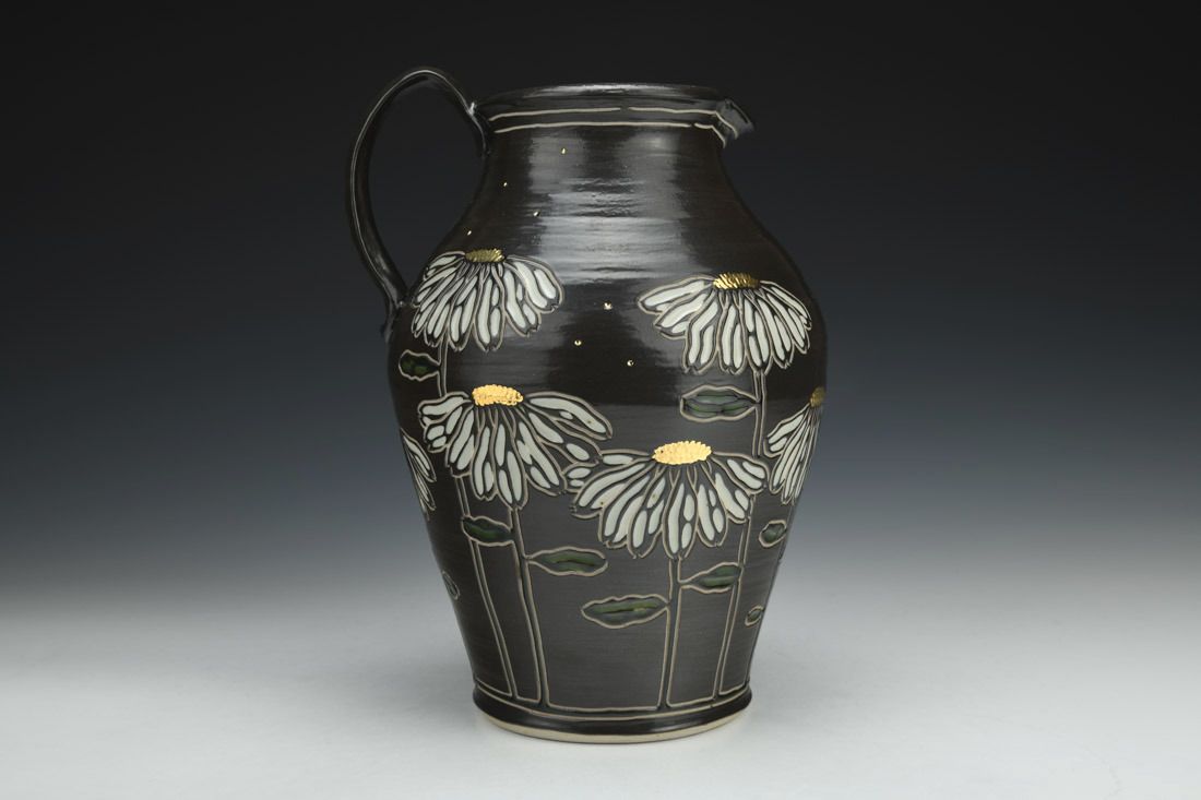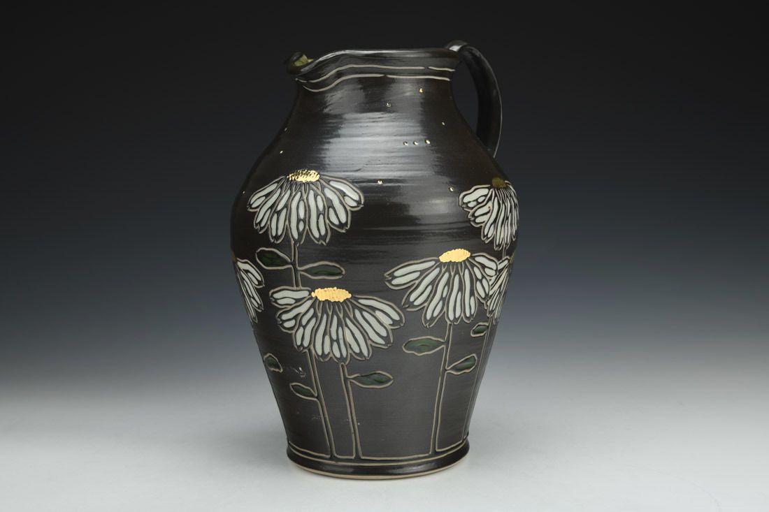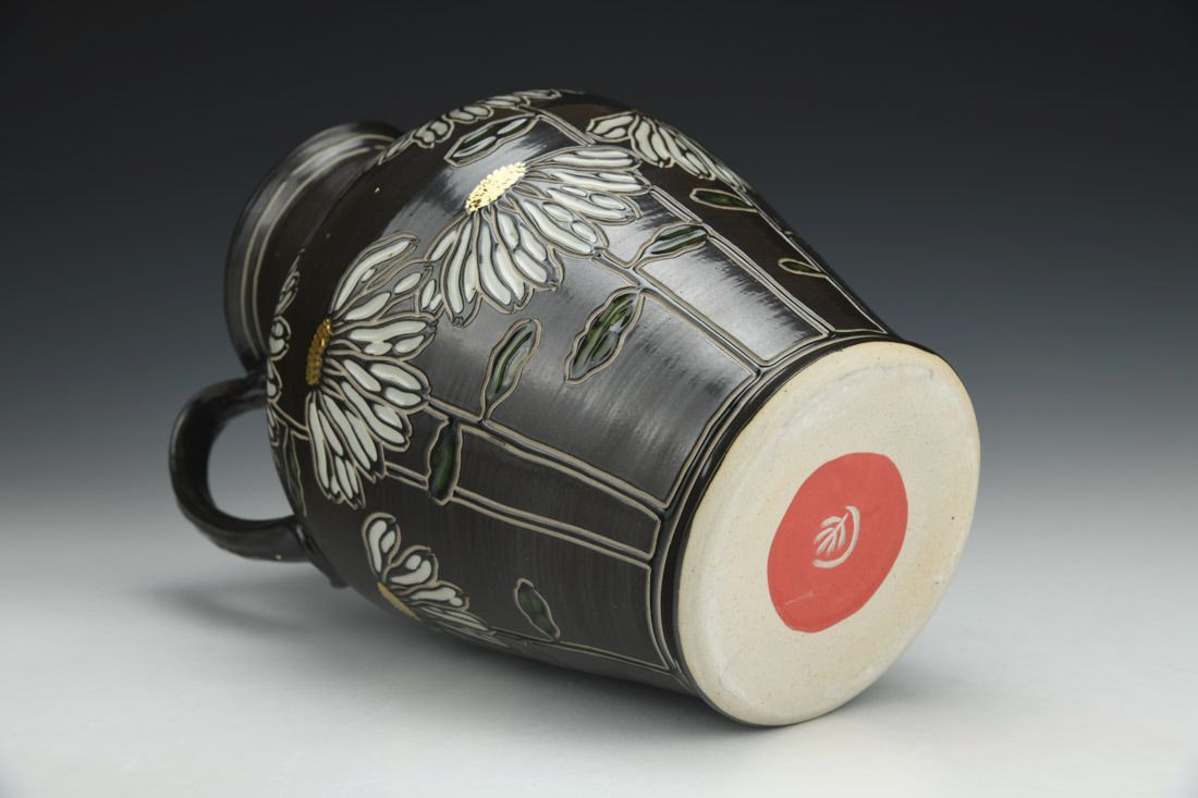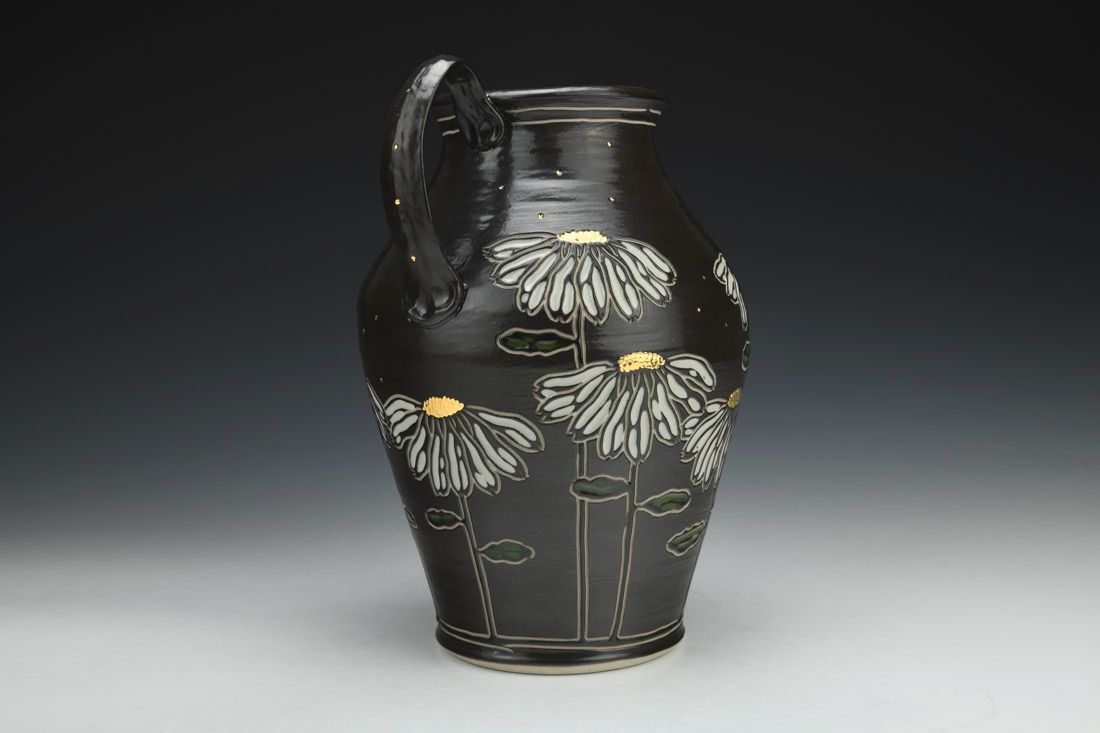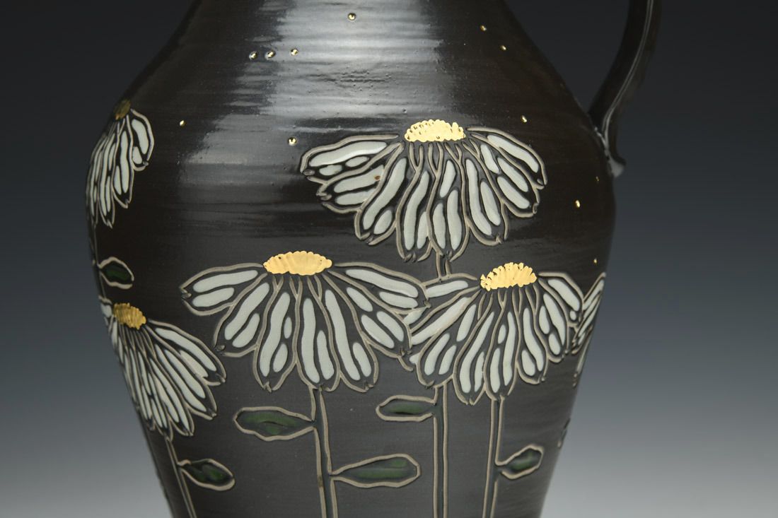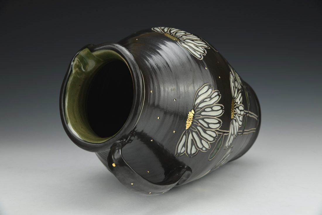 Stoneware, wheel thrown, slip, sgraffito, glaze inlay, gold luster, cone 10 gas reduction fired, 9 x 6.5 x 6.5 inches.