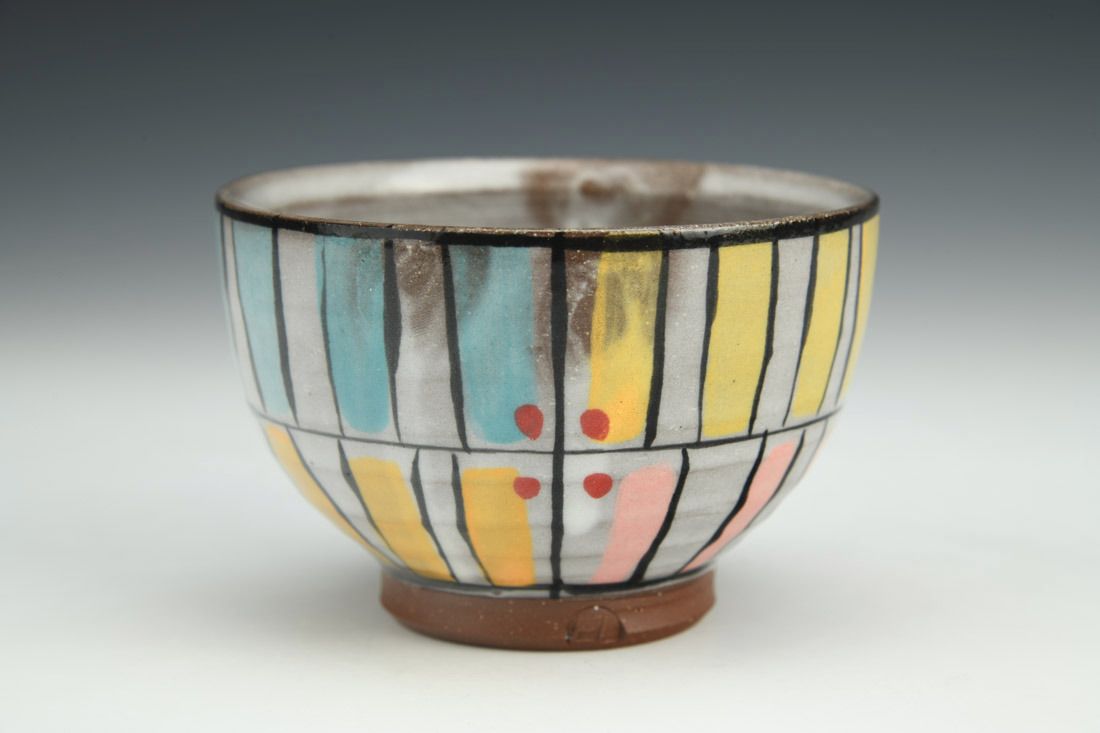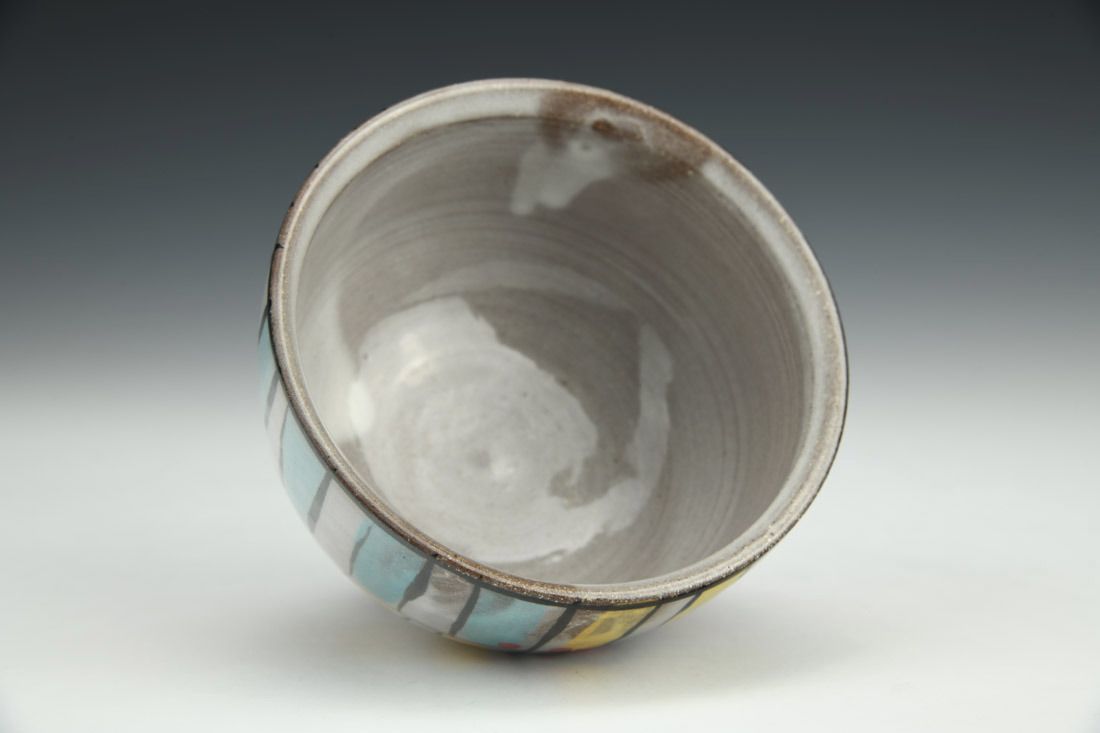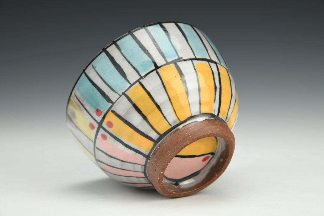 Red stoneware, wheel thrown, slips, cone 5 oxidation fired, 2.5 x 3.75 x 3.75 inches.