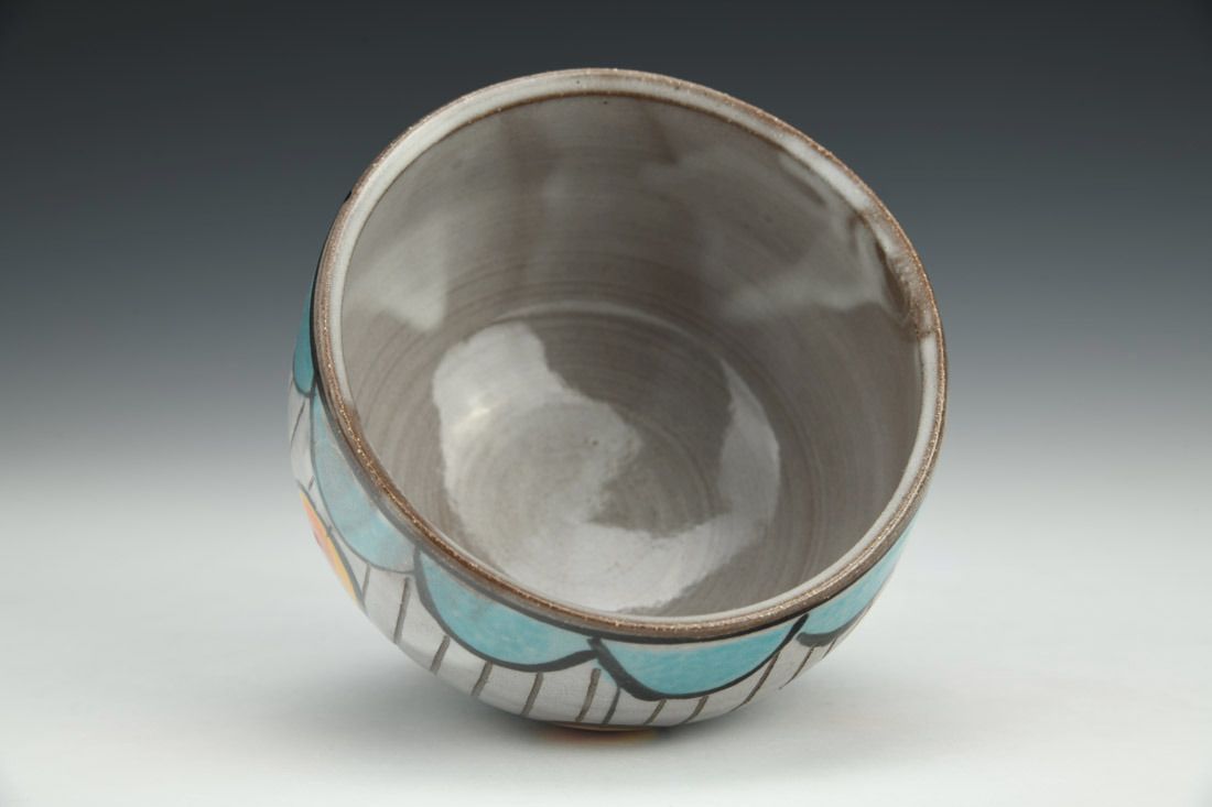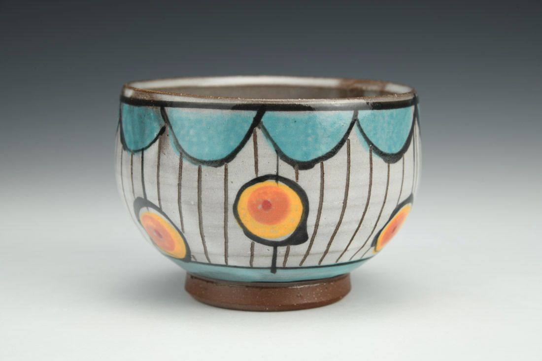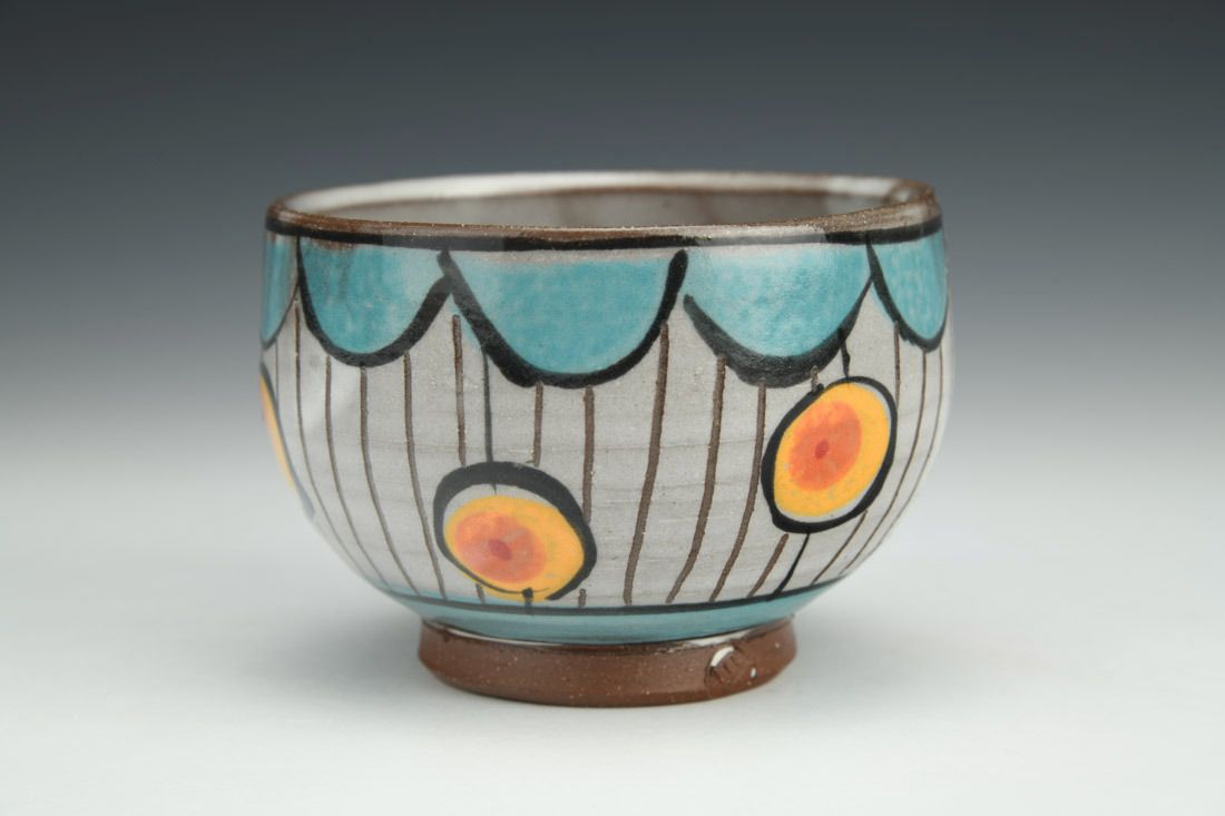 Red stoneware, wheel thrown, slips, cone 5 oxidation fired, 2.75 x 4 x 4 inches.