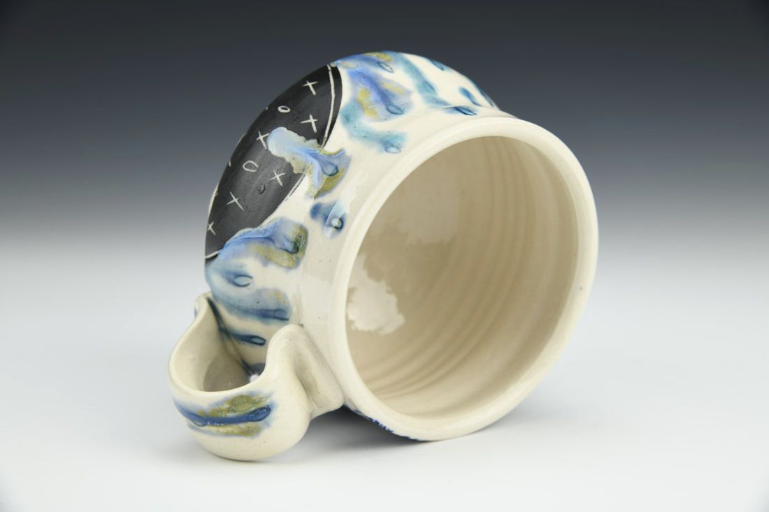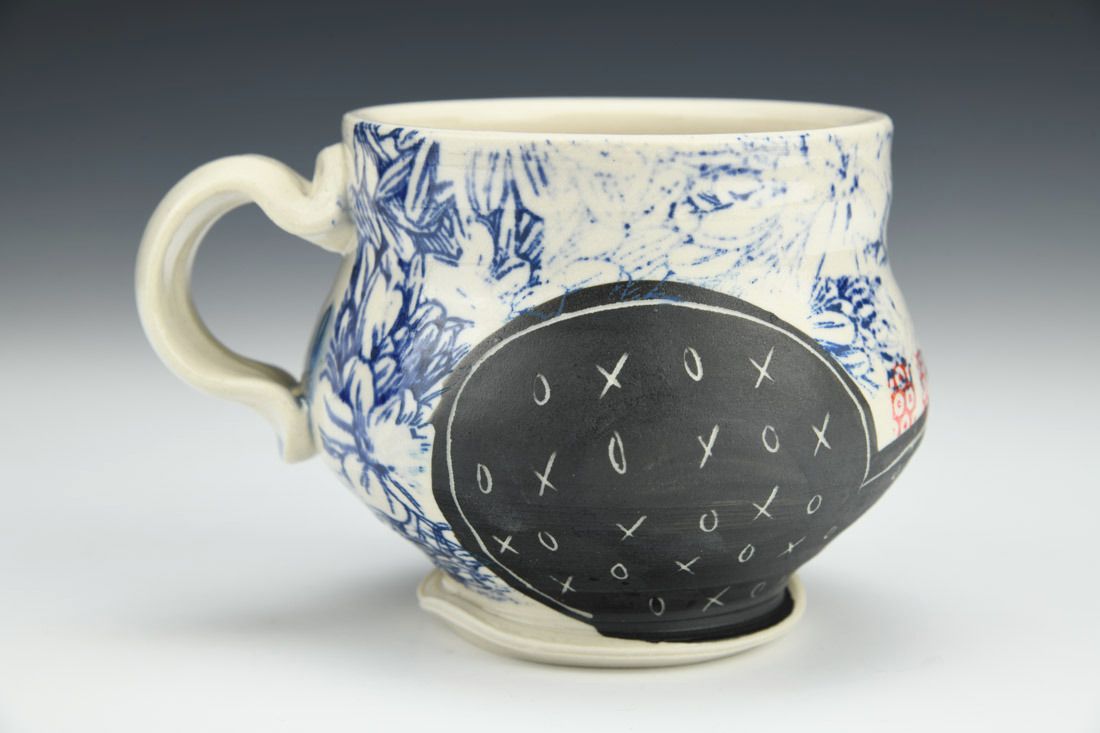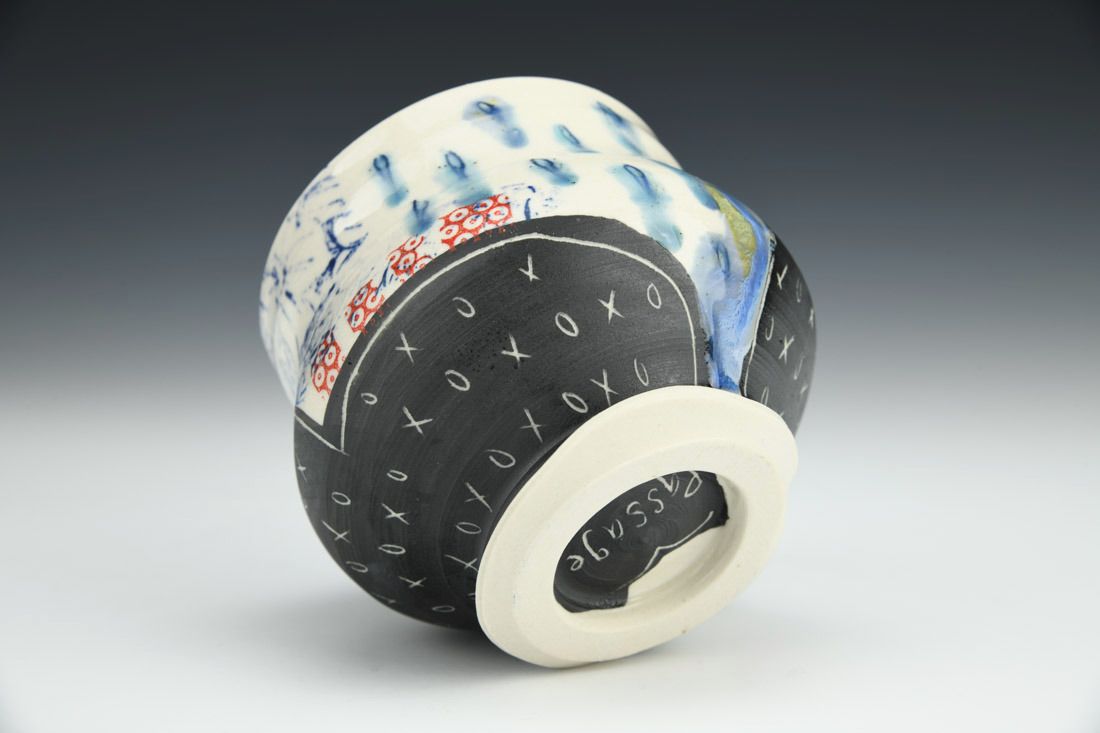 Porcelain, wheel thrown, sgrafitto, mishima, decals, 3.5 x 5 x 4 inches.