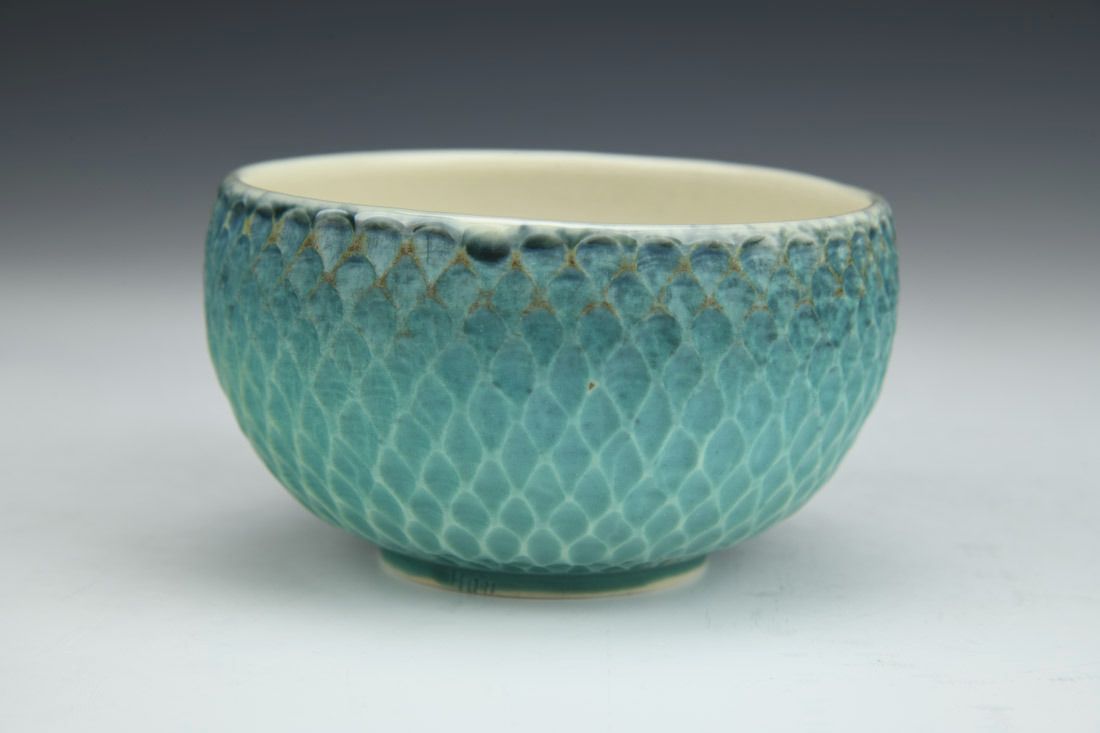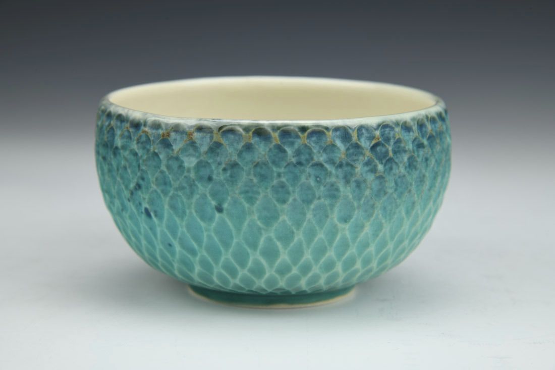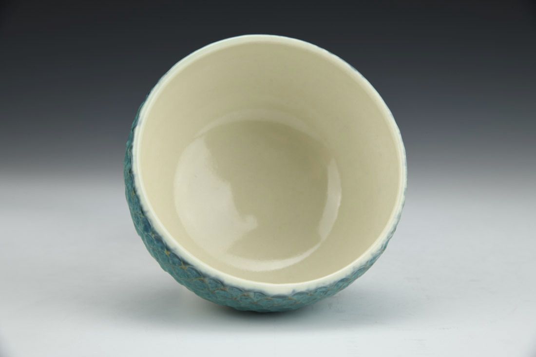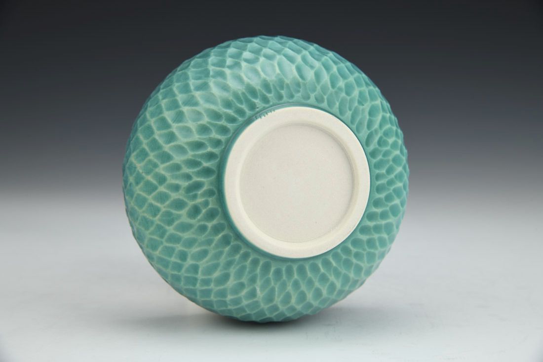 Porcelain, wheel thrown, glaze, cone 9 oxidation fired, 2.25 x 4.25 x 4.25 inches.