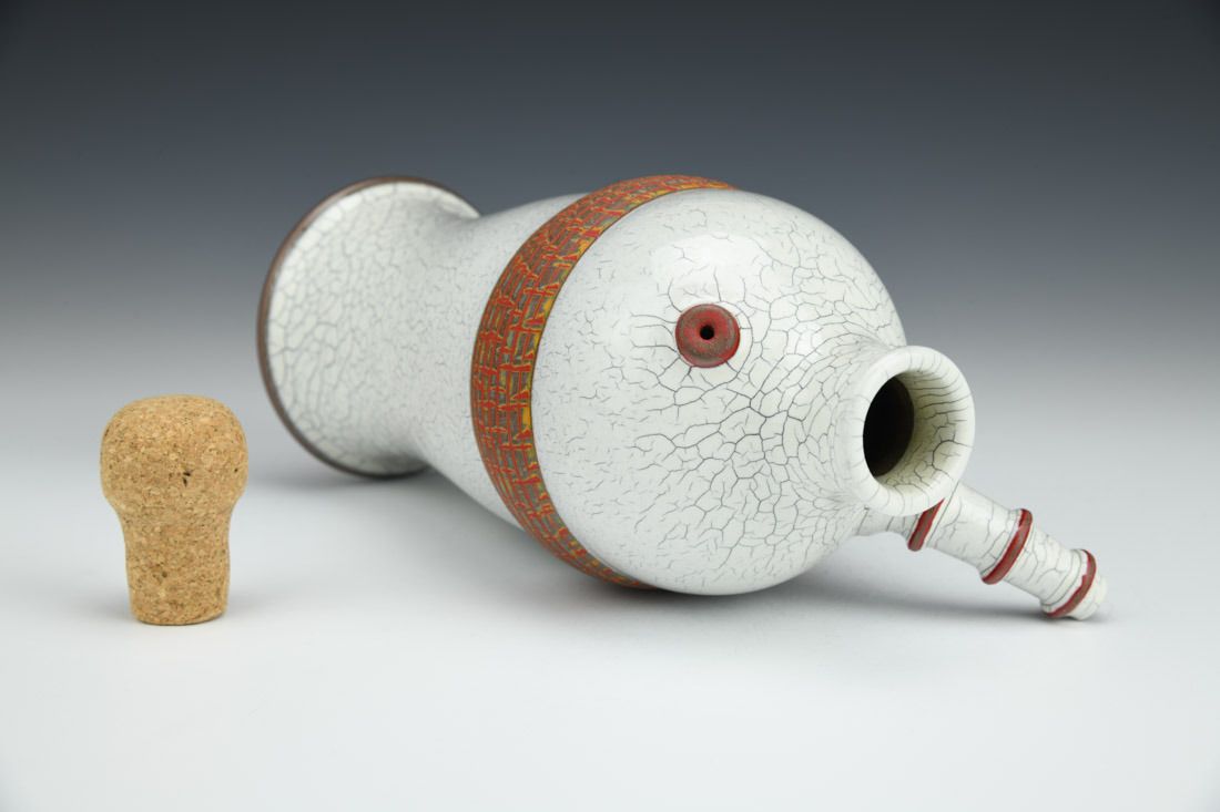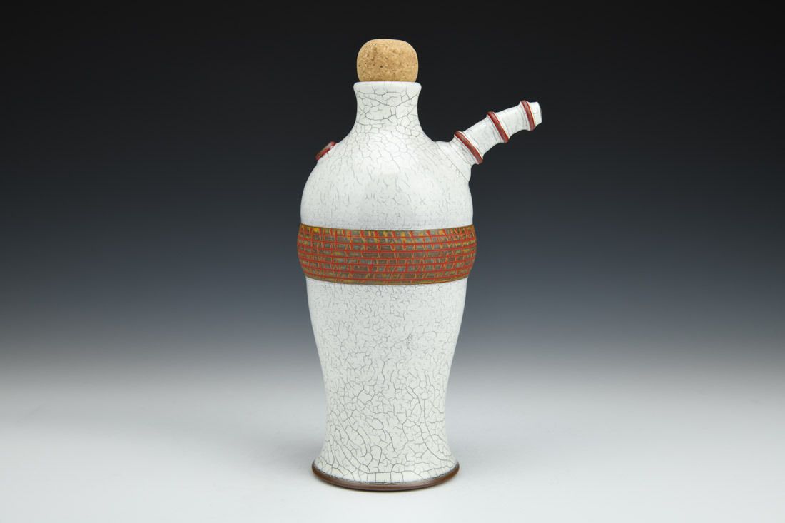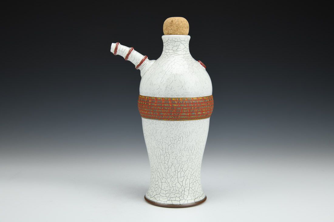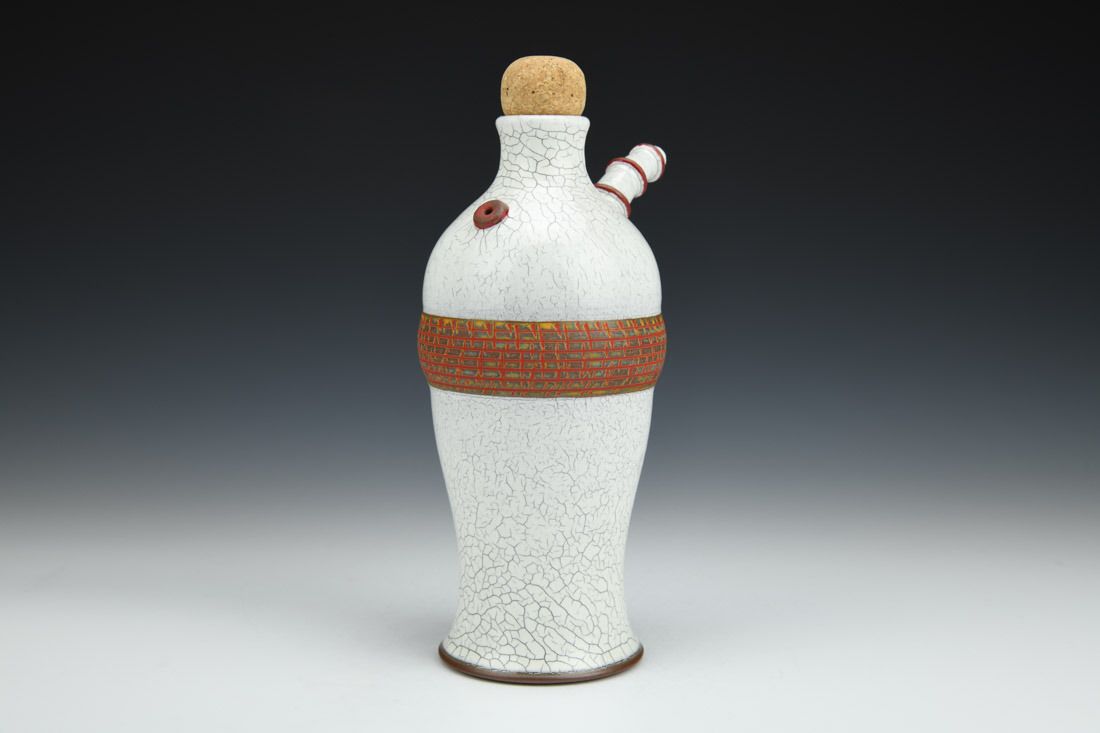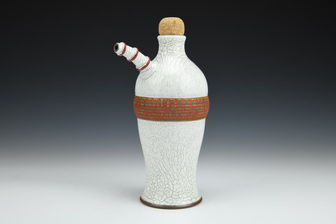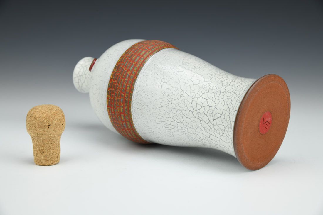 Red stoneware and cork, wheel thrown, crackle slip, oxidation fired, 9 x 5.5 x 4 inches.