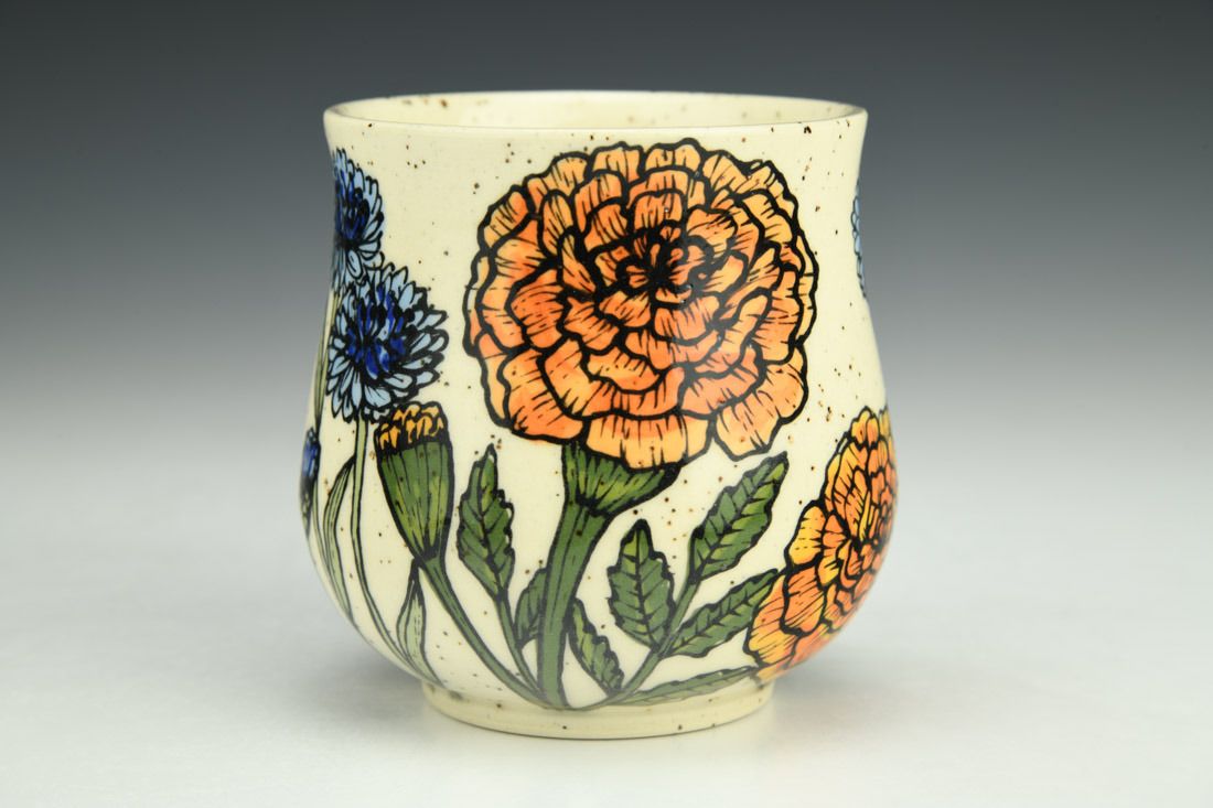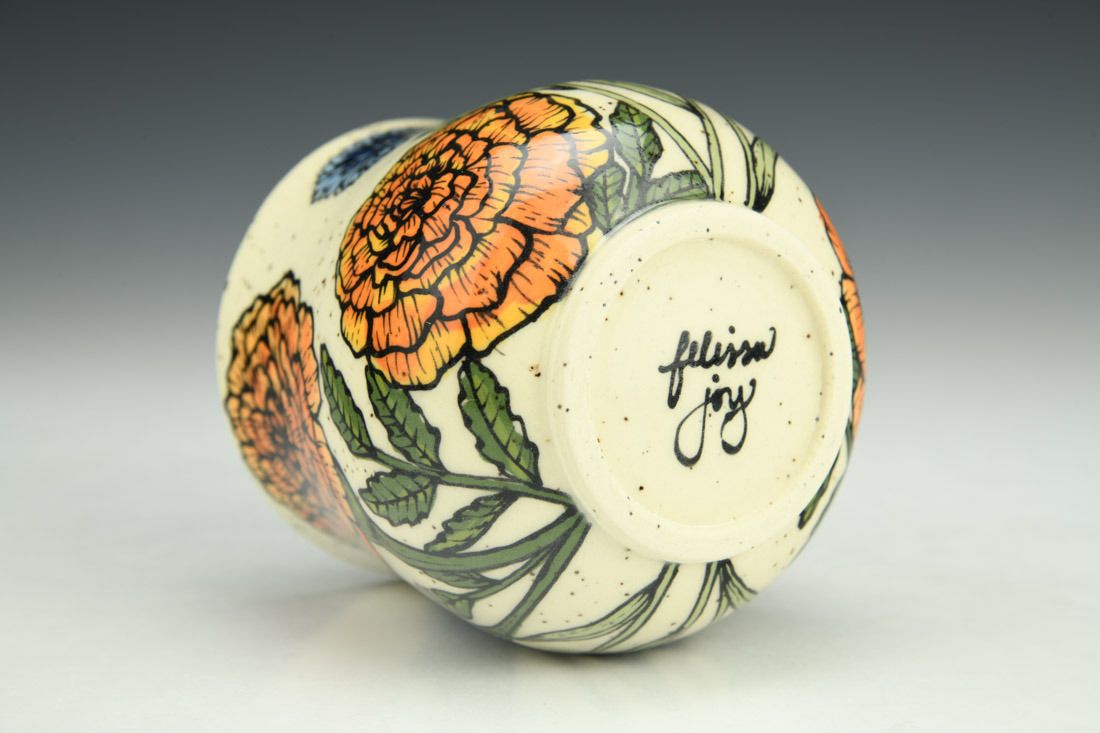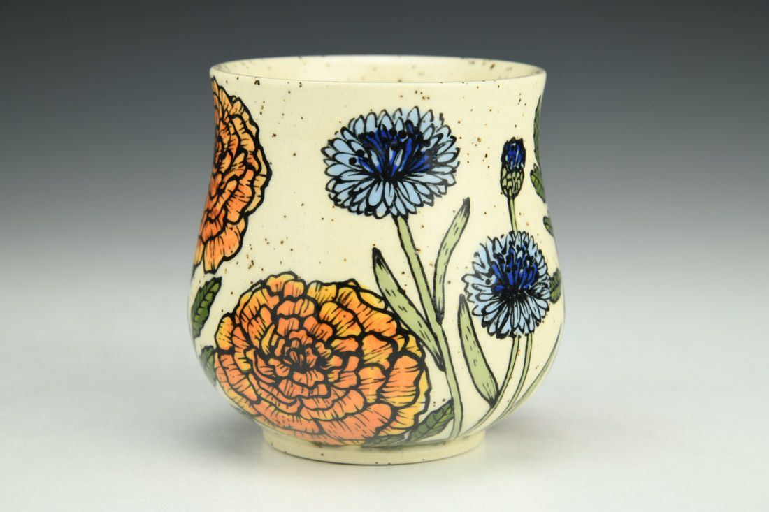 Stoneware, wheel thrown, hand painted and slip-trailed underglaze, glaze, cone 6 electric fired, 3.5 x 3.5 x 3.5inches.