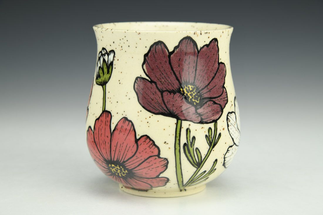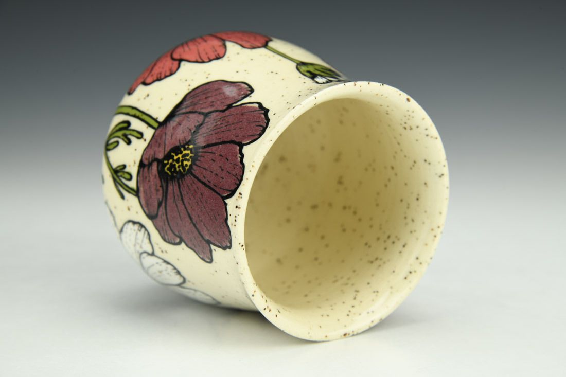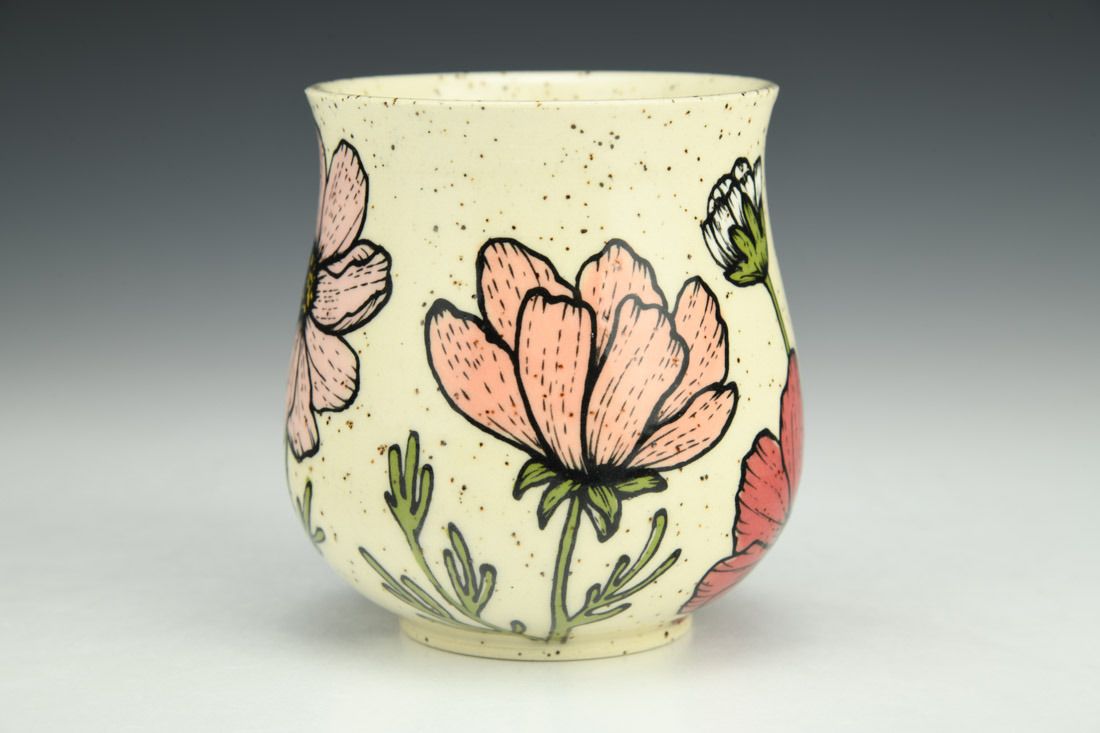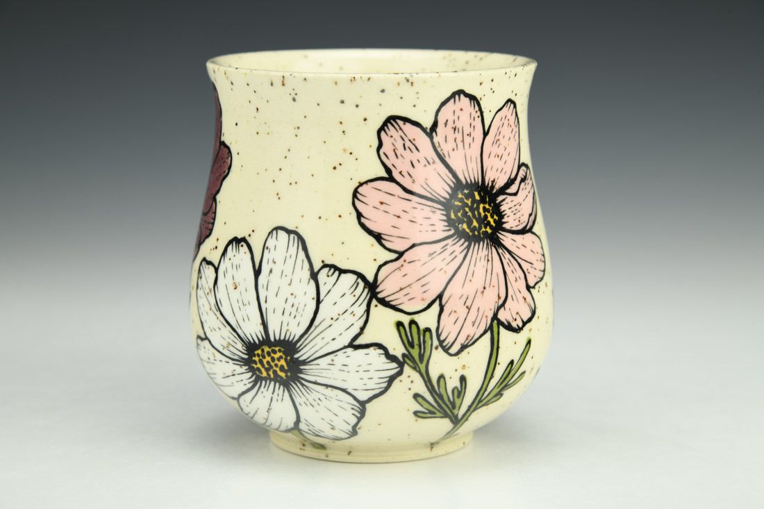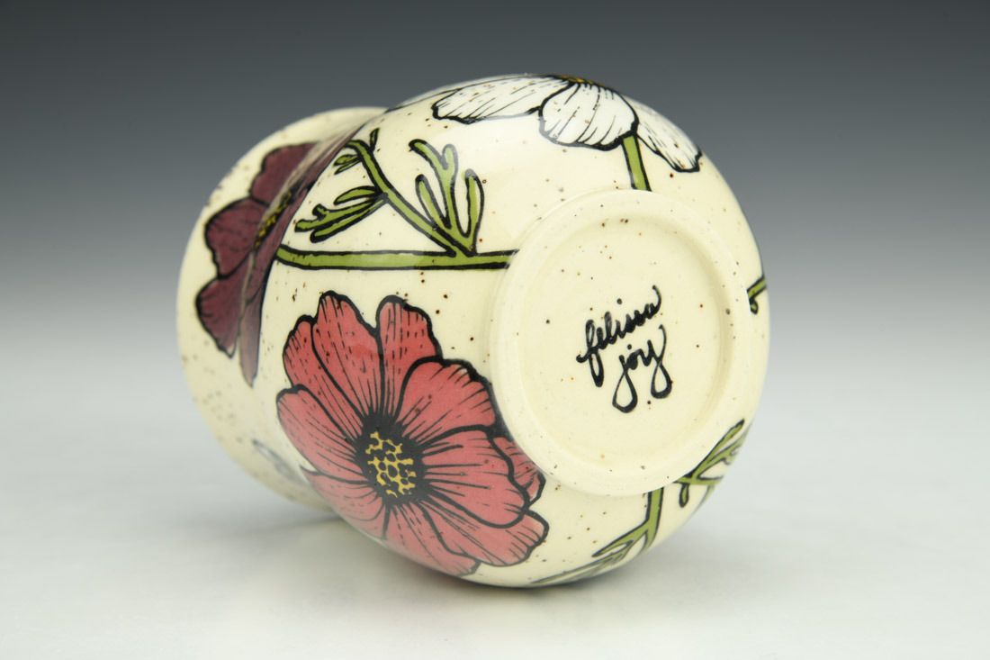Stoneware, wheel thrown, hand painted and slip-trailed underglaze, glaze, cone 6 electric fired, 3.5 x 3.5 x 3.5inches.