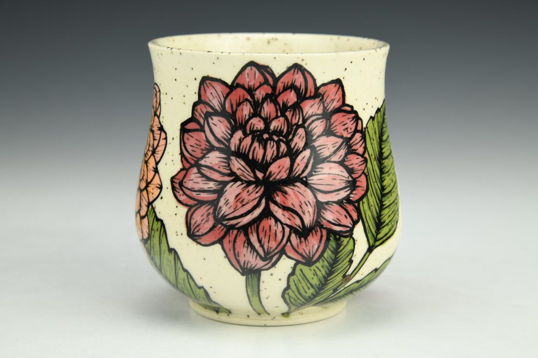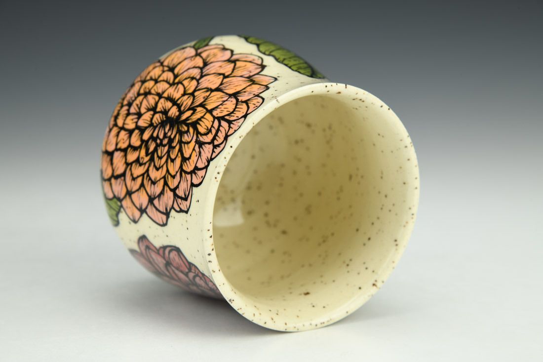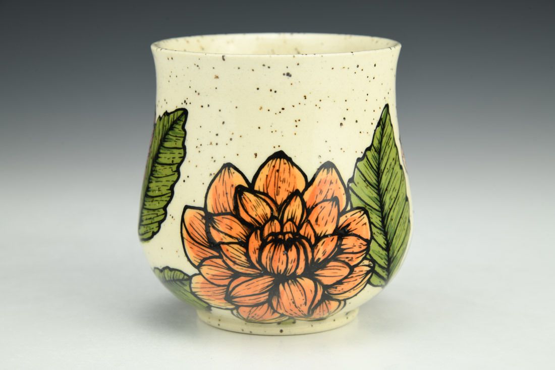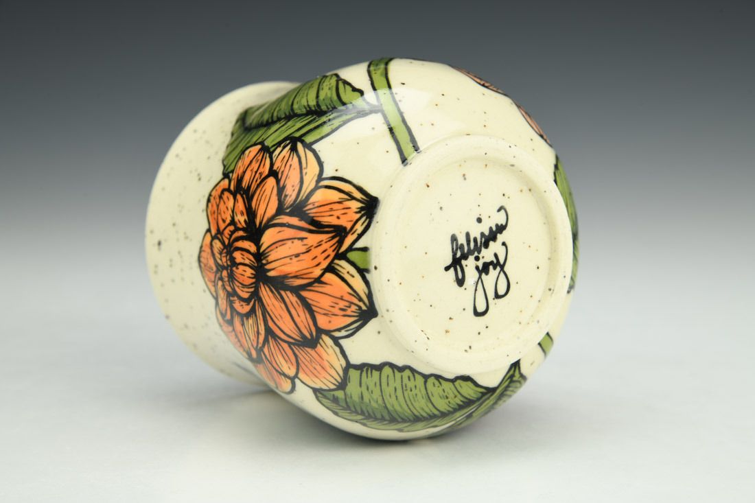 Stoneware, wheel thrown, hand painted and slip-trailed underglaze, glaze, cone 6 electric fired, 3.5 x 3.5 x 3.5inches.