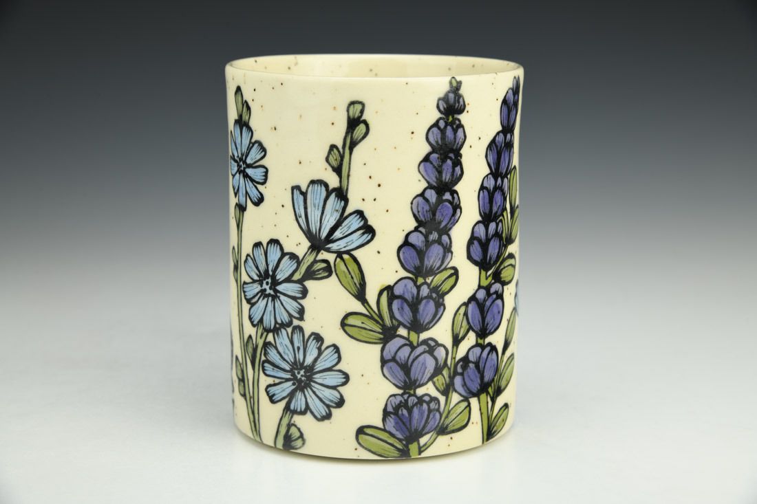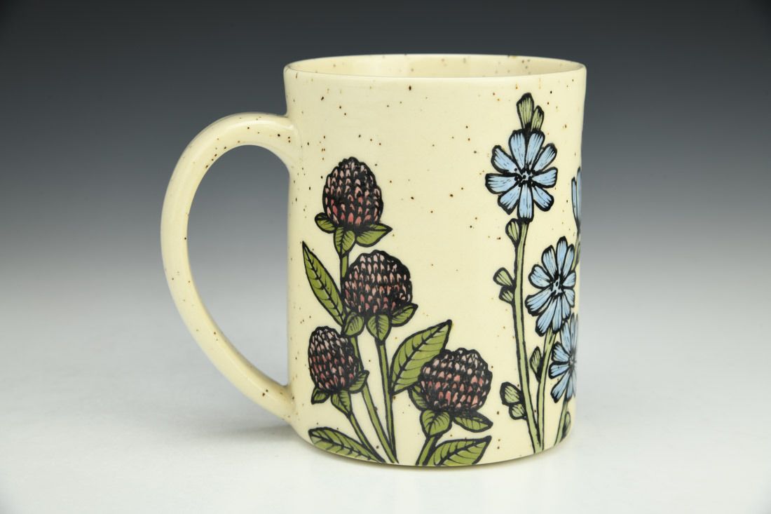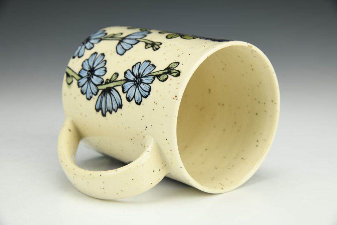 Stoneware, wheel thrown, hand painted and slip-trailed underglaze, glaze, cone 6 electric fired, 4.25 x 5 x 3.5 inches.