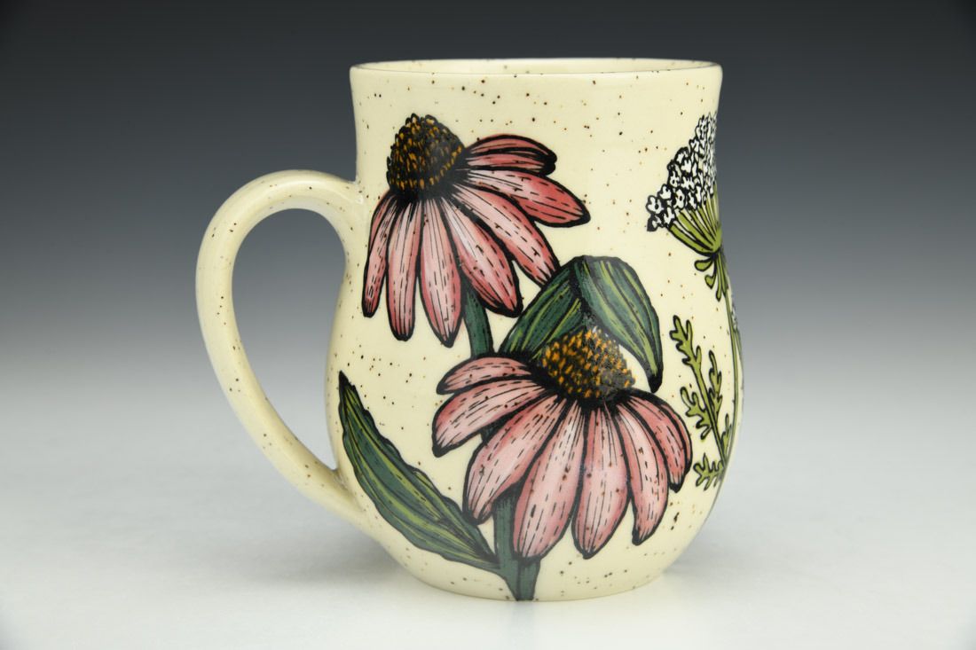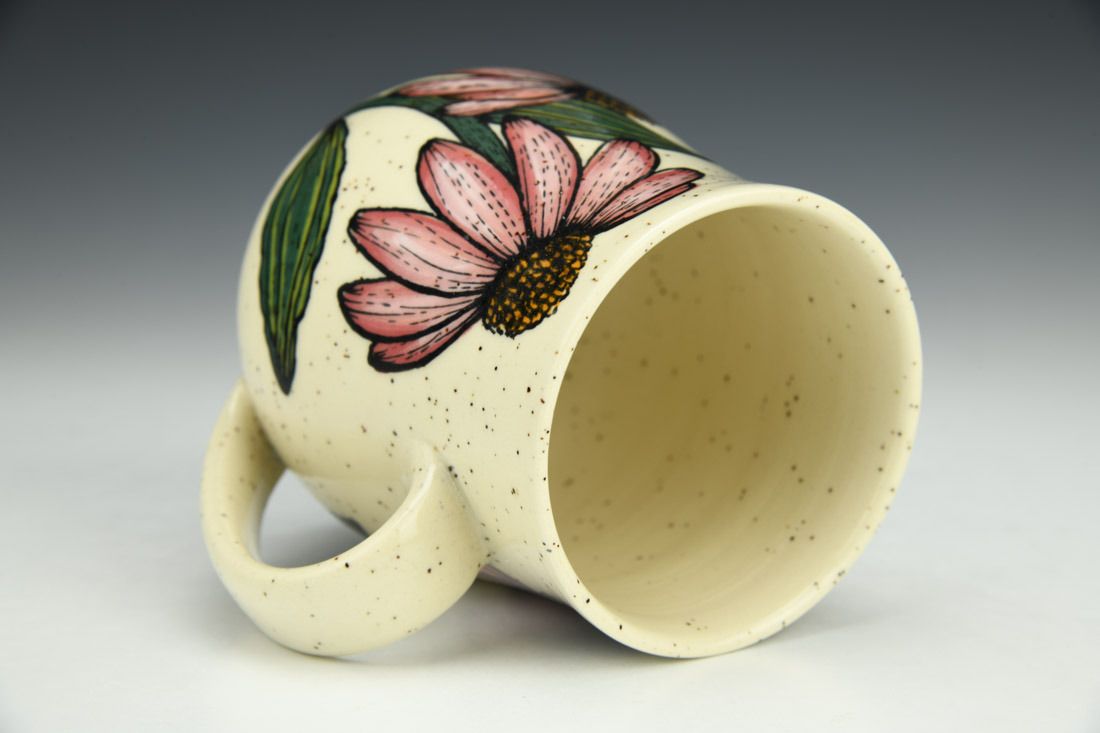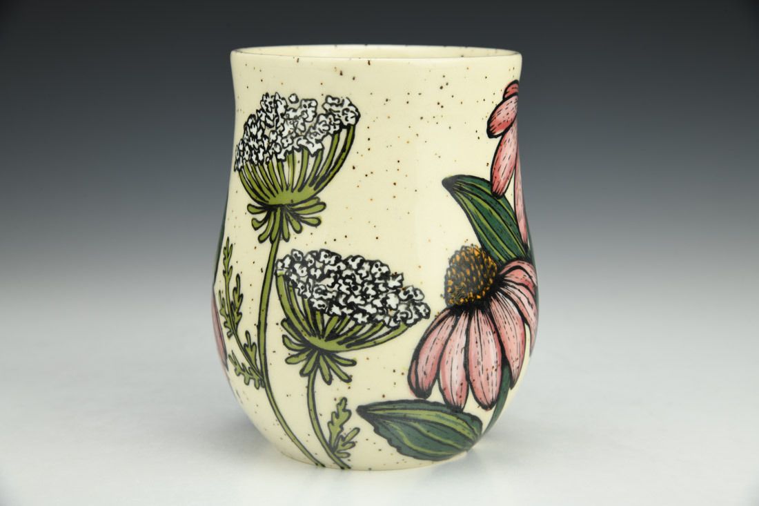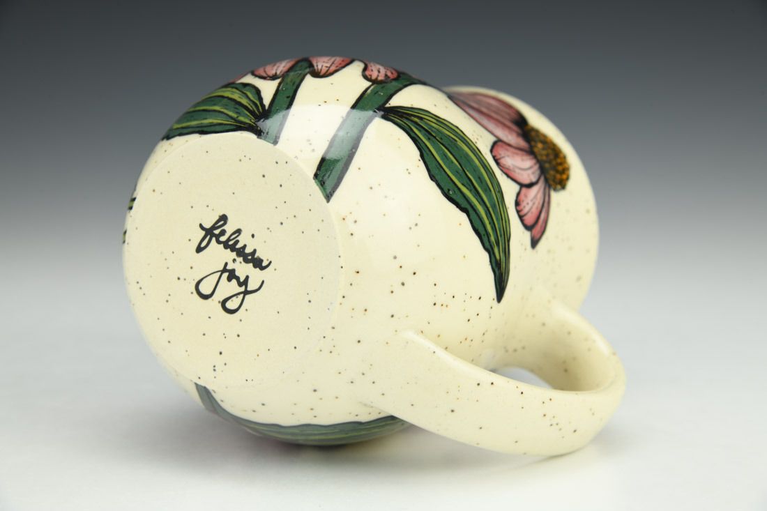Stoneware, wheel thrown, hand painted and slip-trailed underglaze, glaze, cone 6 electric fired, 4.5 x 5 x 4 inches.
