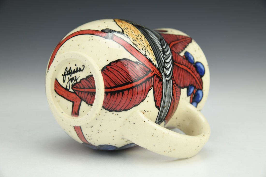 Stoneware, wheel thrown, hand painted and slip-trailed underglaze, glaze, cone 6 electric fired, 4.5 x 5 x 4 inches.