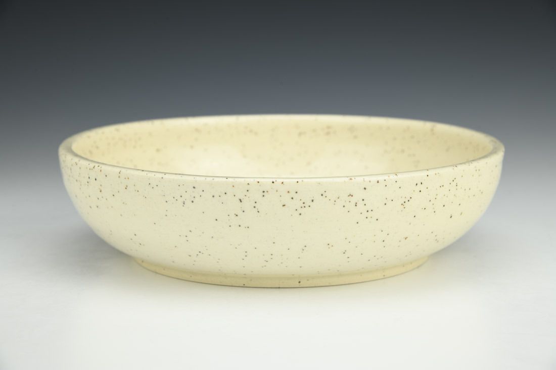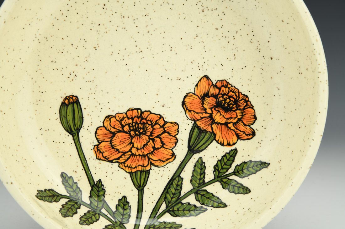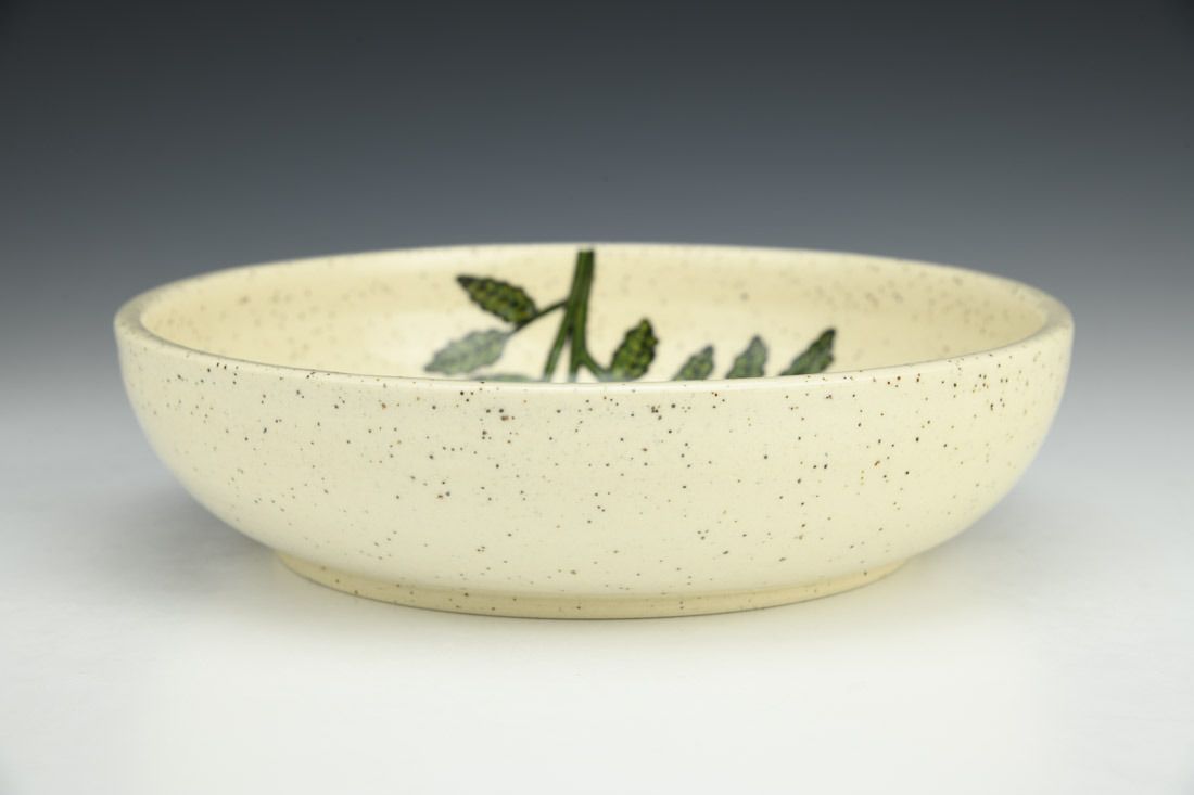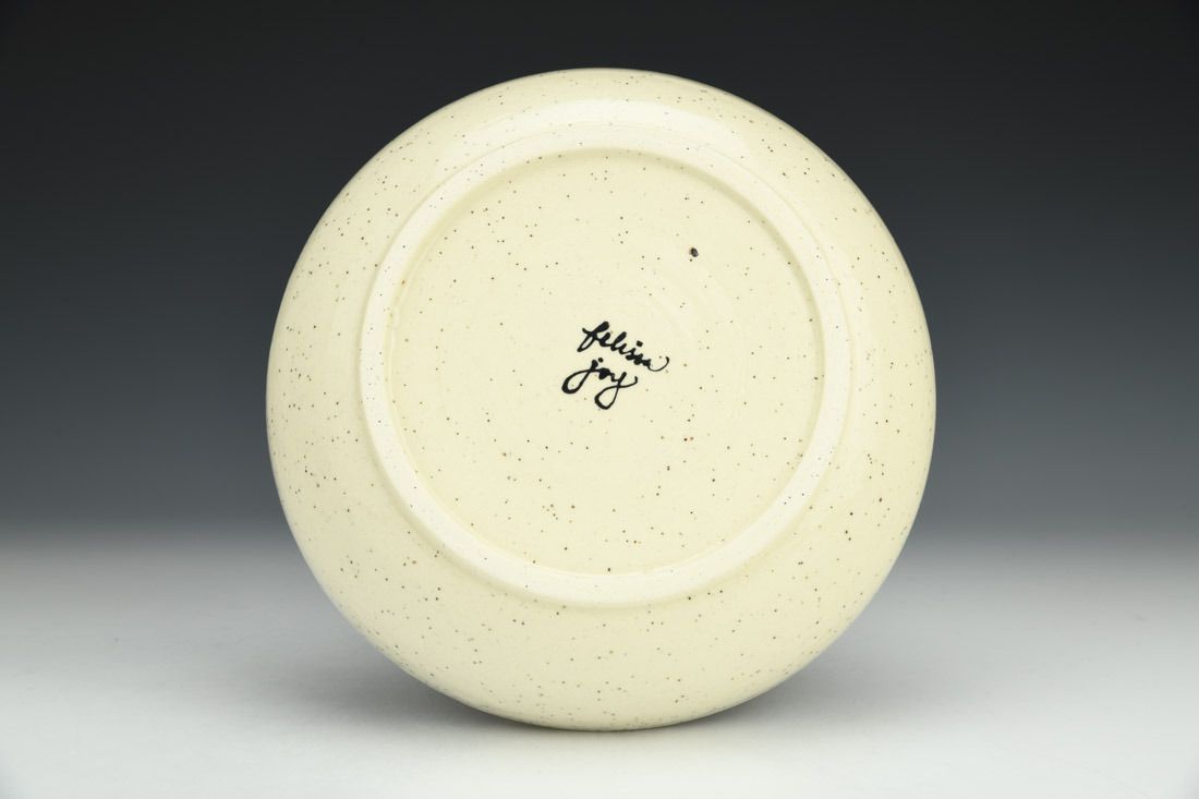 Stoneware, wheel thrown, hand painted and slip-trailed underglaze, glaze, cone 6 electric fired, 2 x 8.25 x 8.25 inches.