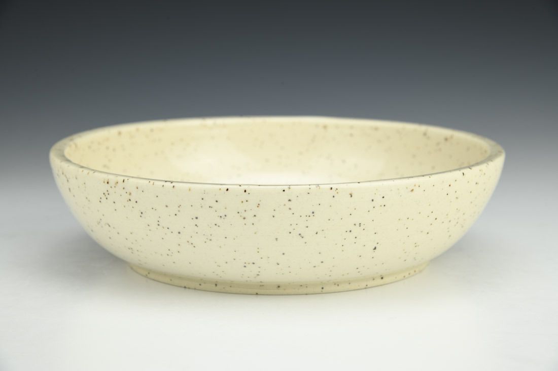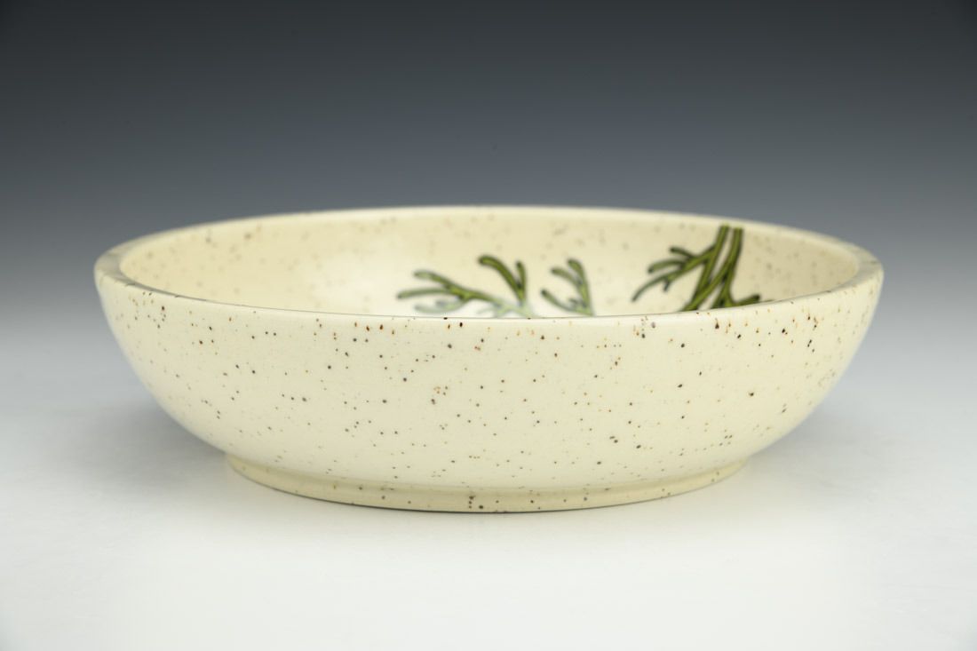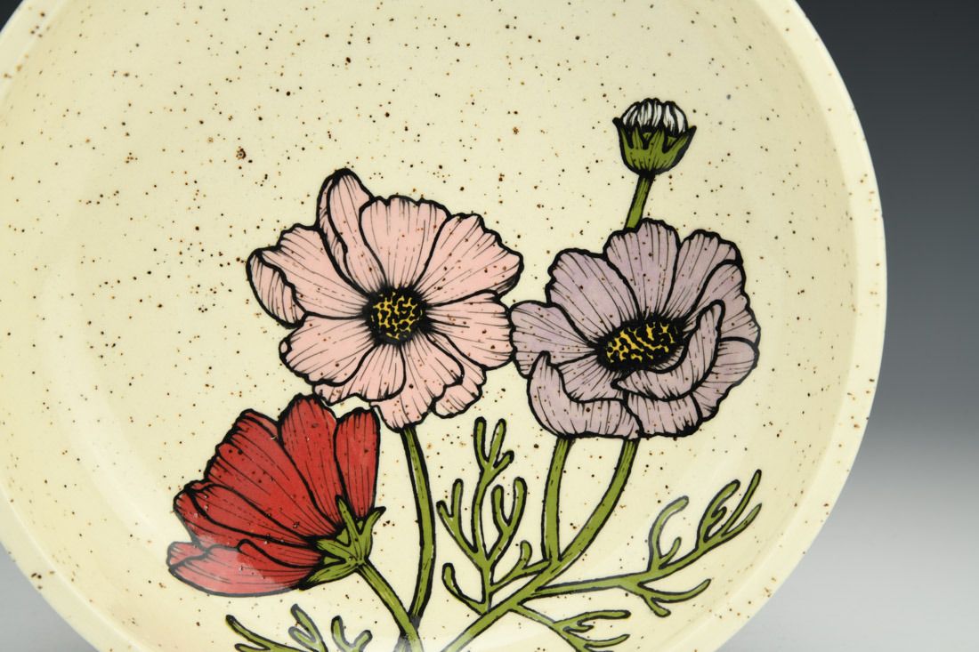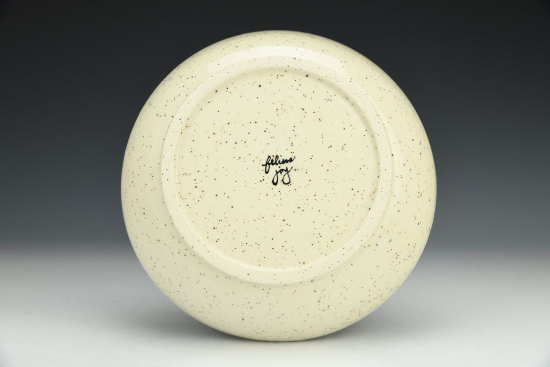 Stoneware, wheel thrown, hand painted and slip-trailed underglaze, glaze, cone 6 electric fired, 2 x 8.25 x 8.25 inches.