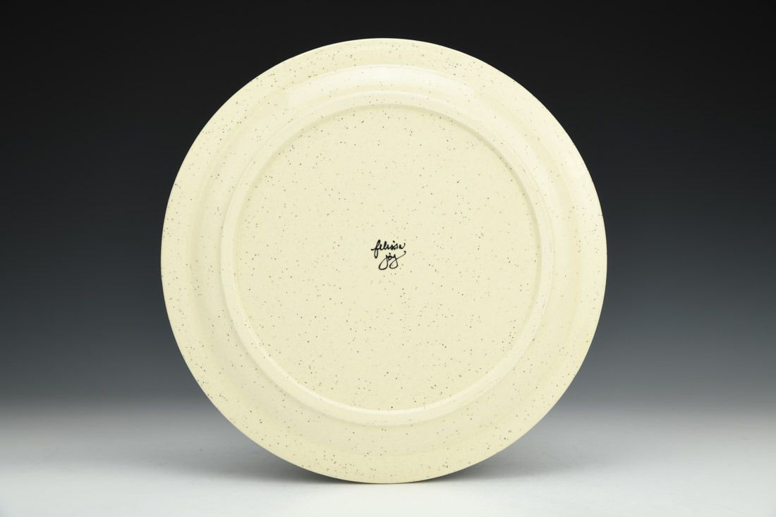 Stoneware, wheel thrown, hand painted and slip-trailed underglaze, glaze, cone 6 electric fired, 0.75 x 10.5 x 10.5 inches.