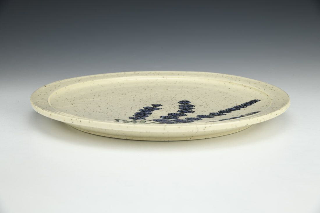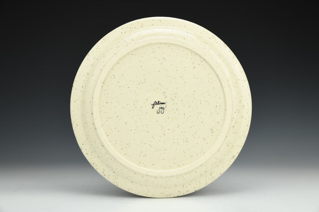 Stoneware, wheel thrown, hand painted and slip-trailed underglaze, glaze, cone 6 electric fired, 0.75 x 10.5 x 10.5 inches.