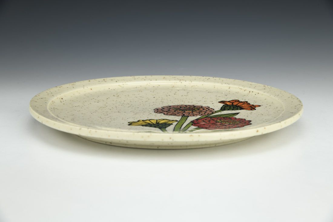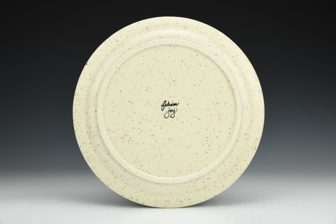 Stoneware, wheel thrown, hand painted and slip-trailed underglaze, glaze, cone 6 electric fired, 0.75 x 10.5 x 10.5 inches.