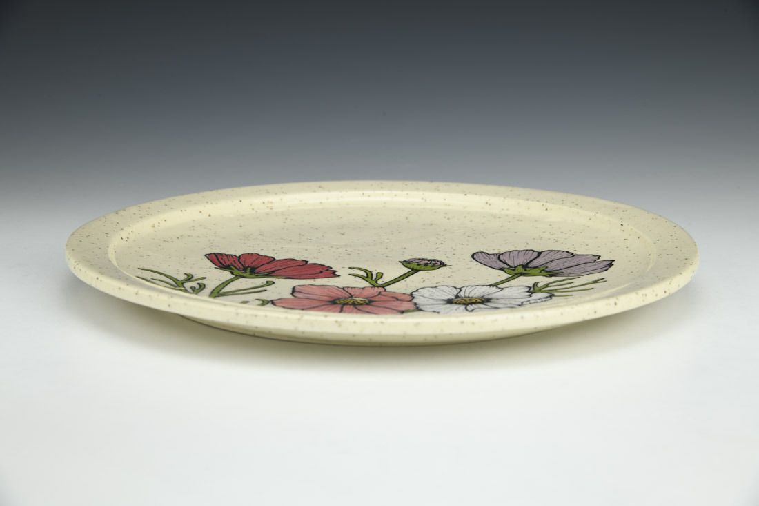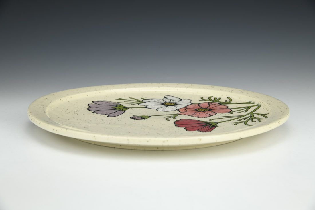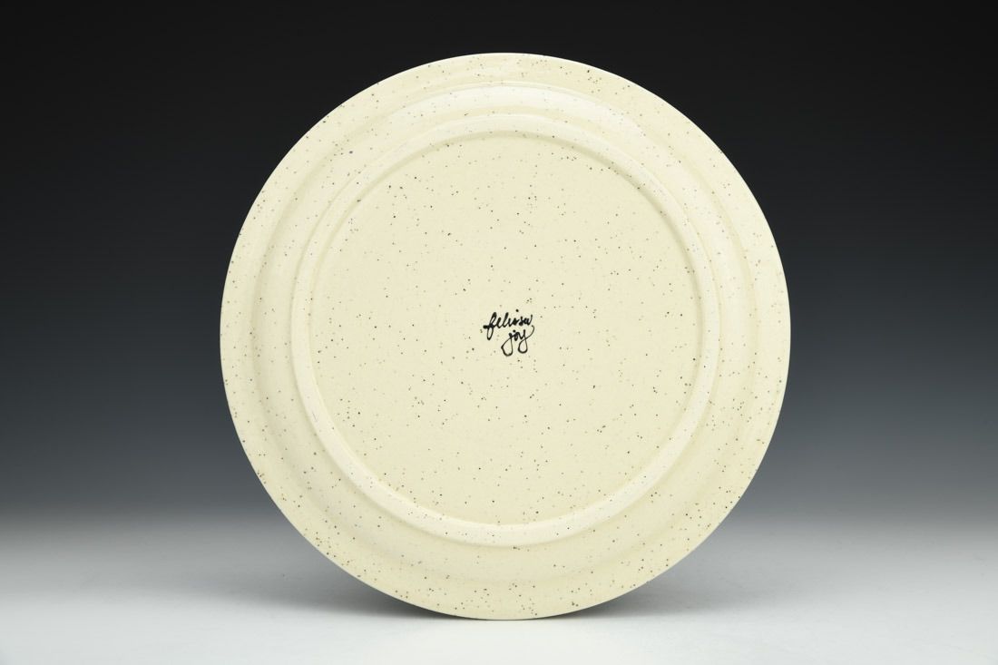 Stoneware, wheel thrown, hand painted and slip-trailed underglaze, glaze, cone 6 electric fired, 0.75 x 10.5 x 10.5 inches.