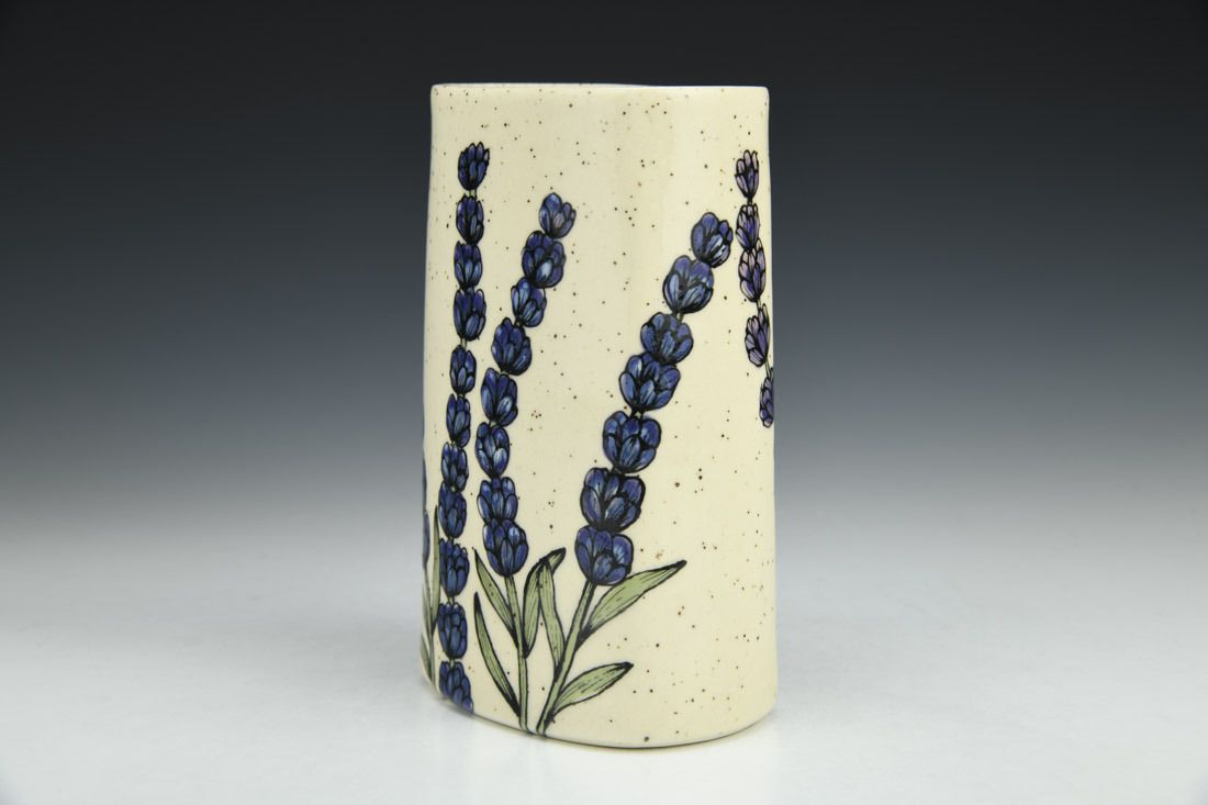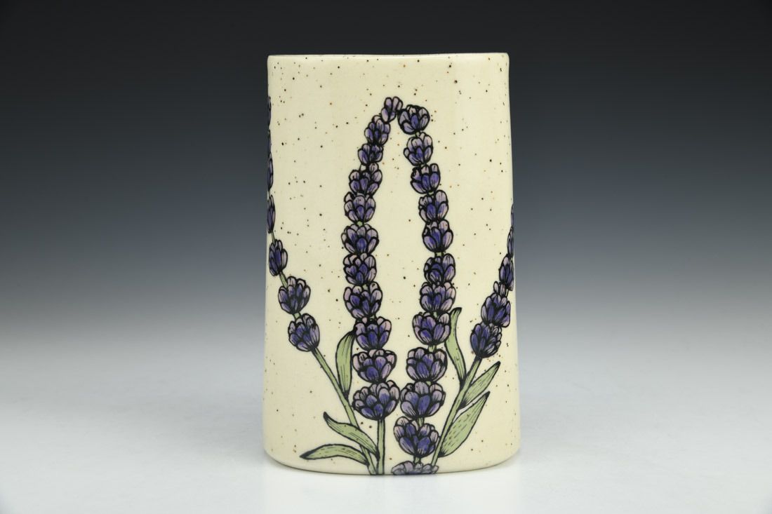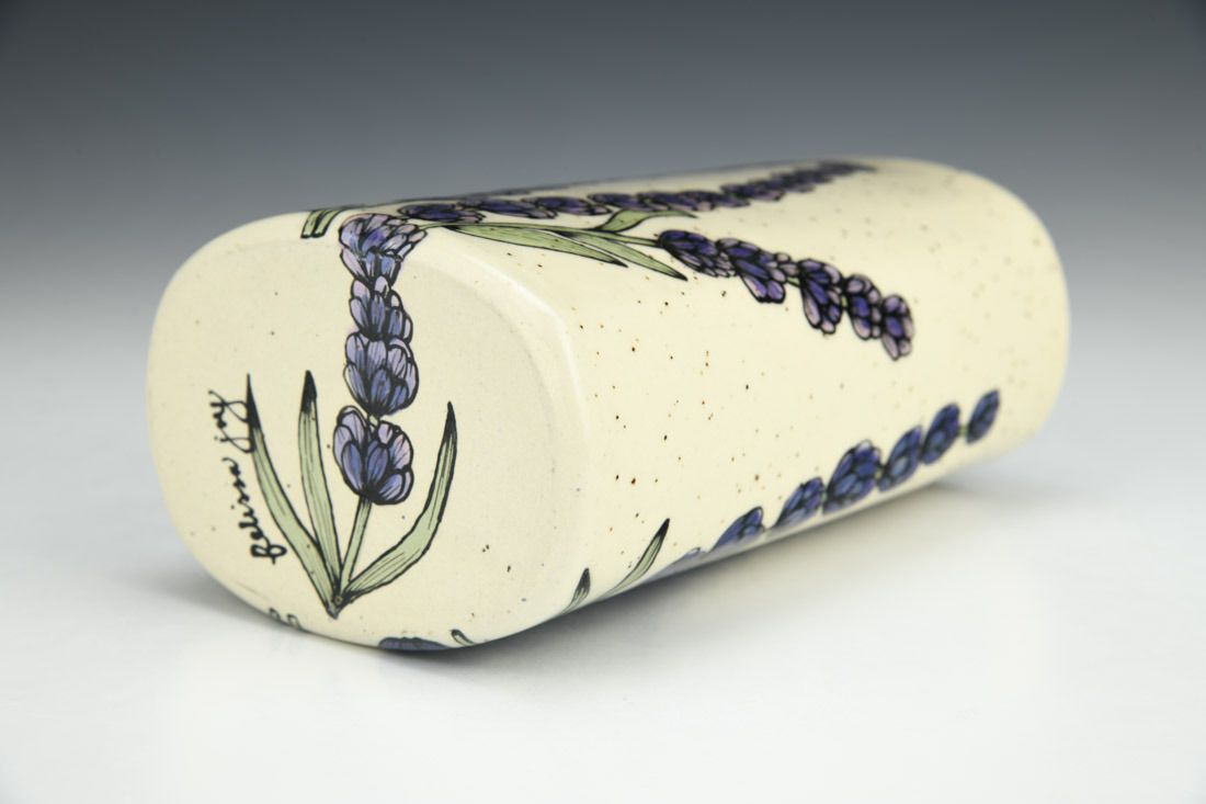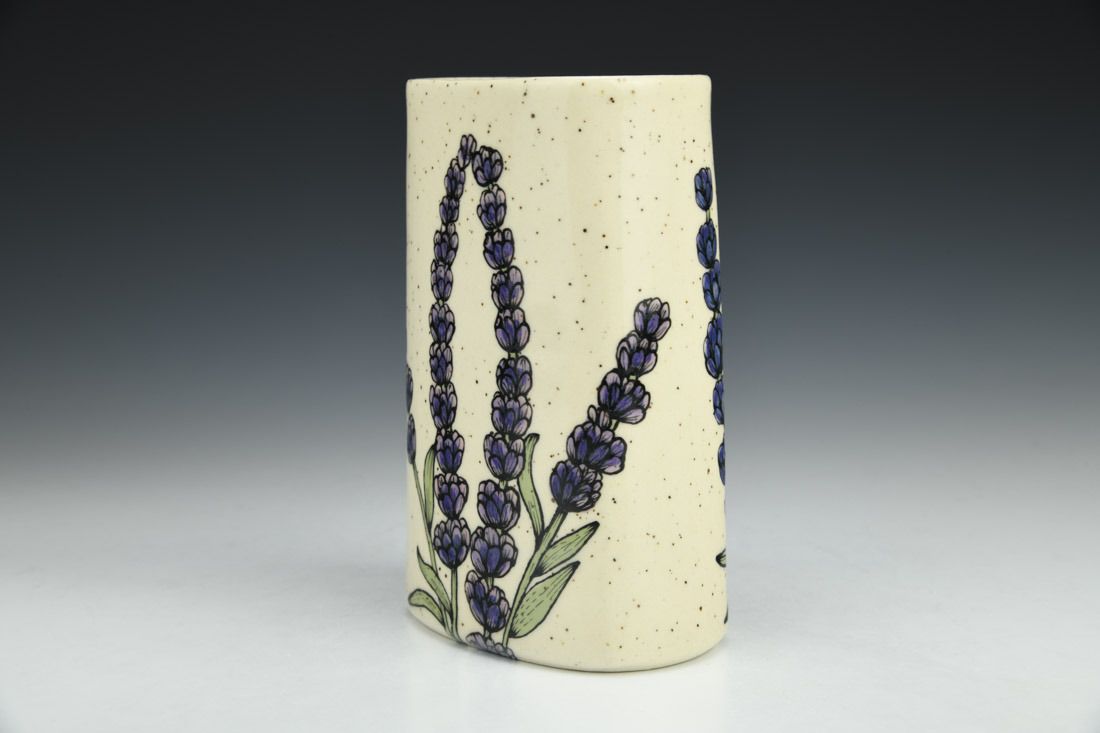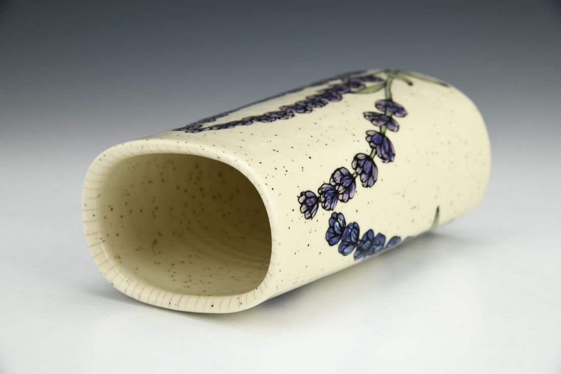 Stoneware, wheel thrown, hand painted and slip-trailed underglaze, glaze, mishima, cone 6 electric fired, 5.75 x 4 x 2.75 inches.
