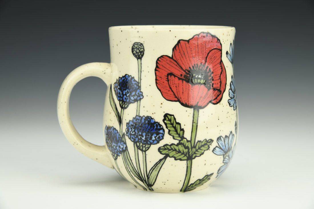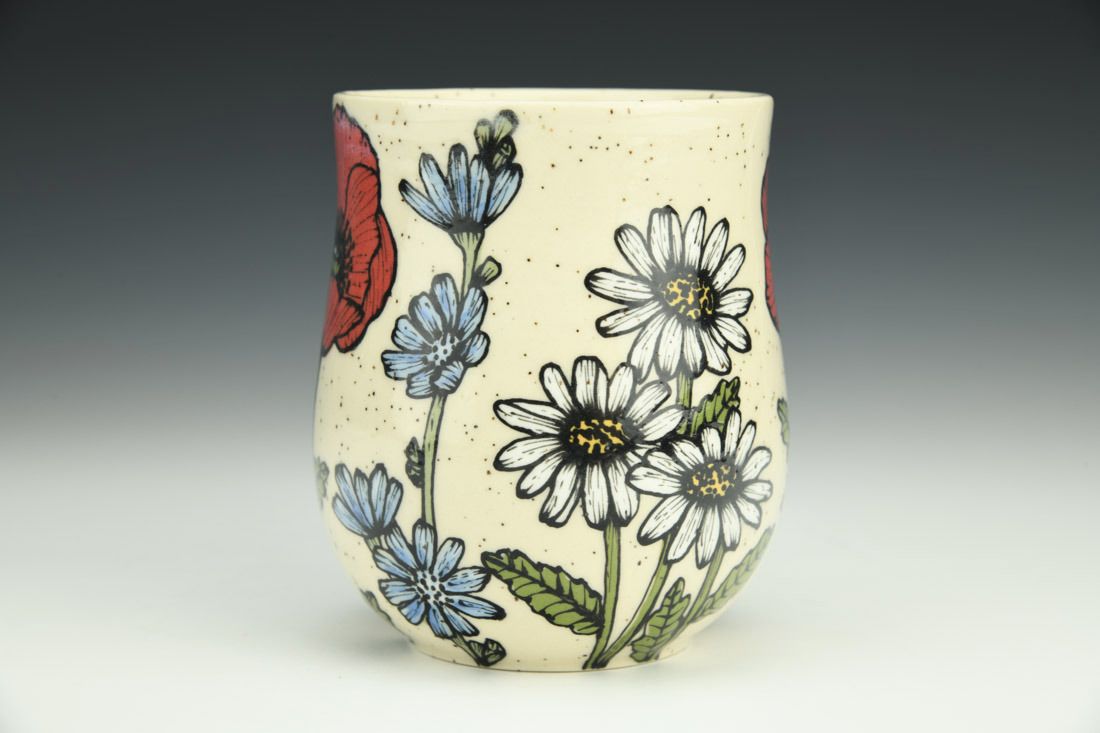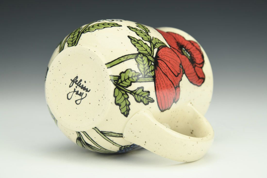 Stoneware, wheel thrown, hand painted and slip-trailed underglaze, glaze, cone 6 oxidation fired, 4.25 x 5 x 3.75 inches.