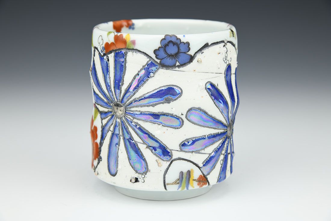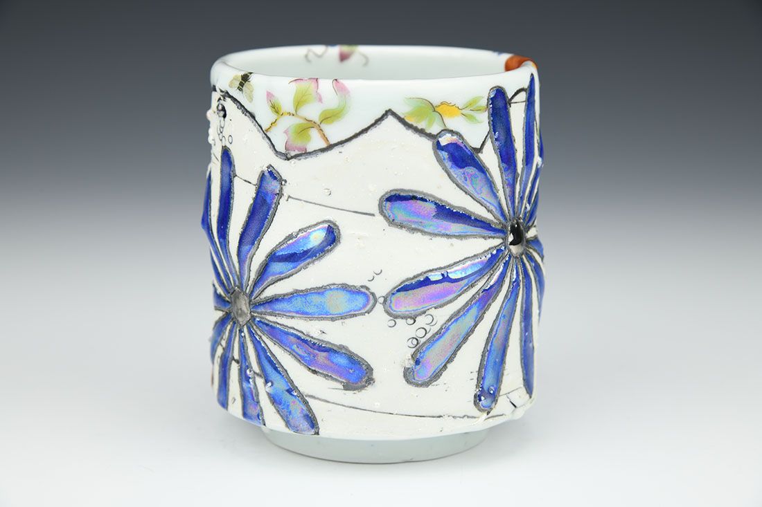 Porcelain with feldspar and molochite inclusions, wheel thrown, luster and decals, cone 10 reduction fired, multiple cone 017 firings, 3.75 x 3 x 3 inches.