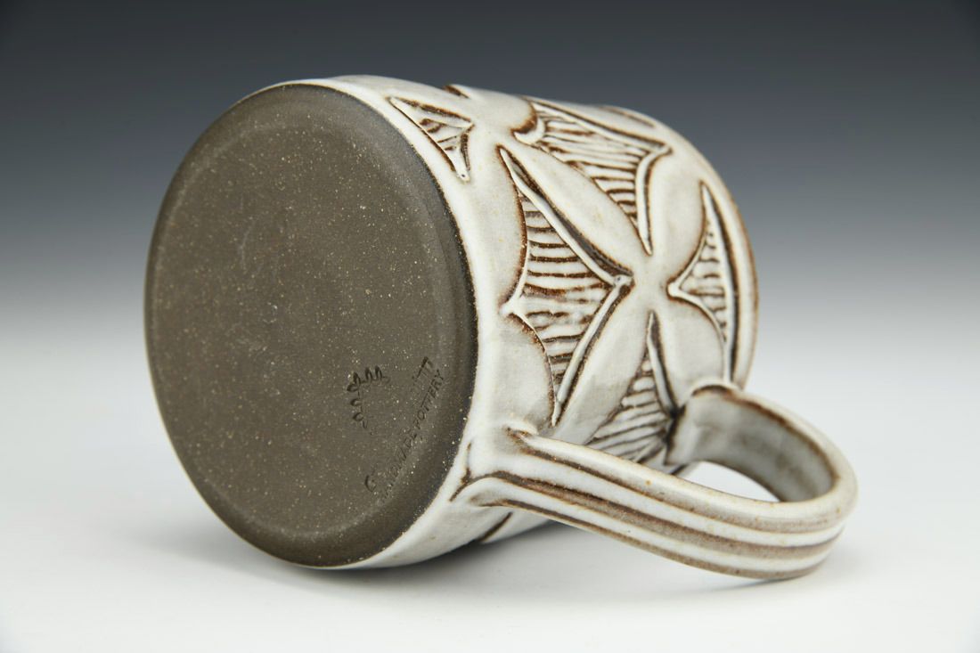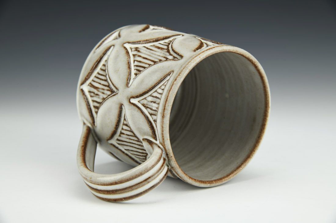 Stoneware, wheel thrown, hand carved, glaze, cone 6 electric fired, 3.75 x 5 x 3.5 inches.