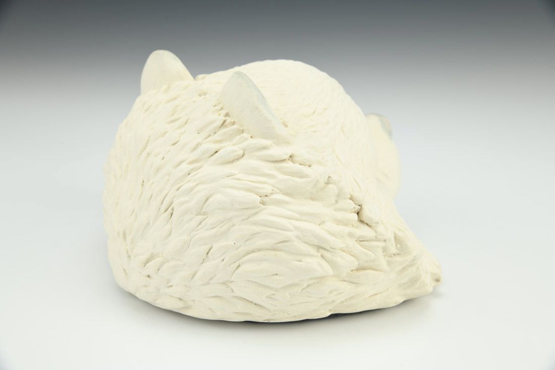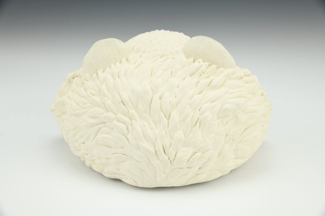 Porcelain and felt, handbuilt, underglaze, glaze, matte acrylic varnish, cone 6 oxidation fired, 3.75 x 6 x 5.25 inches.