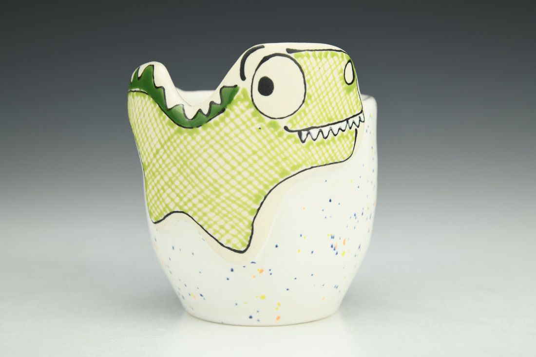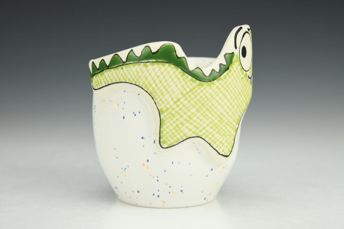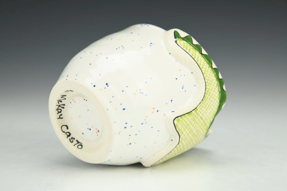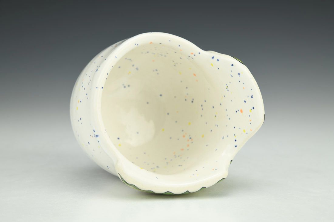 Porcelain, wheel thrown and hand built, underglaze, glaze, cone 5 oxidation fired, 3.75 x 3.5 x 3.25 inches.