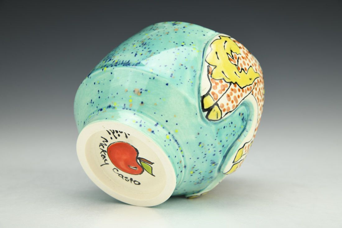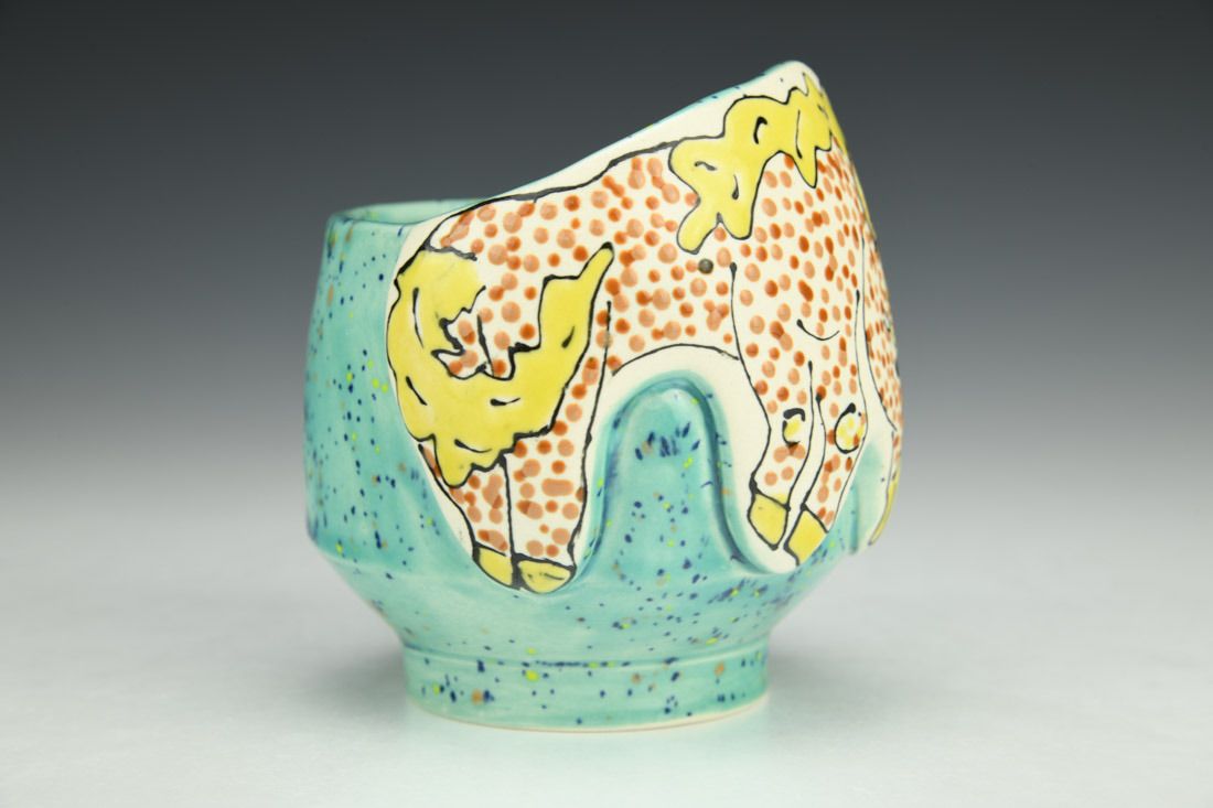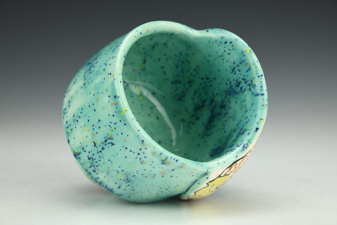 Porcelain, wheel thrown and hand built, underglaze, glaze, cone 5 oxidation fired, 4 x 4 x 3.5 inches.
