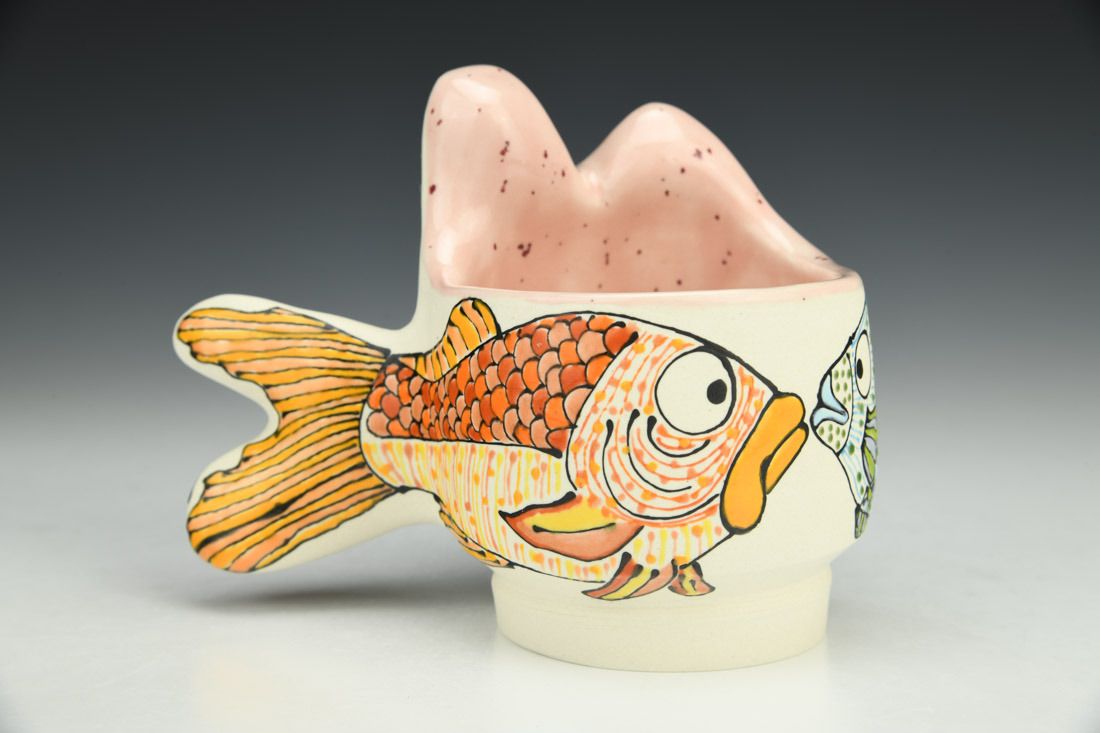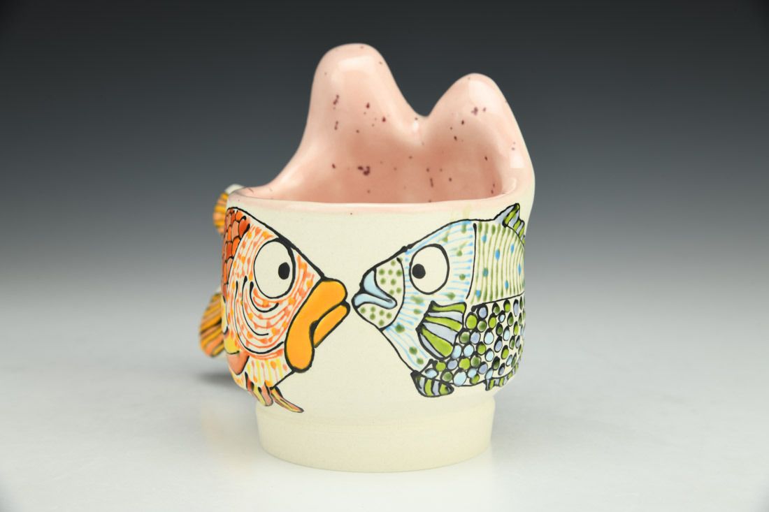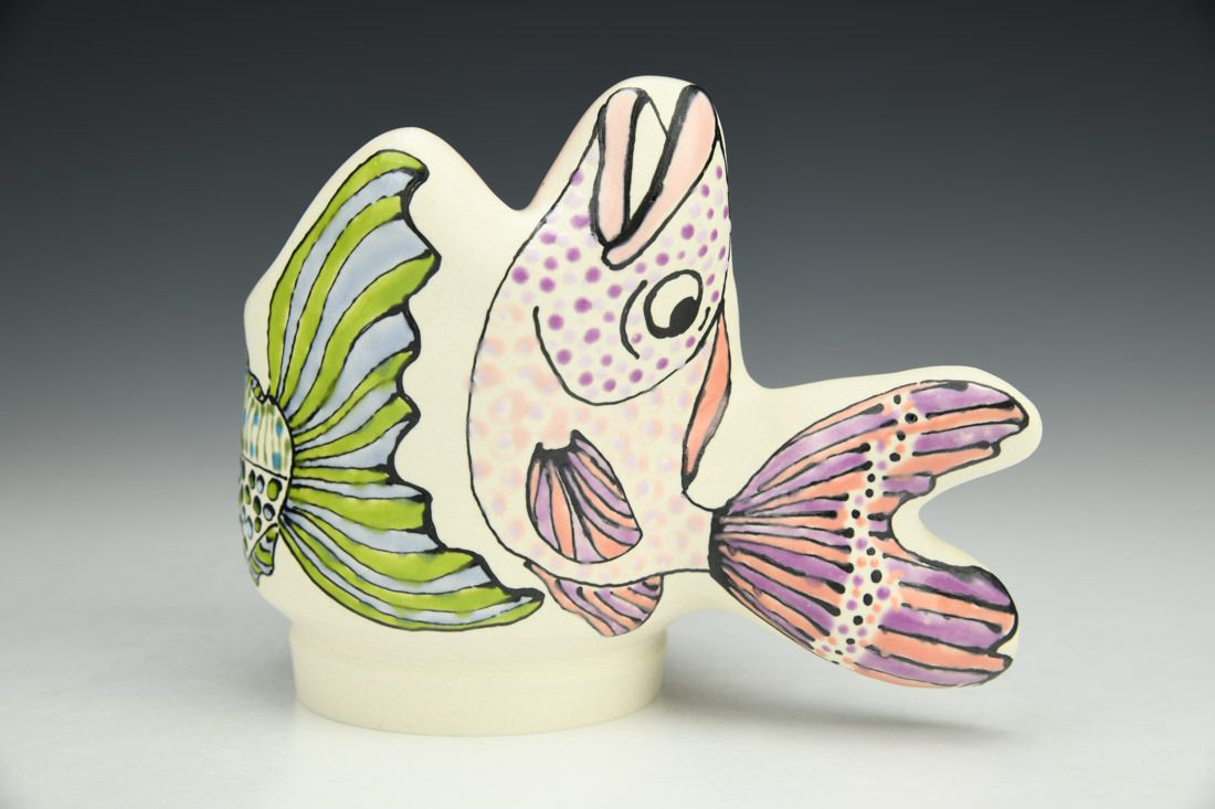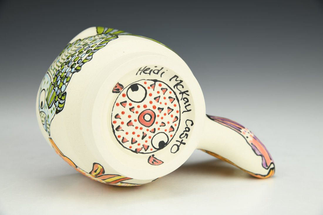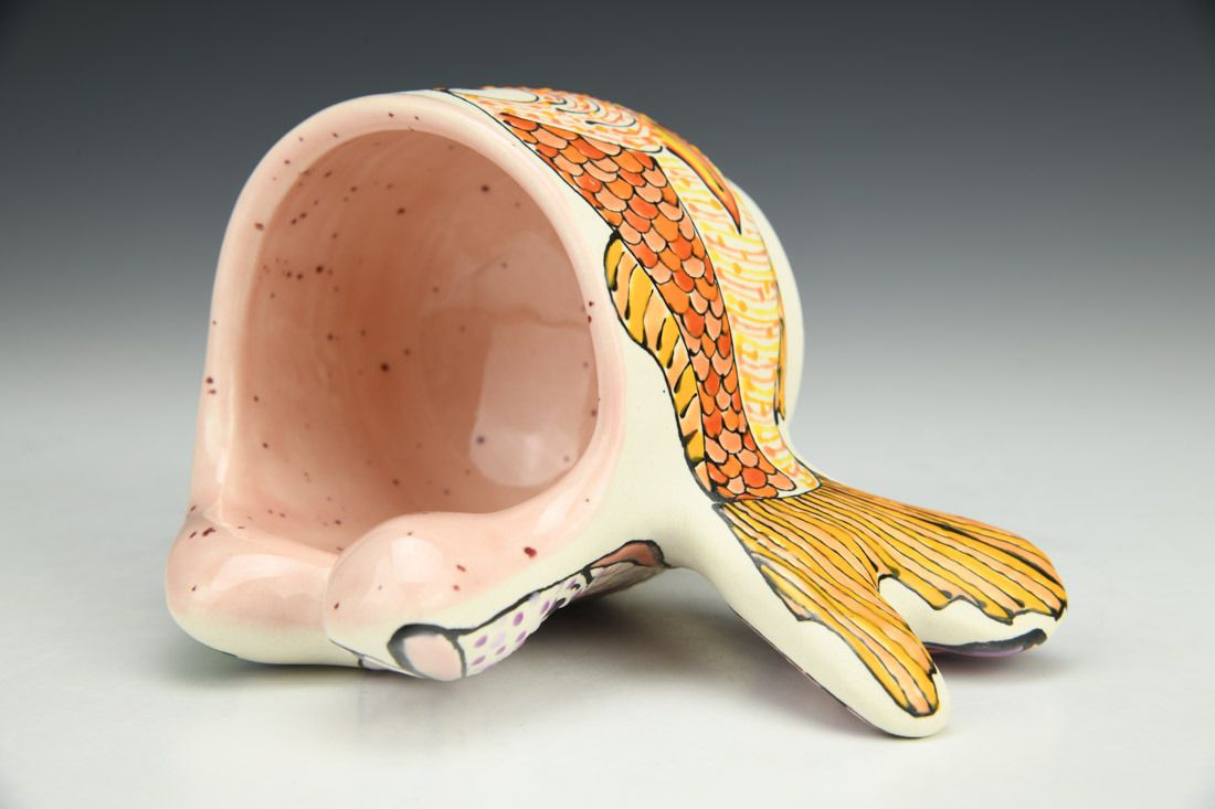 Porcelain, wheel thrown and hand built, underglaze, glaze, cone 5 oxidation fired, 4.5 x 6 x 4 inches.