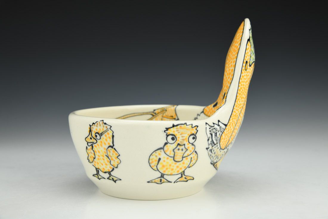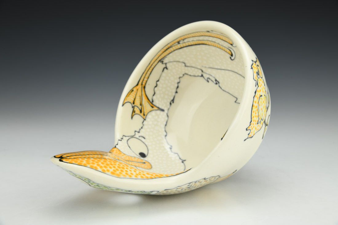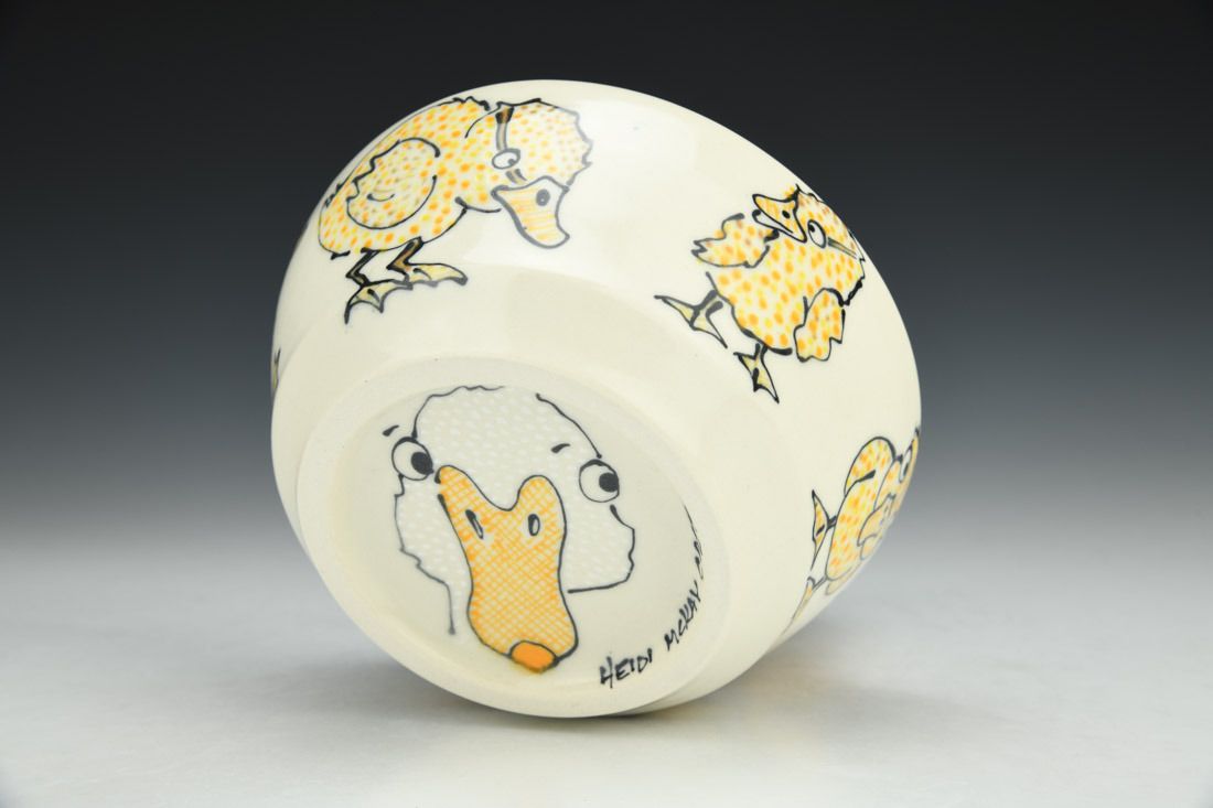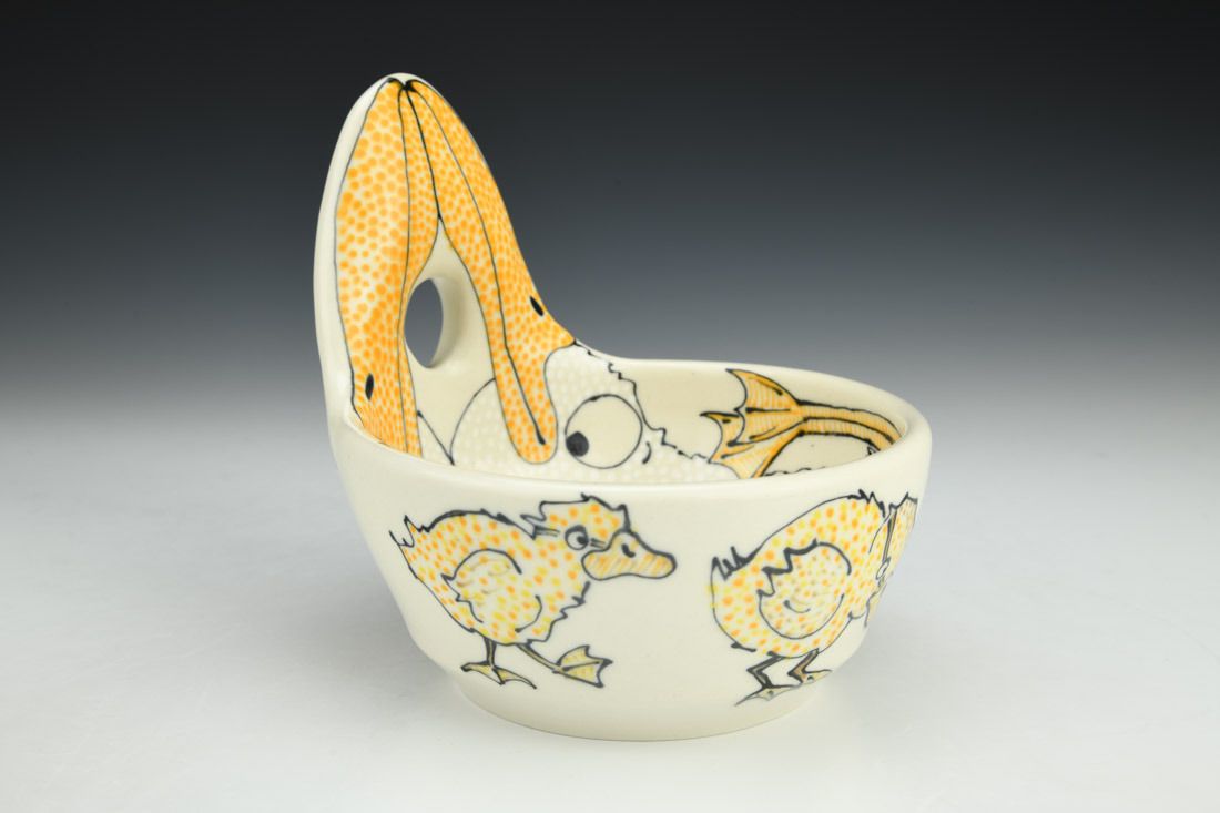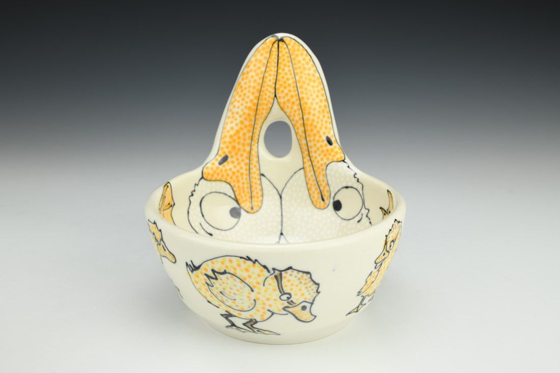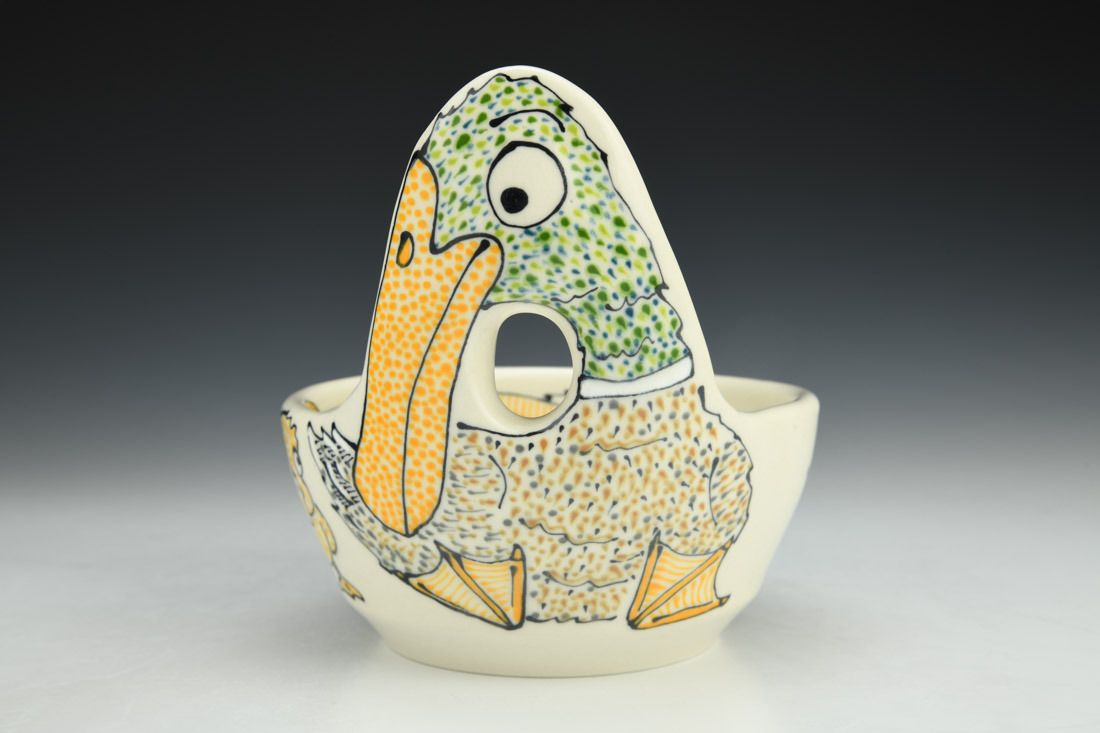 Porcelain, wheel thrown and hand built, underglaze, glaze, cone 5 oxidation fired, 5.5 x 5.5 x 6 inches.