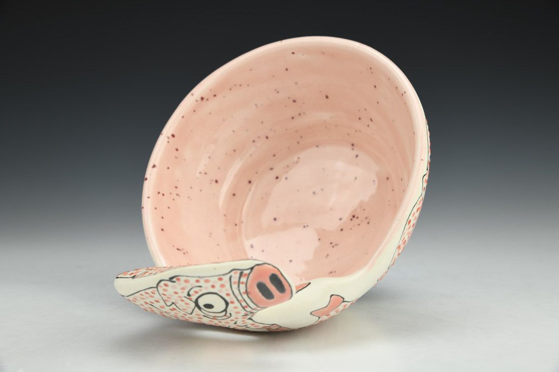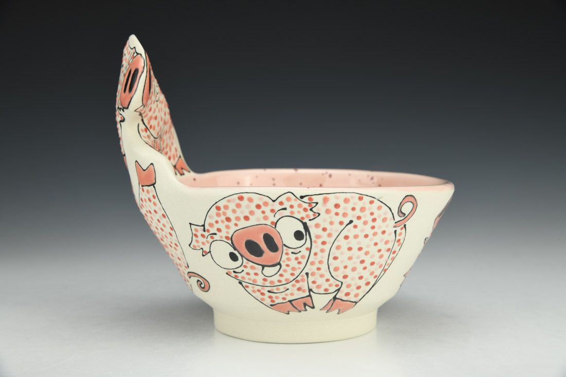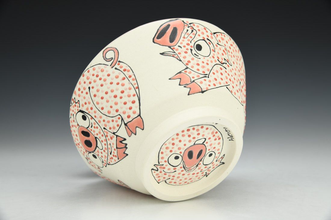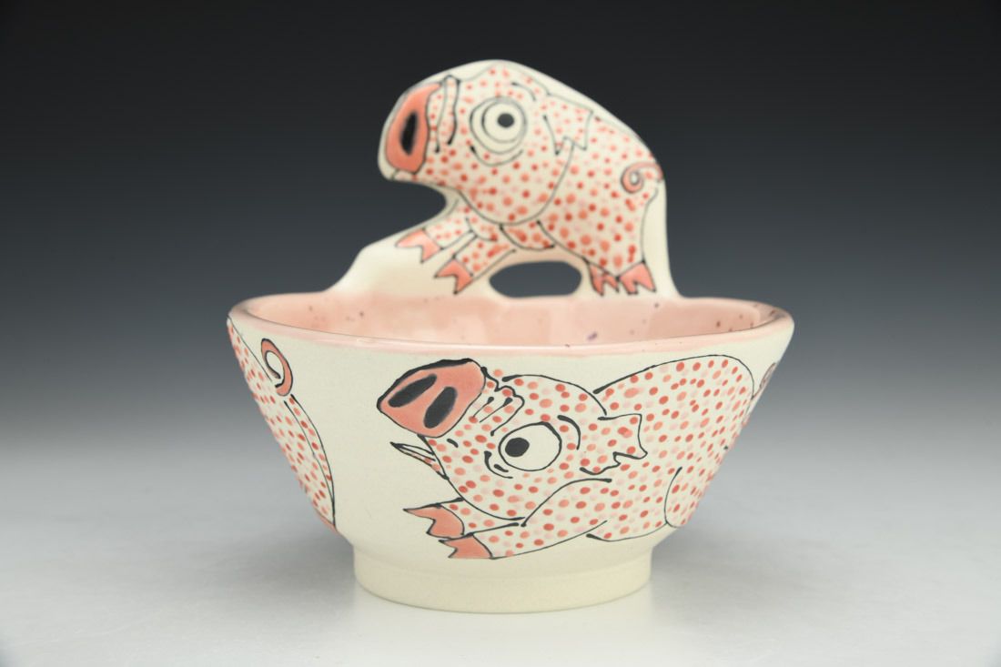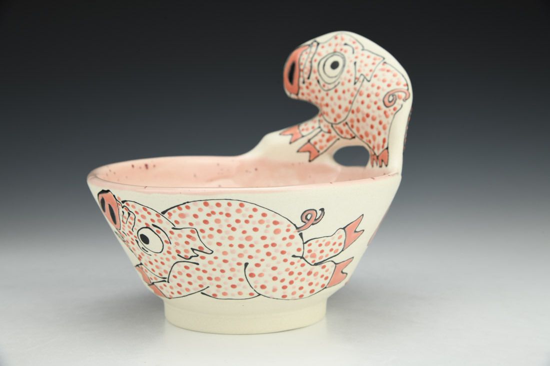 Porcelain, wheel thrown and hand built, underglaze, glaze, cone 5 oxidation fired, 5.5 x 5.5 x 6 inches.