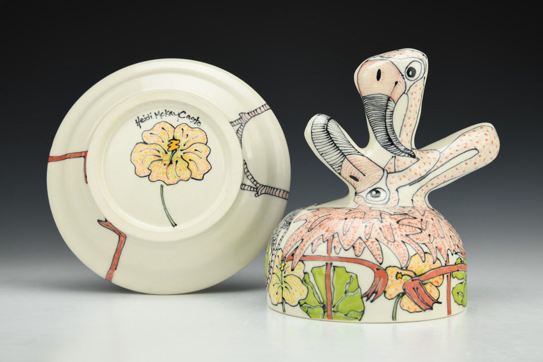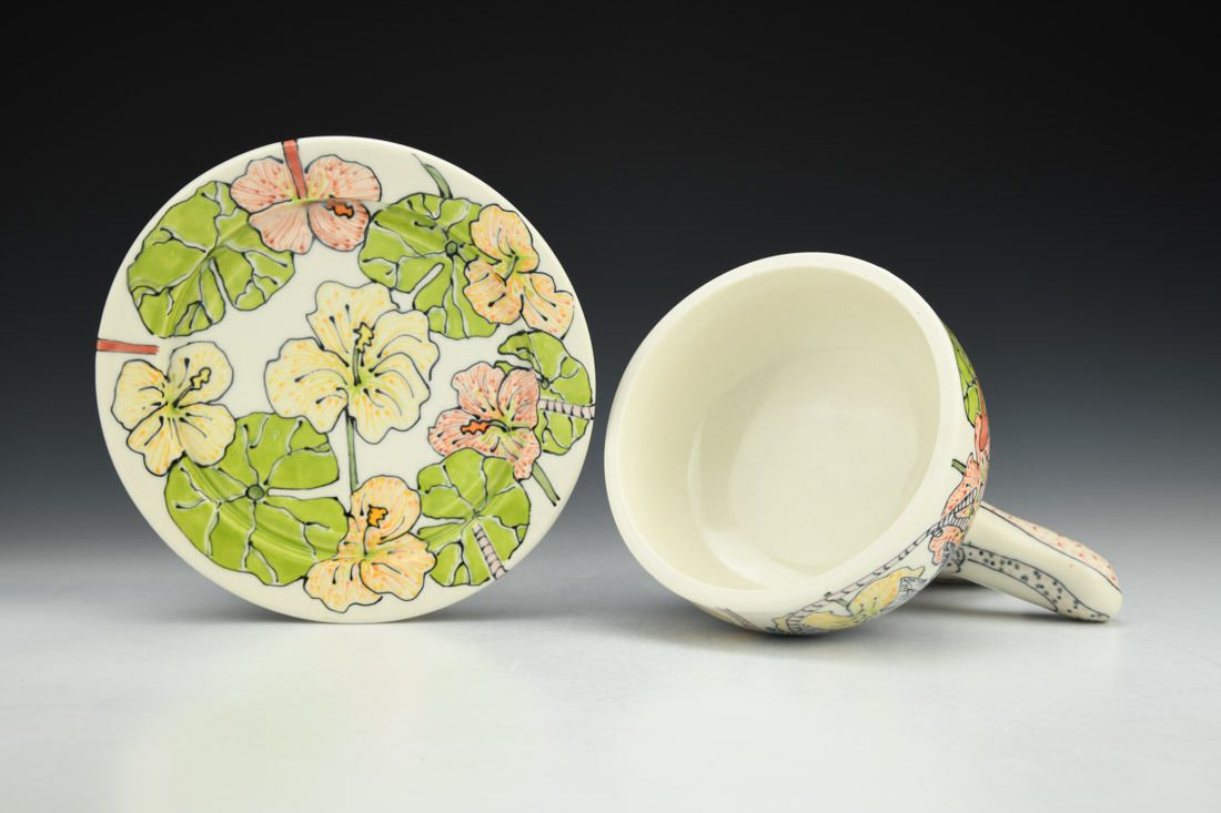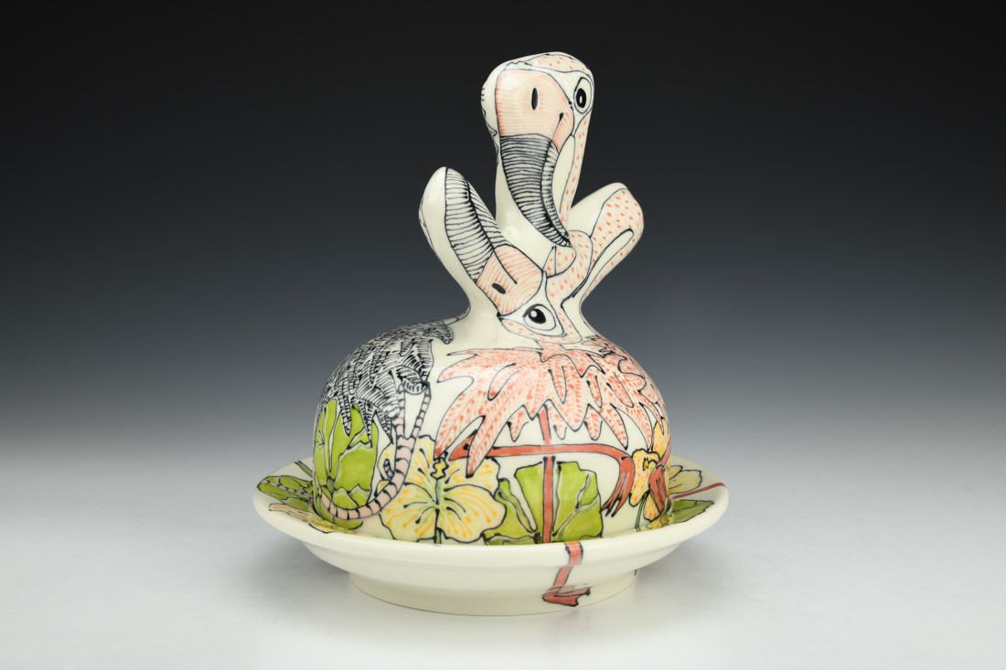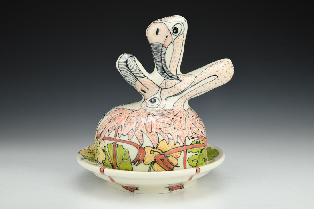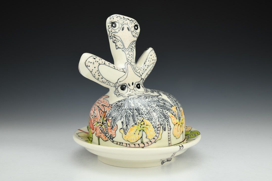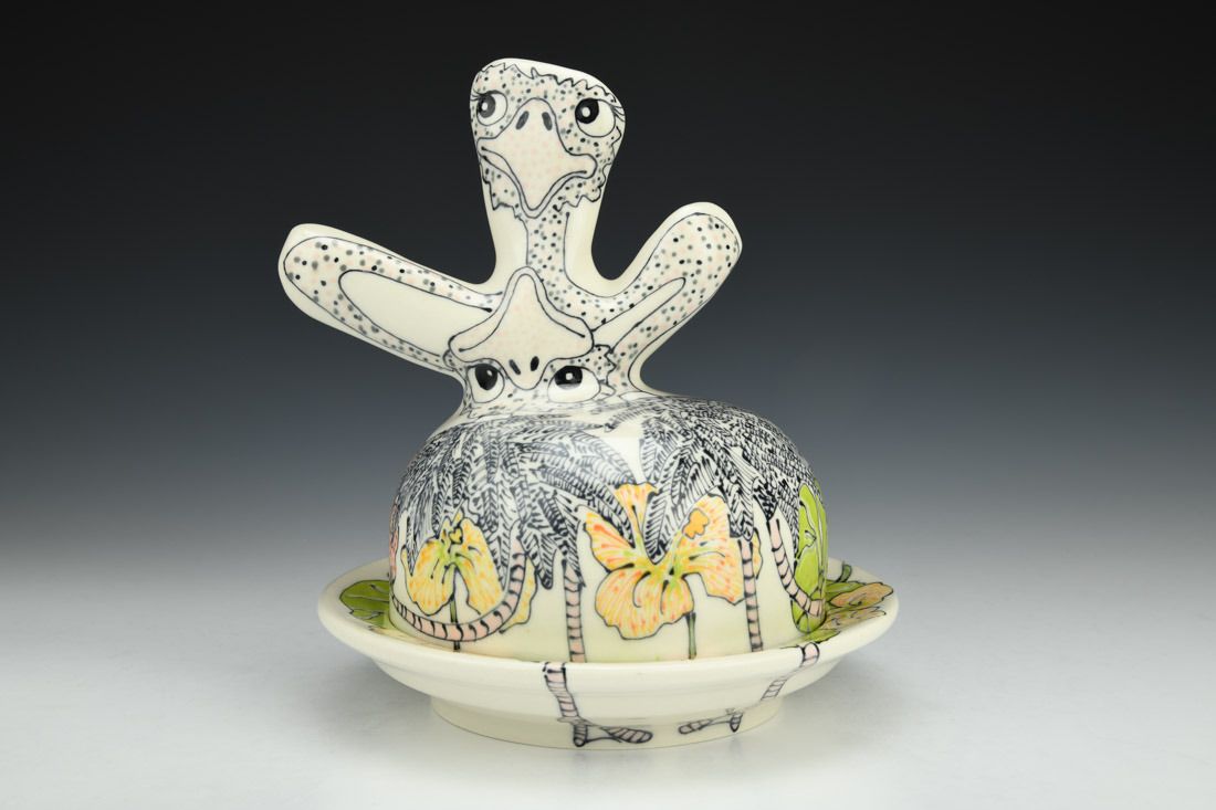 Porcelain, wheel thrown and hand built, underglaze, glaze, cone 5 oxidation fired, 8 x 7 x 7 inches.