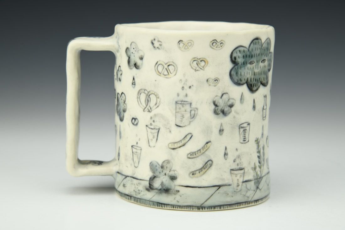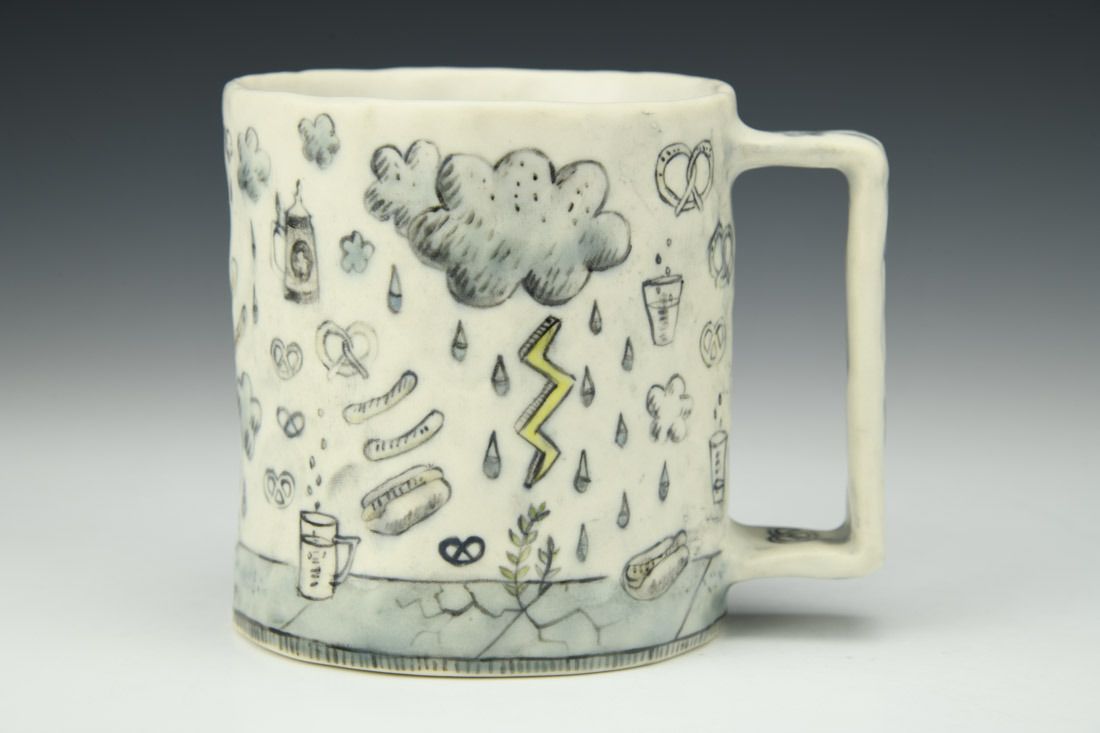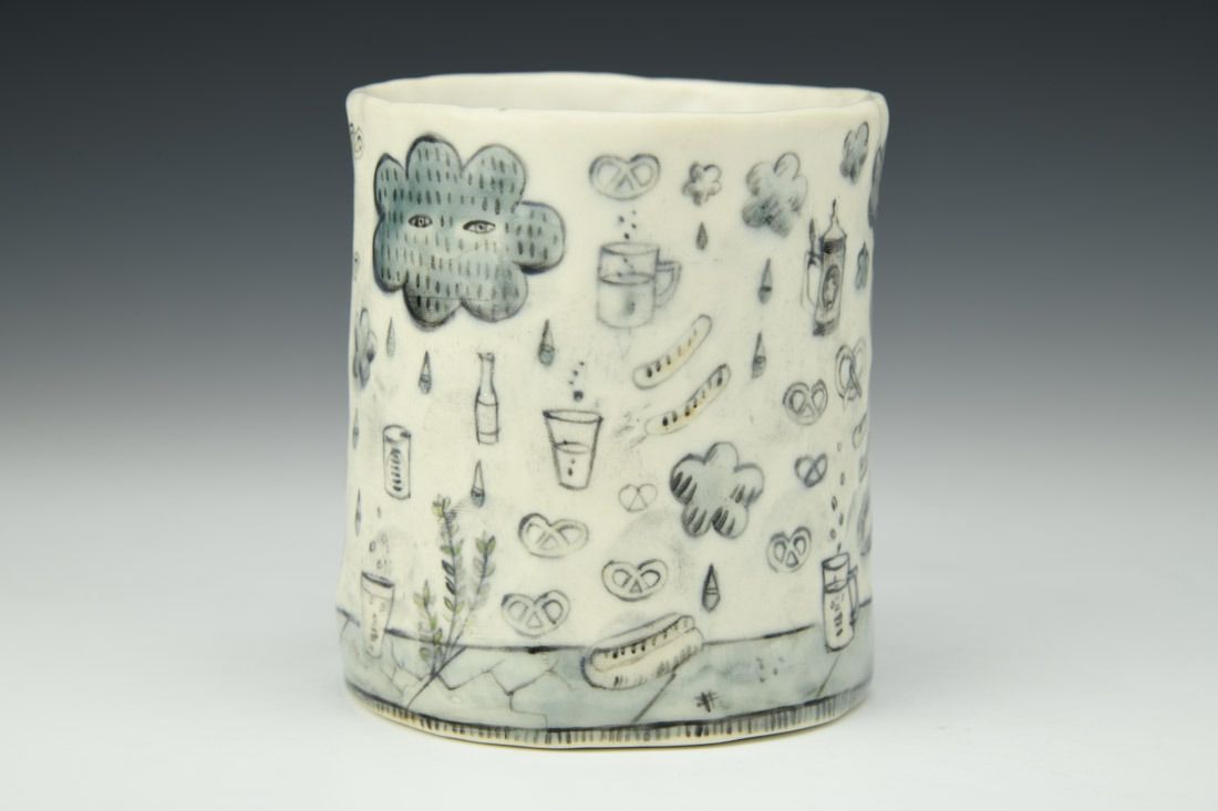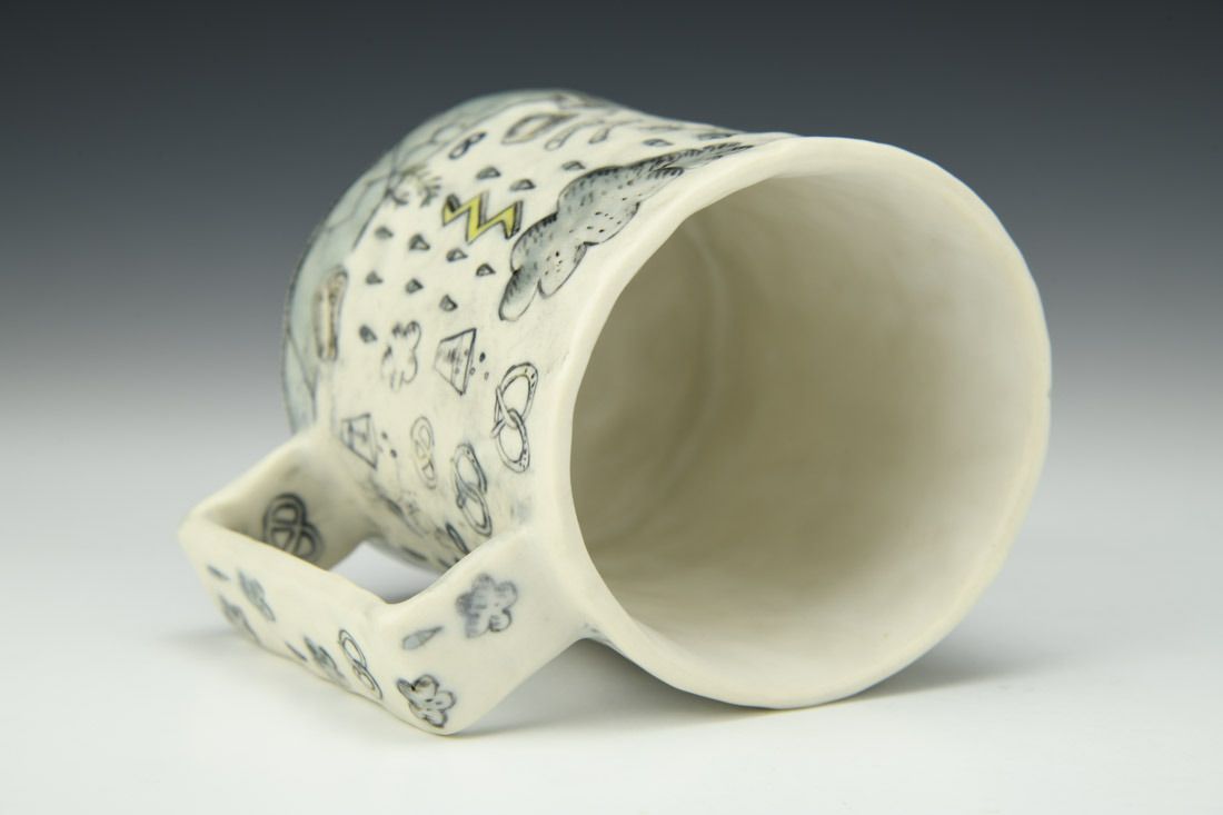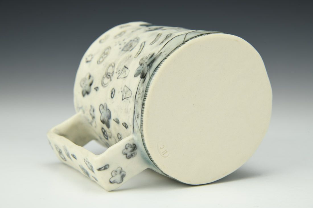 Porcelain, hand built with slabs and pinched, underglaze, glaze, cone 6 oxidation fired, 3.5 x 4.5 x 3.5 inches.