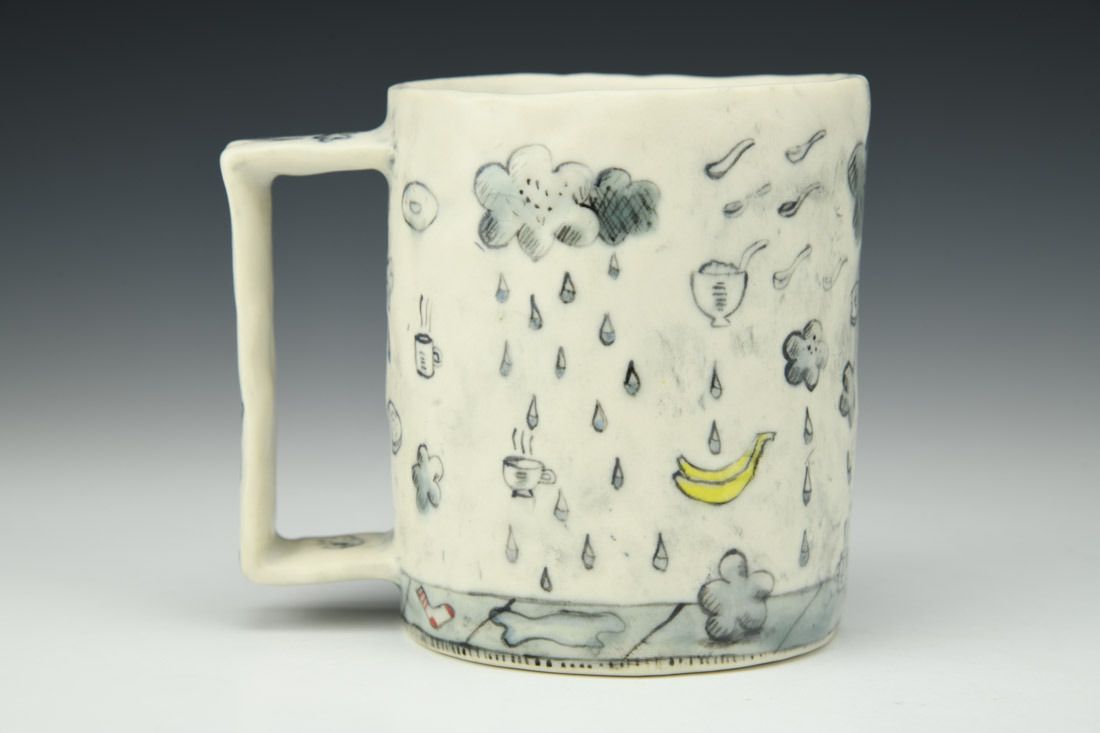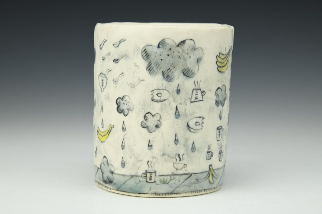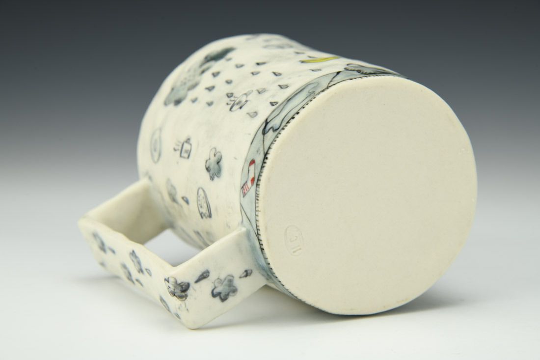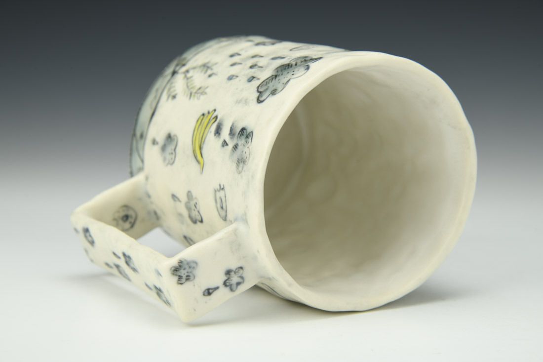 Porcelain, hand built with slabs and pinched, underglaze, glaze, cone 6 oxidation fired, 4 x 4.5 x 3.5 inches.