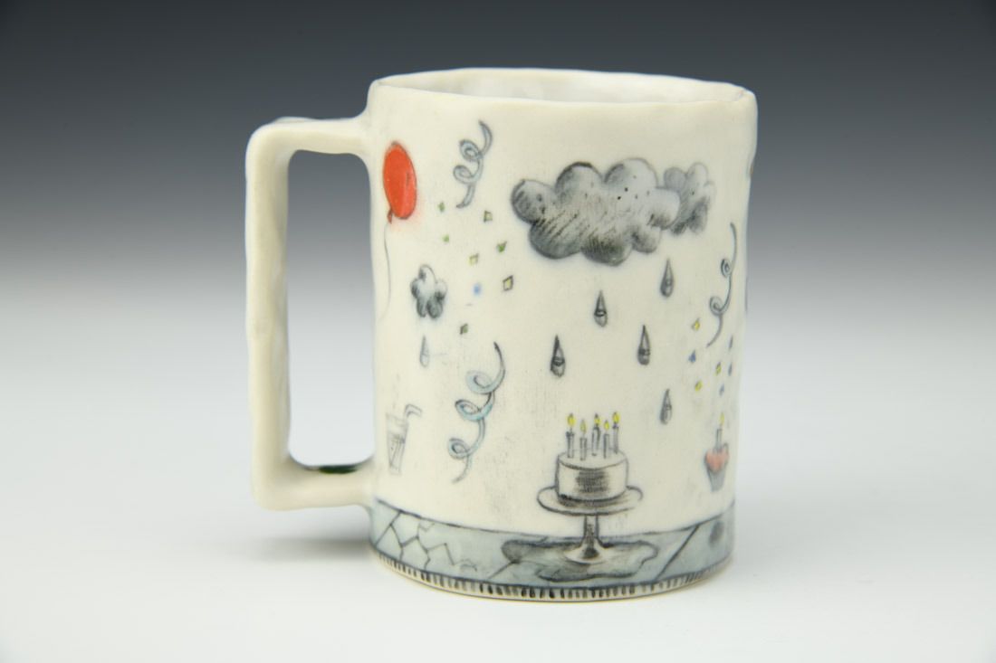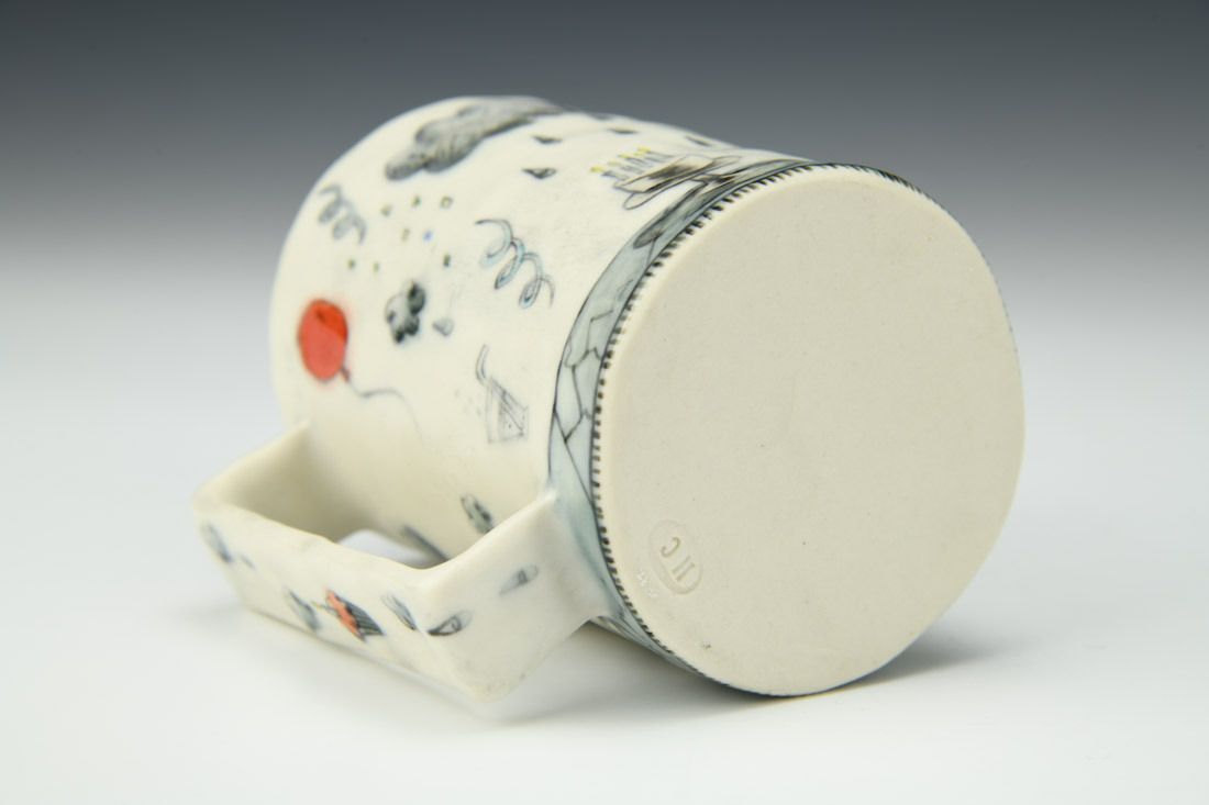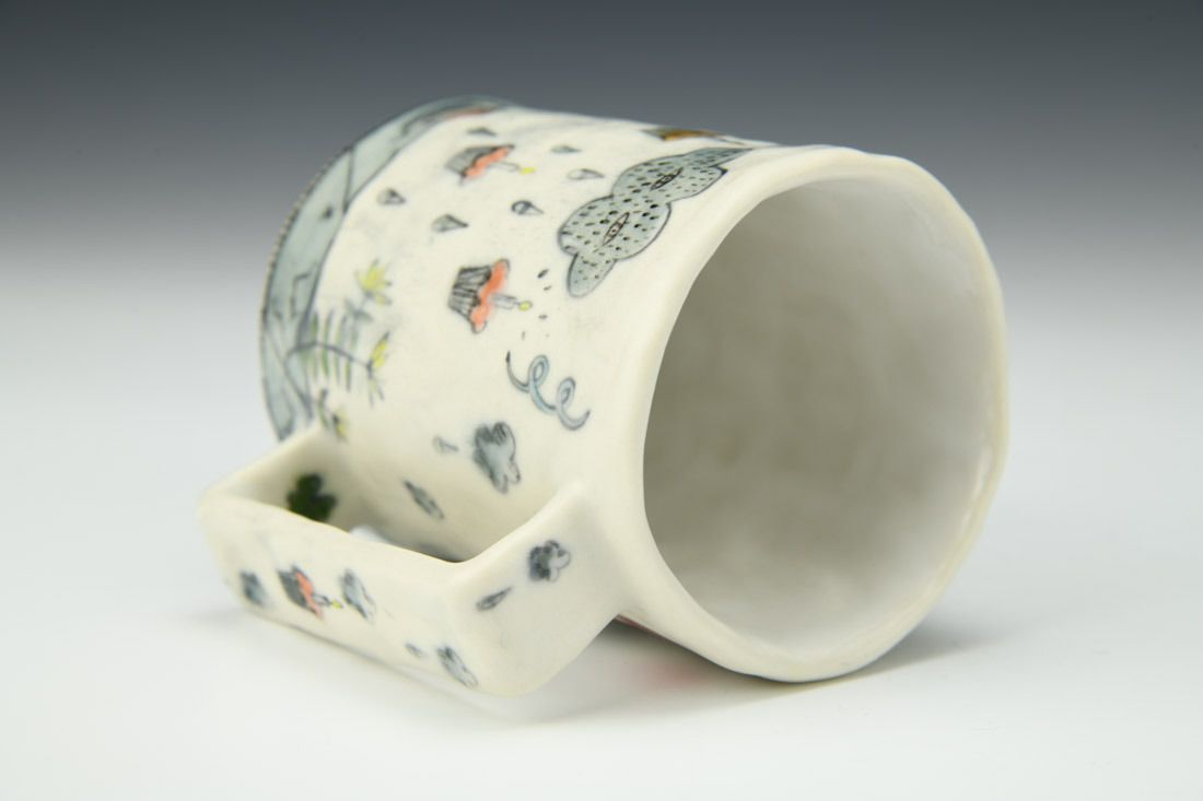 Porcelain, hand built with slabs and pinched, underglaze, glaze, cone 6 oxidation fired, 3.25 x 3.5 x 2.5 inches.