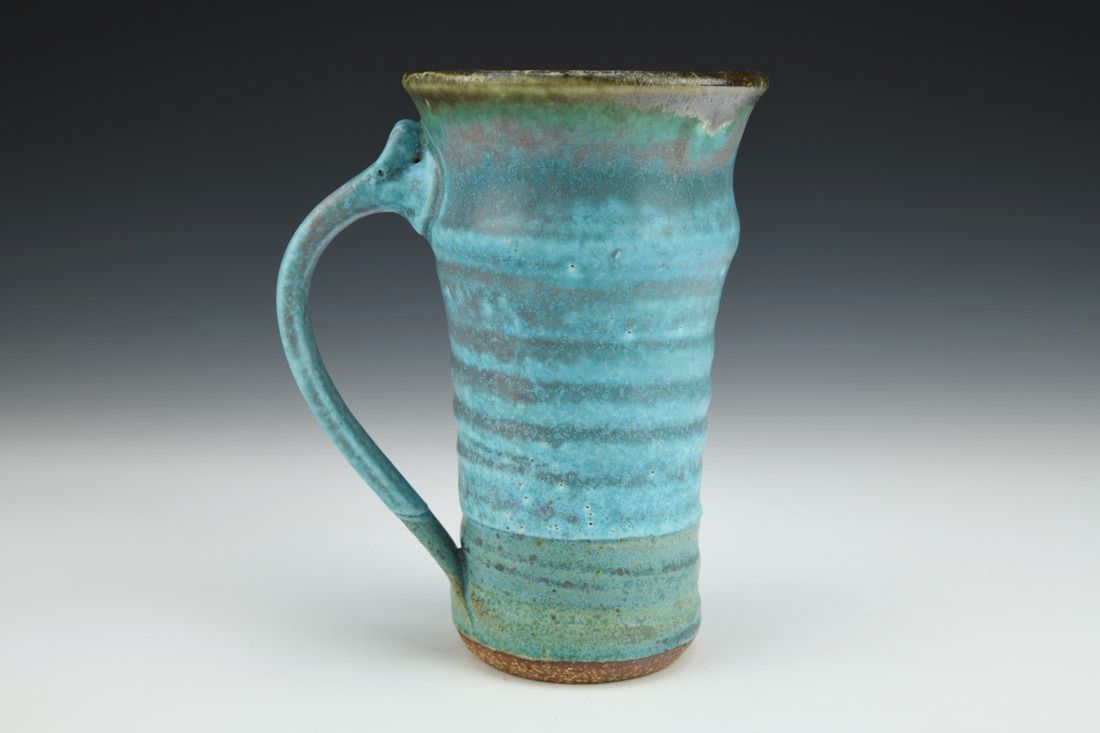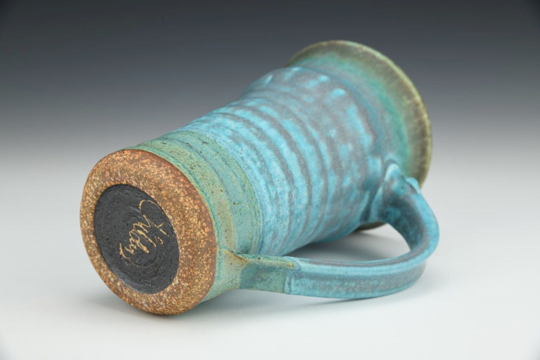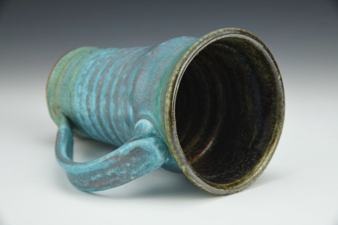 Stoneware, wheel thrown, porcelain slip, copper blue glaze, iron saturated Tenmoku glaze, cone 9 gas reduction fired, 6.5 x 5.5 x 4 inches.