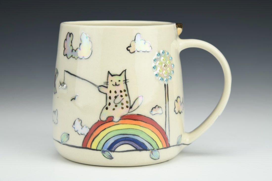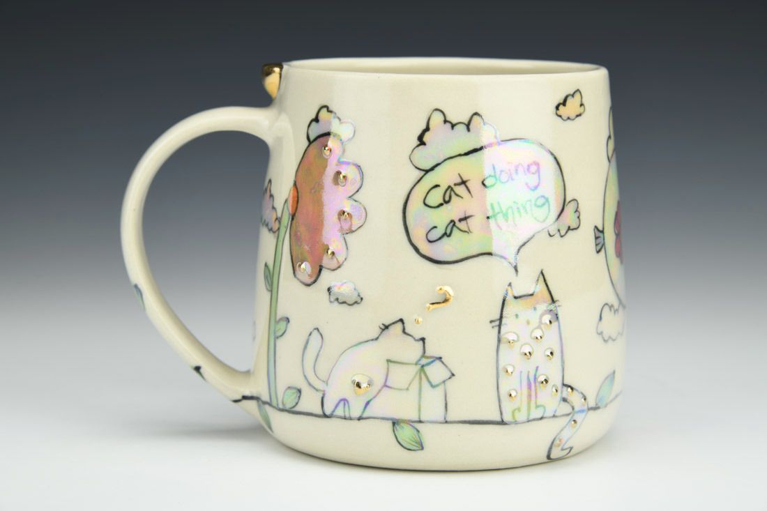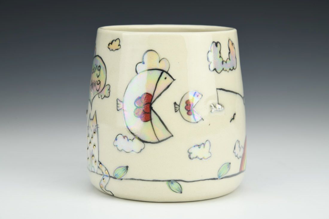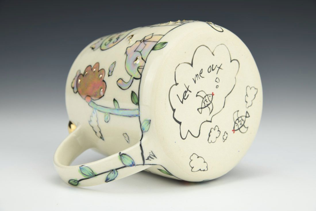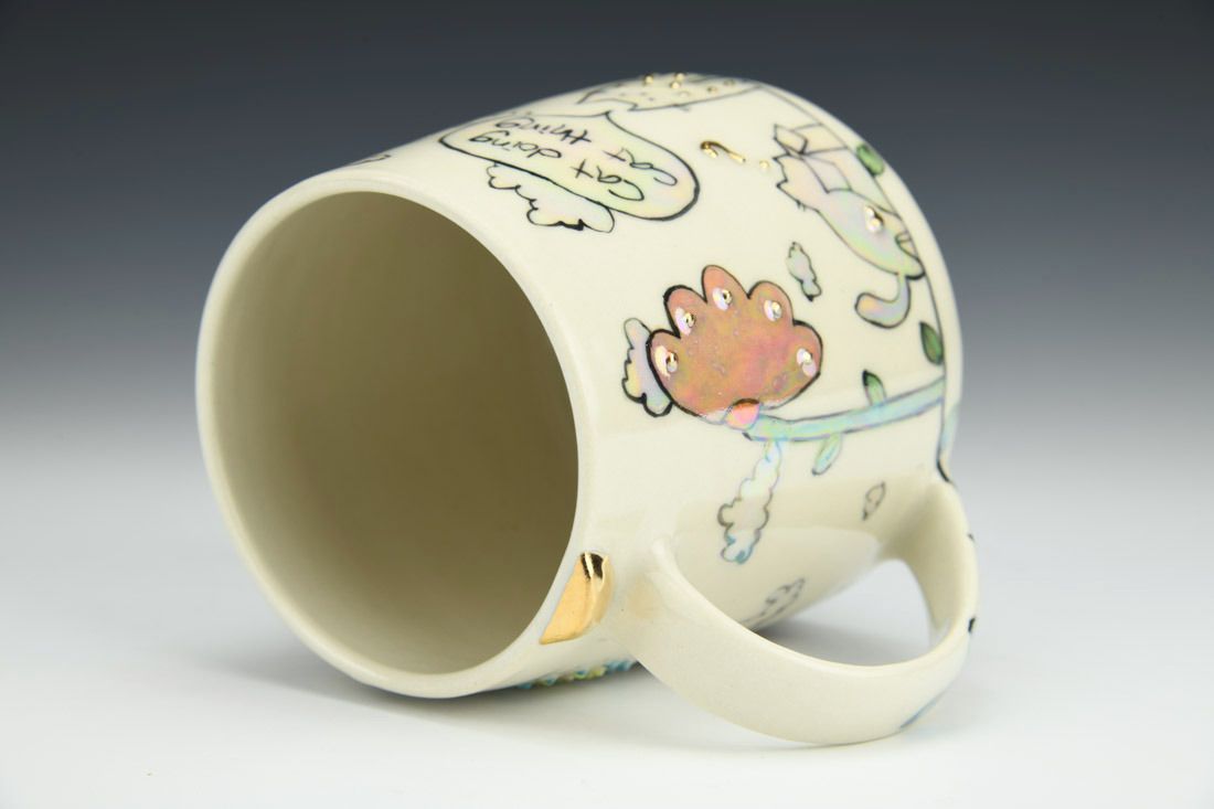Porcelain, wheel thrown, underglaze, glaze, gold luster, mother of pearl luster, cone 6 oxidation fired, 3.75 x 5 x 3.75 inches.