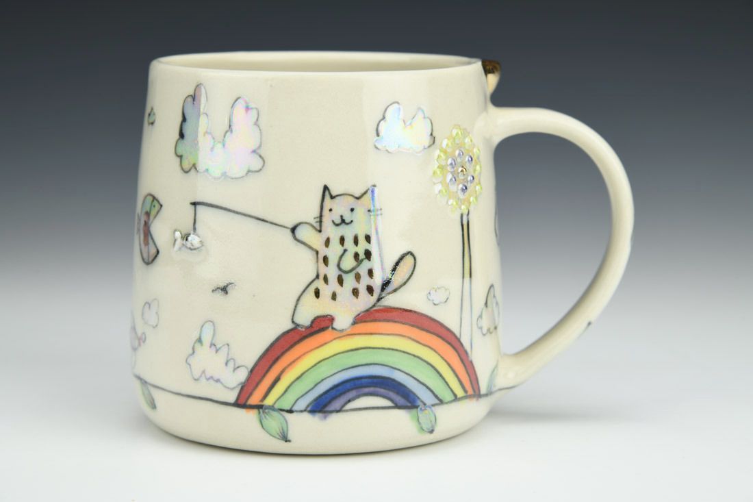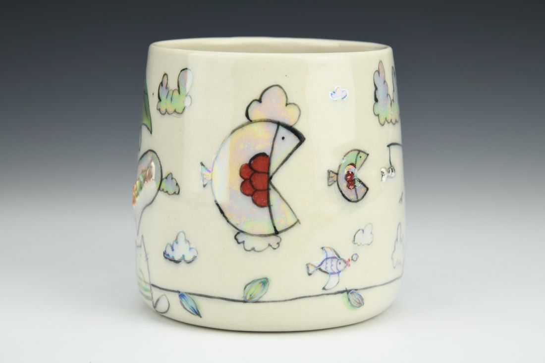 Porcelain, wheel thrown, underglaze, glaze, gold luster, mother of pearl luster, cone 6 oxidation fired, 3.75 x 5 x 3.5 inches.