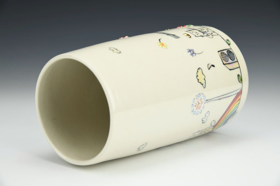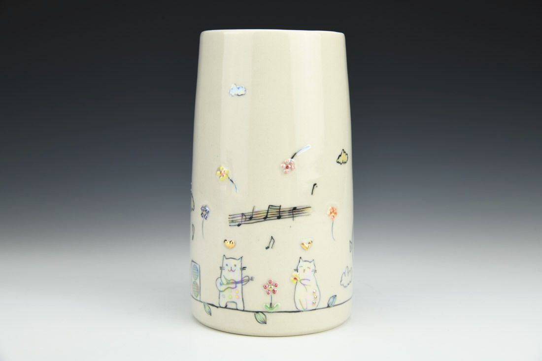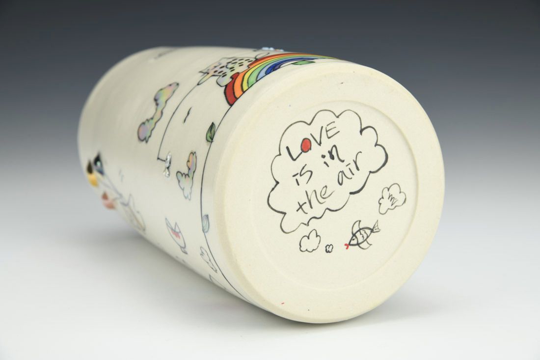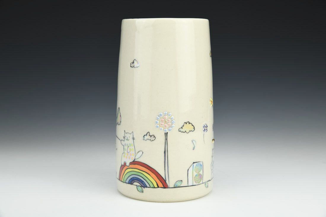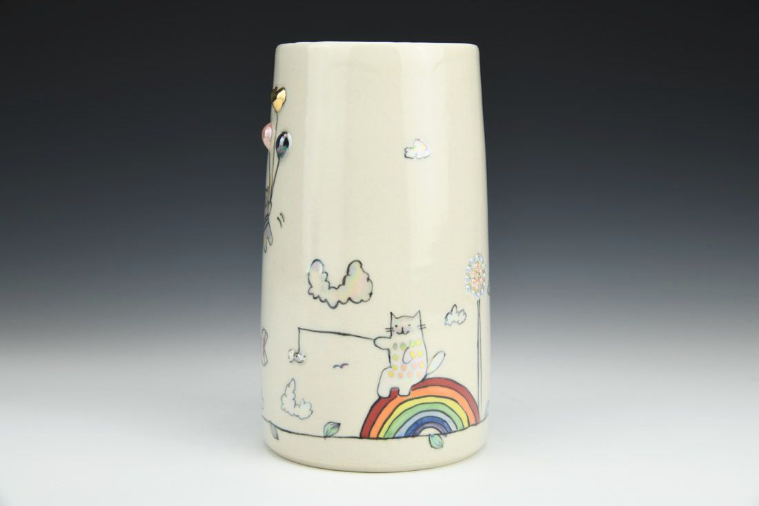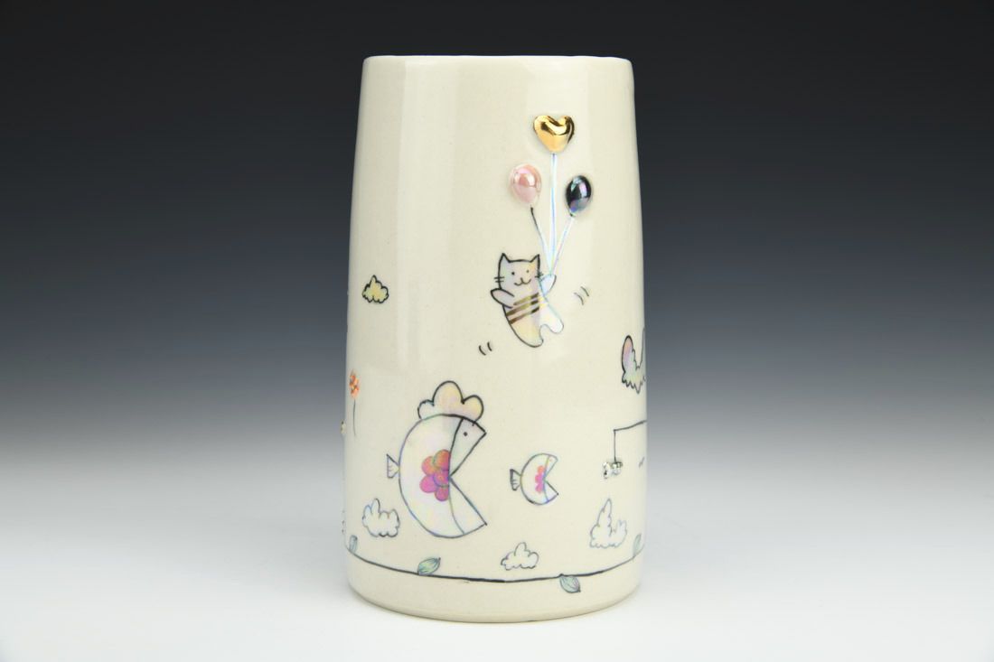 Porcelain, wheel thrown, underglaze, glaze, gold luster, mother of pearl luster, cone 6 oxidation fired, 6.75 x 3.75 x 6.5 inches.